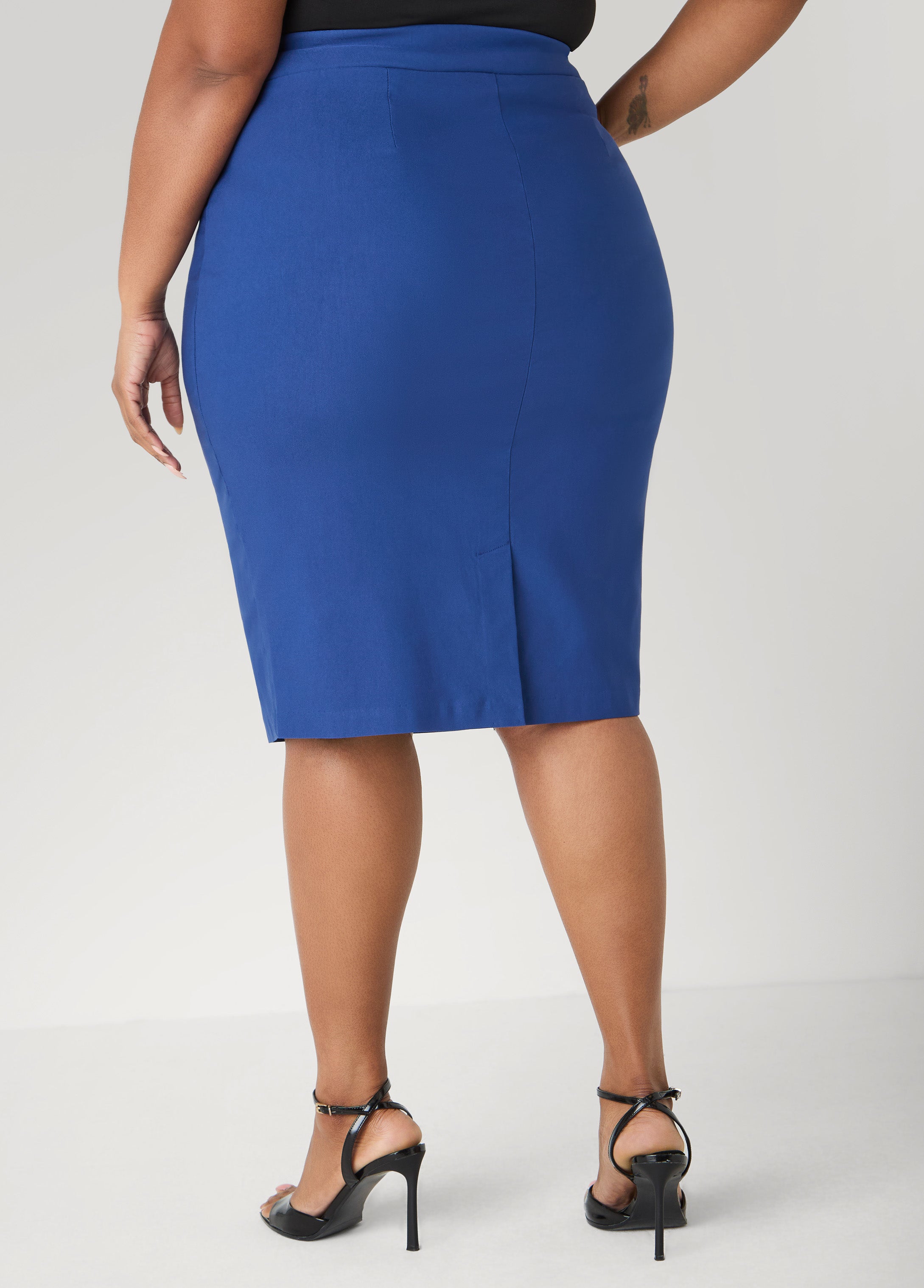 • Millennium stretch-twill pencil skirt with two slant pockets at front, back vent and elasticized waistband. Slip-on style. Front Length: 27in. Back Length: 28in. Can be worn as a two-piece set with matching blazer. Blazer sold separately.