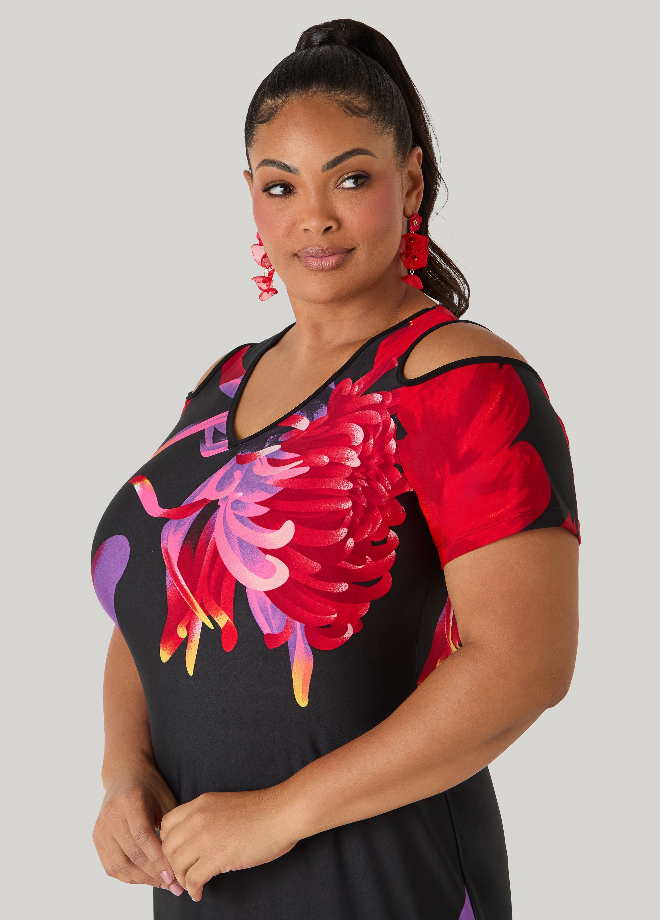 A shoulder-baring cutout is matched with a sweeping maxi length for effortless impact. Designed in a soft knit with an allover floral print, it skims the body while keeping movement easy and fluid.