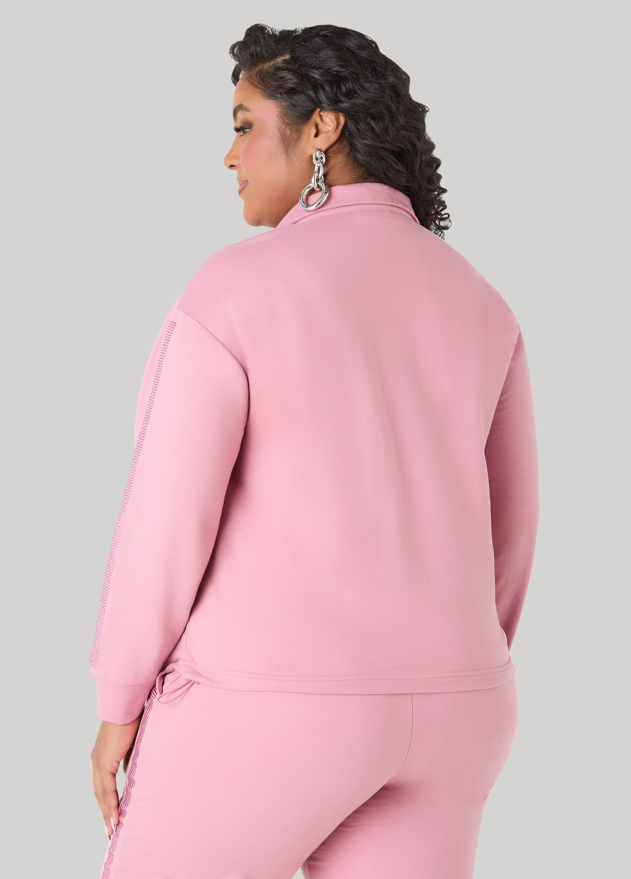 This French terry pullover brings cozy energy with a V-neck, crystal accents and a drawstring hem that lets you shape the fit your way. Soft, easy to throw on and ready to pair with the matching joggers for a set that's easy to love & look lovely.