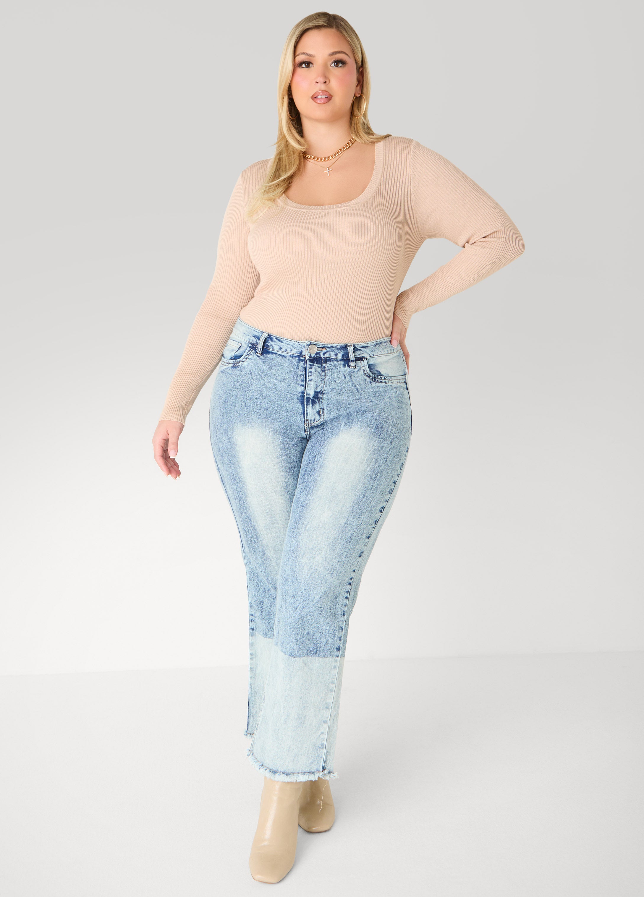 Totally rad from waist to hem. These two-tone acid wash jeans bring that throwback magic with a bootcut and fringe trims.