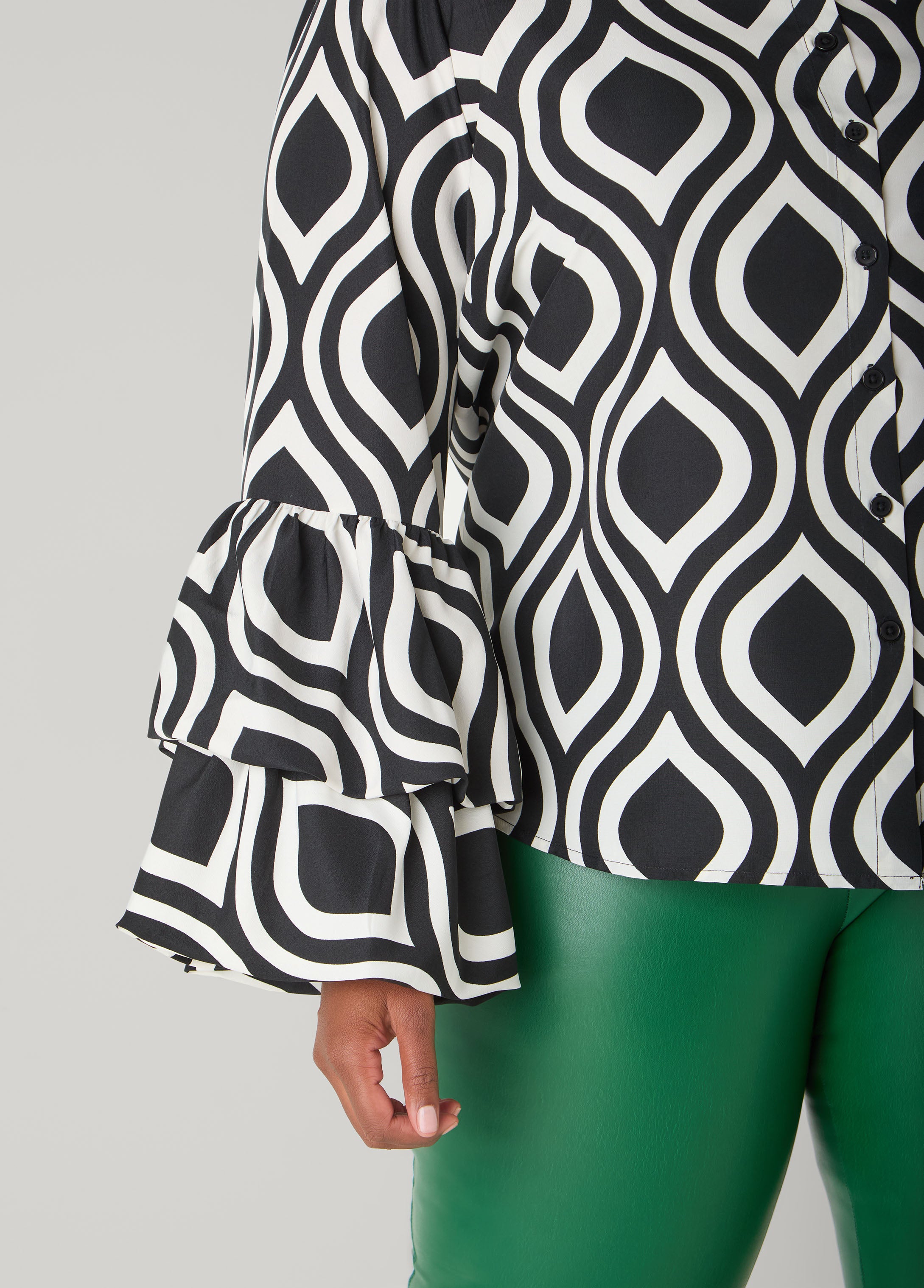 This geo print blouse plays with proportions, letting tiered sleeves ripple as elasticized cuffs hold the look together.