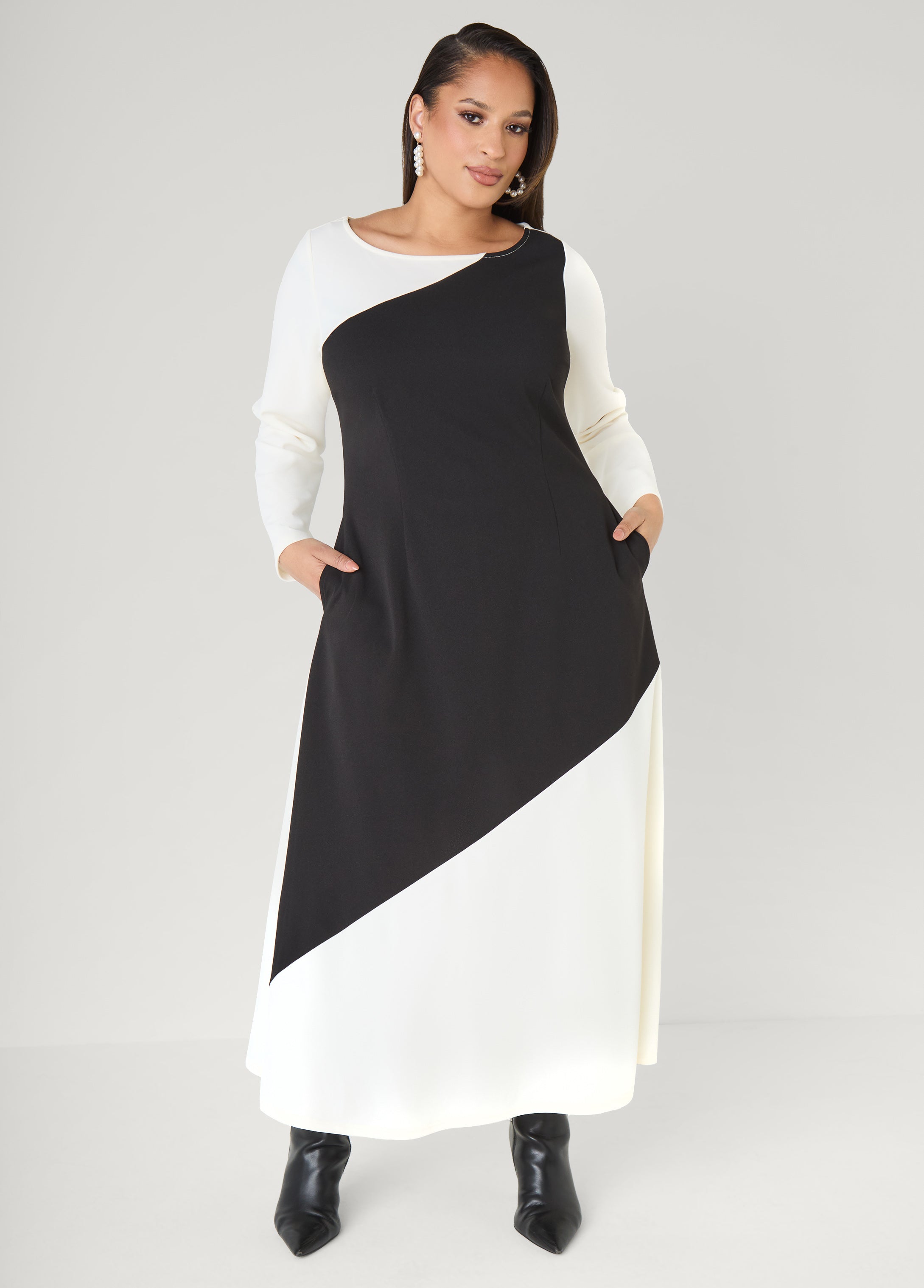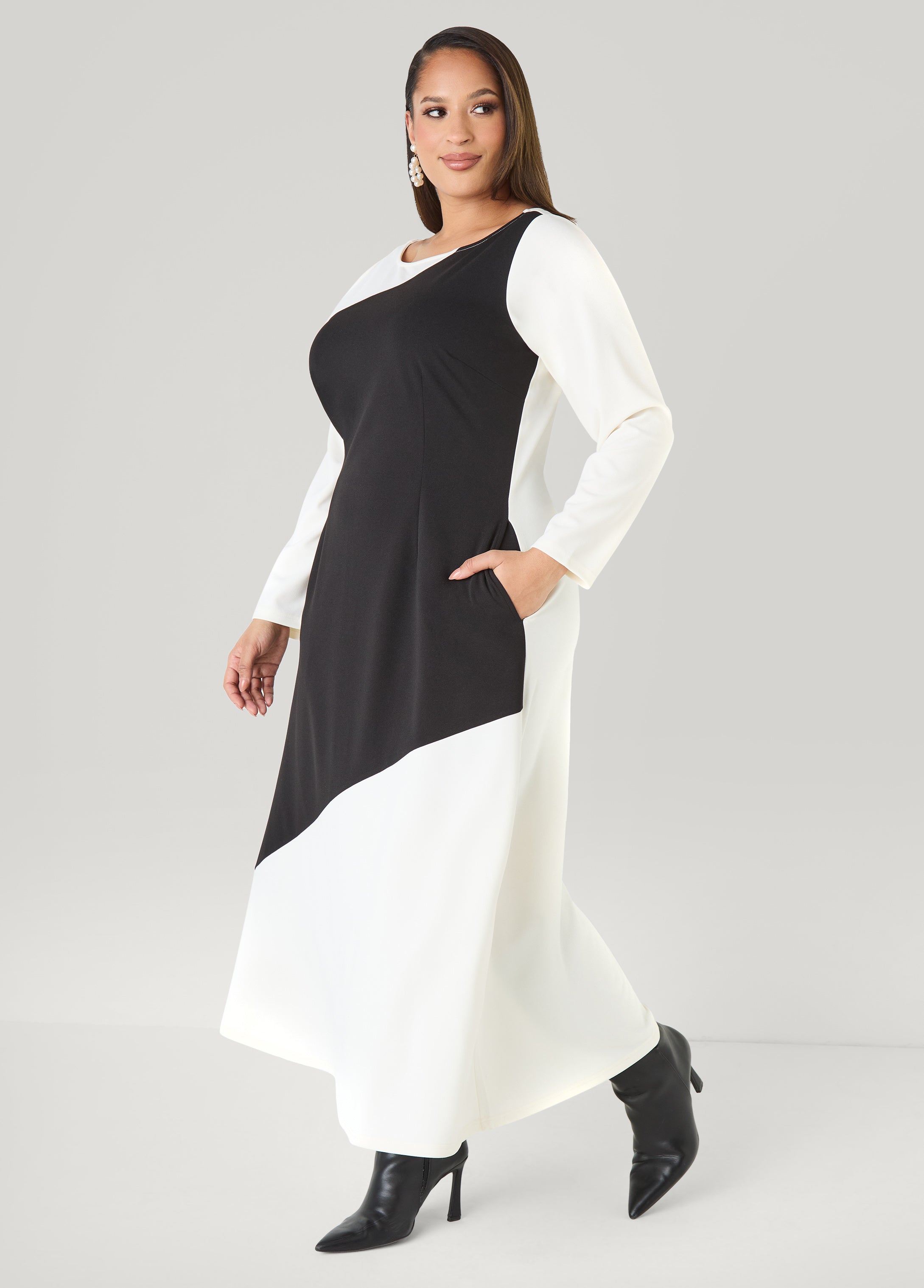 Classic white is struck by a bold blast of black on our maxi dress balancing contrast with flow. The A-line skirt moves gently, paired with slit pockets at the sides for everyday wear.