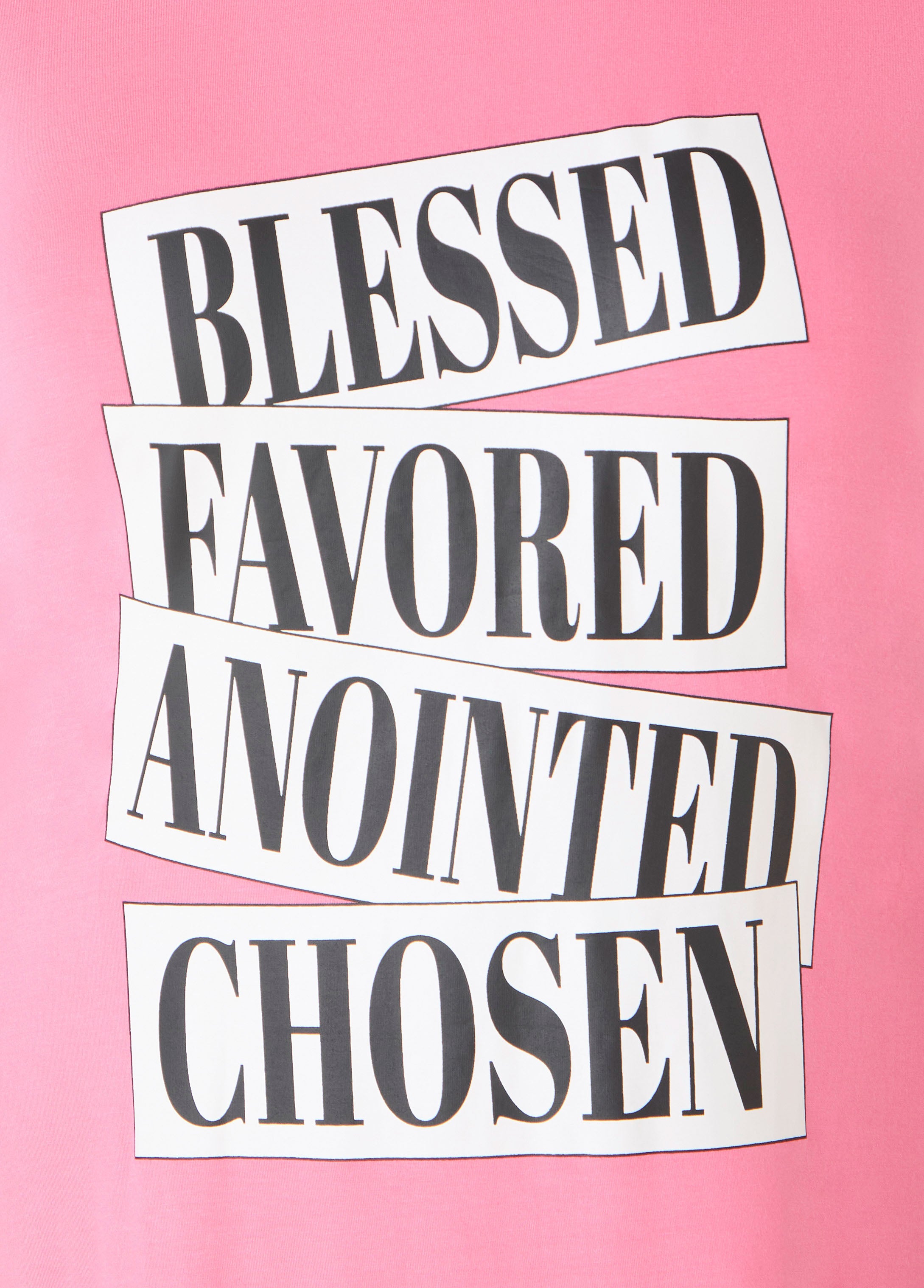 Soft stretchy knit, easy t-shirt shape and a message that says it all: “Blessed, Favored, Anointed, Chosen.” Go ahead, wear it like you mean it.