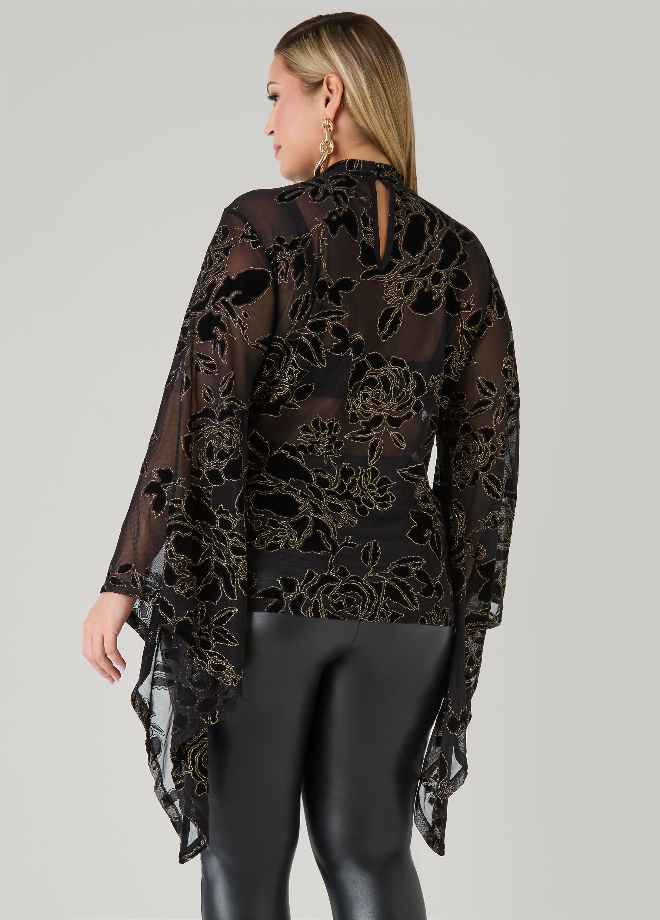 Leave them speechless wearing our sheer mesh top layered with floral burnout velvet trimmed in gold threading.