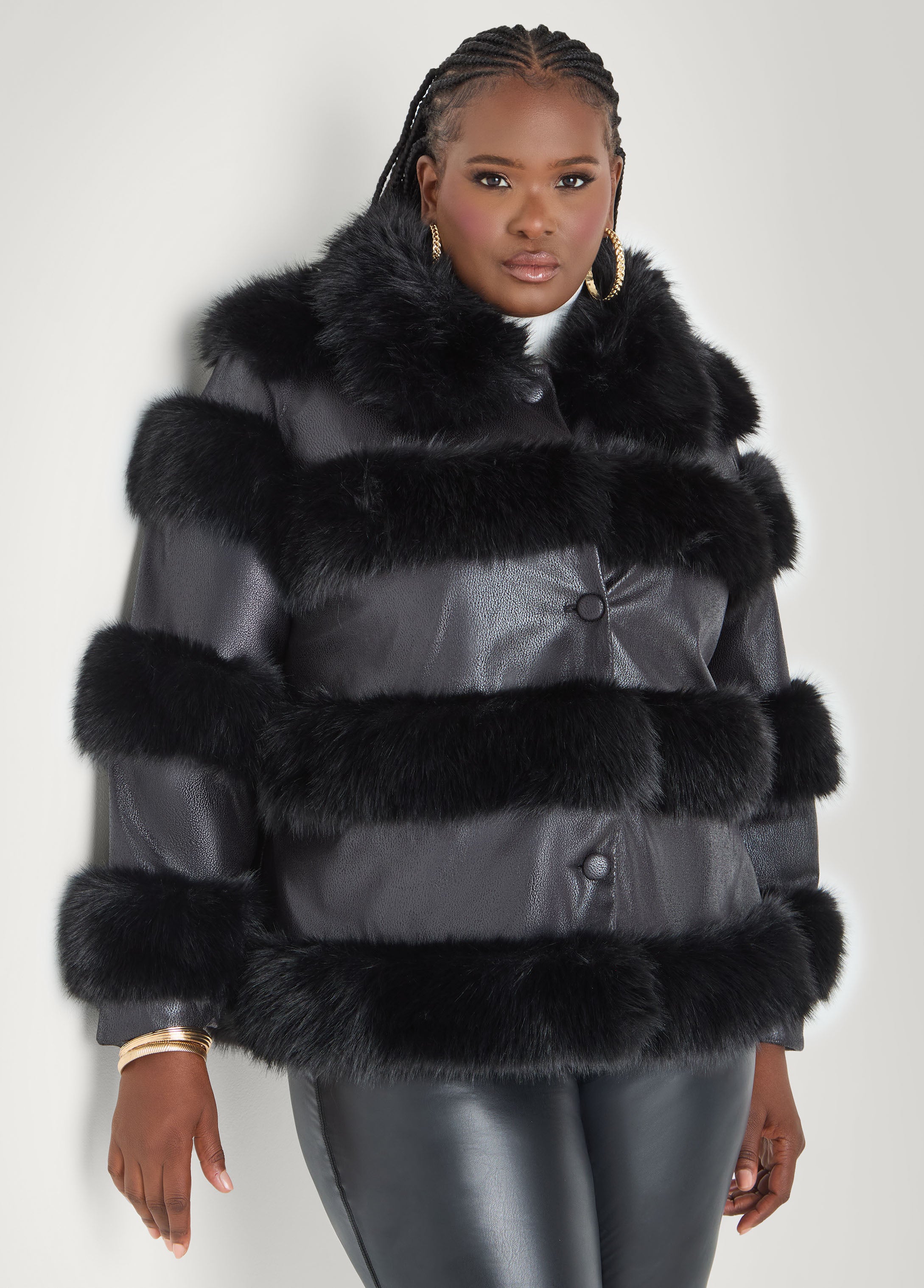 This coat is a study in texture. Plush faux fur meets structured faux leather in a paneled design that redefines winter layers with a sleek, sculptural edge.