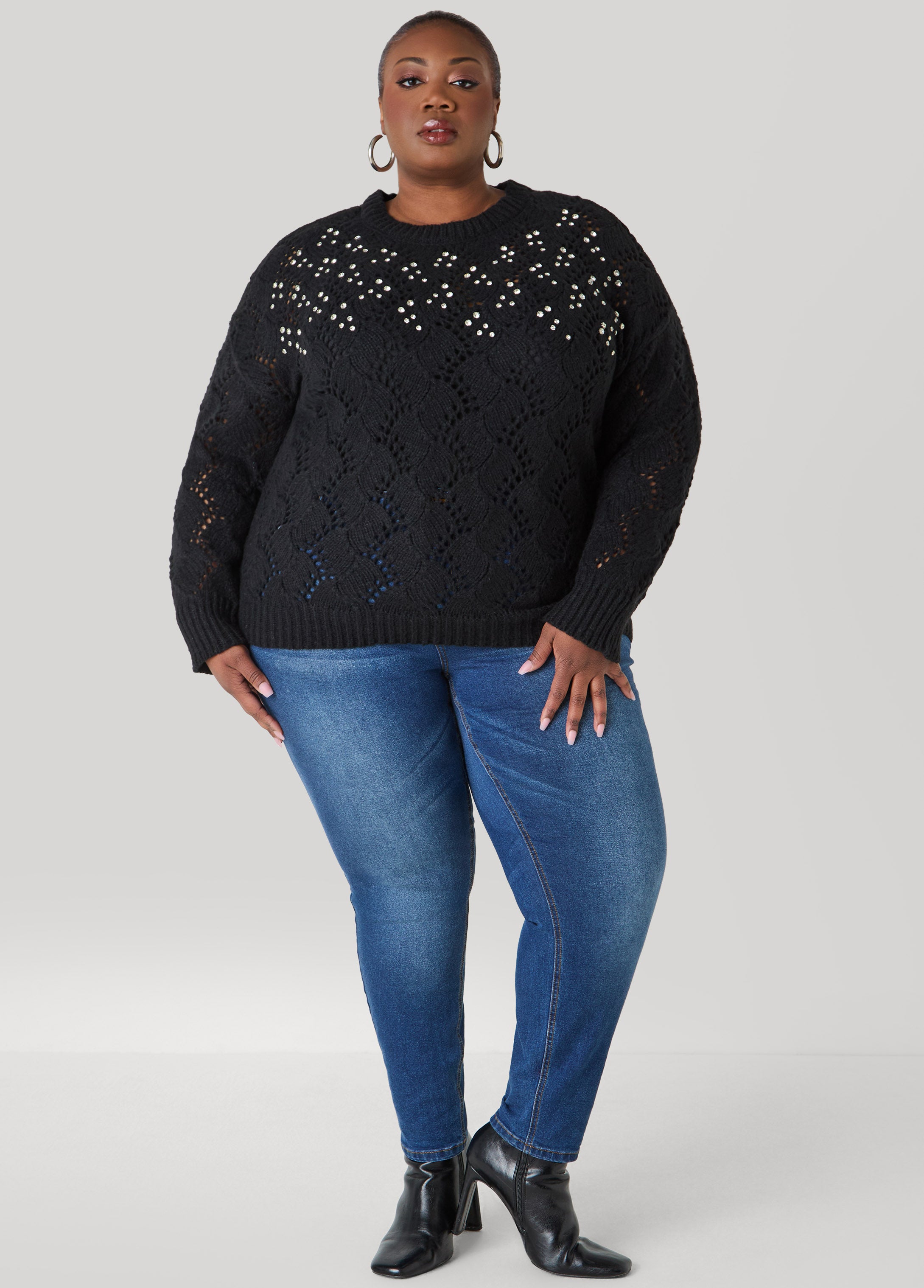 Soft pointelle knit sets the stage as crystal accents trace the pattern for a look that stays sweet with a little glow.