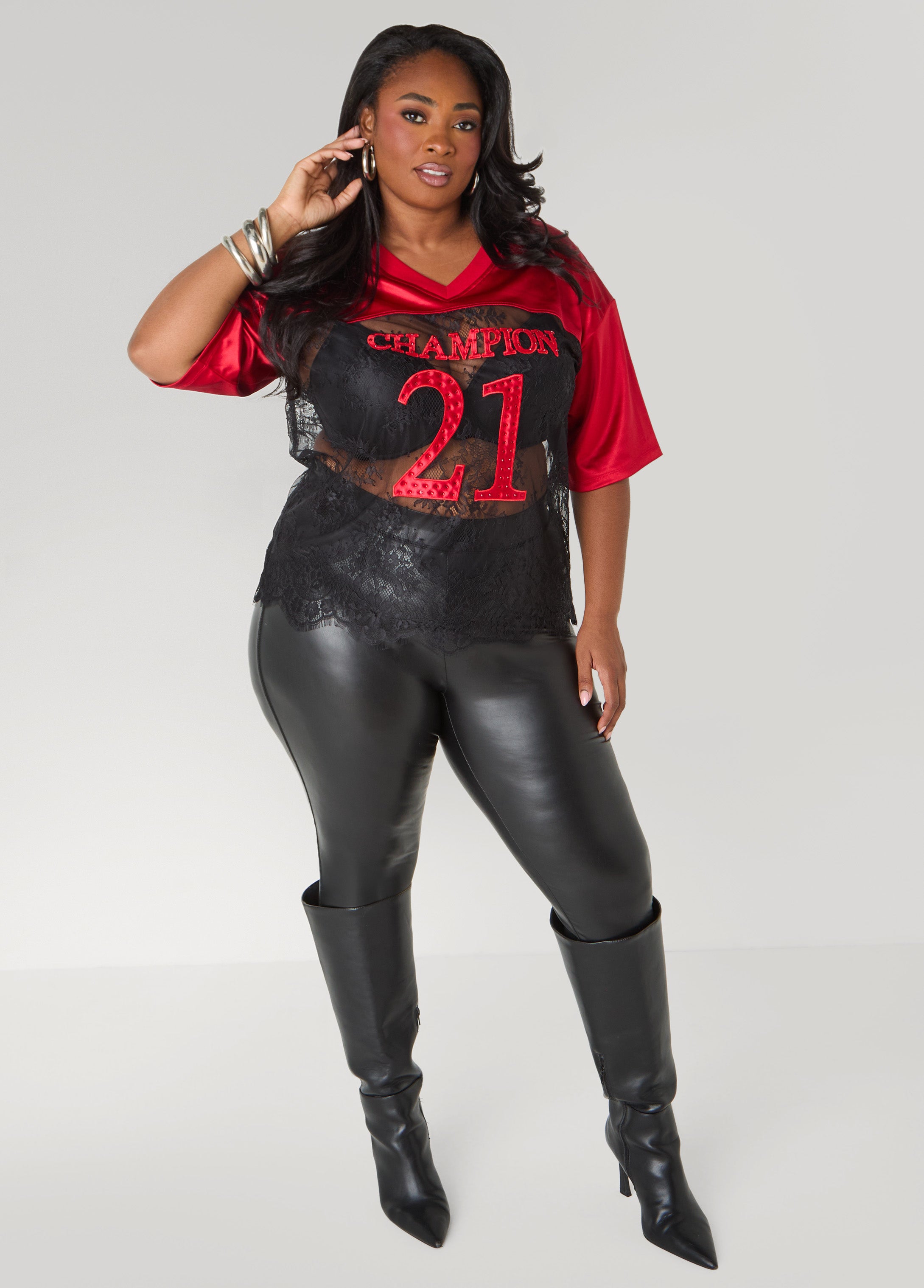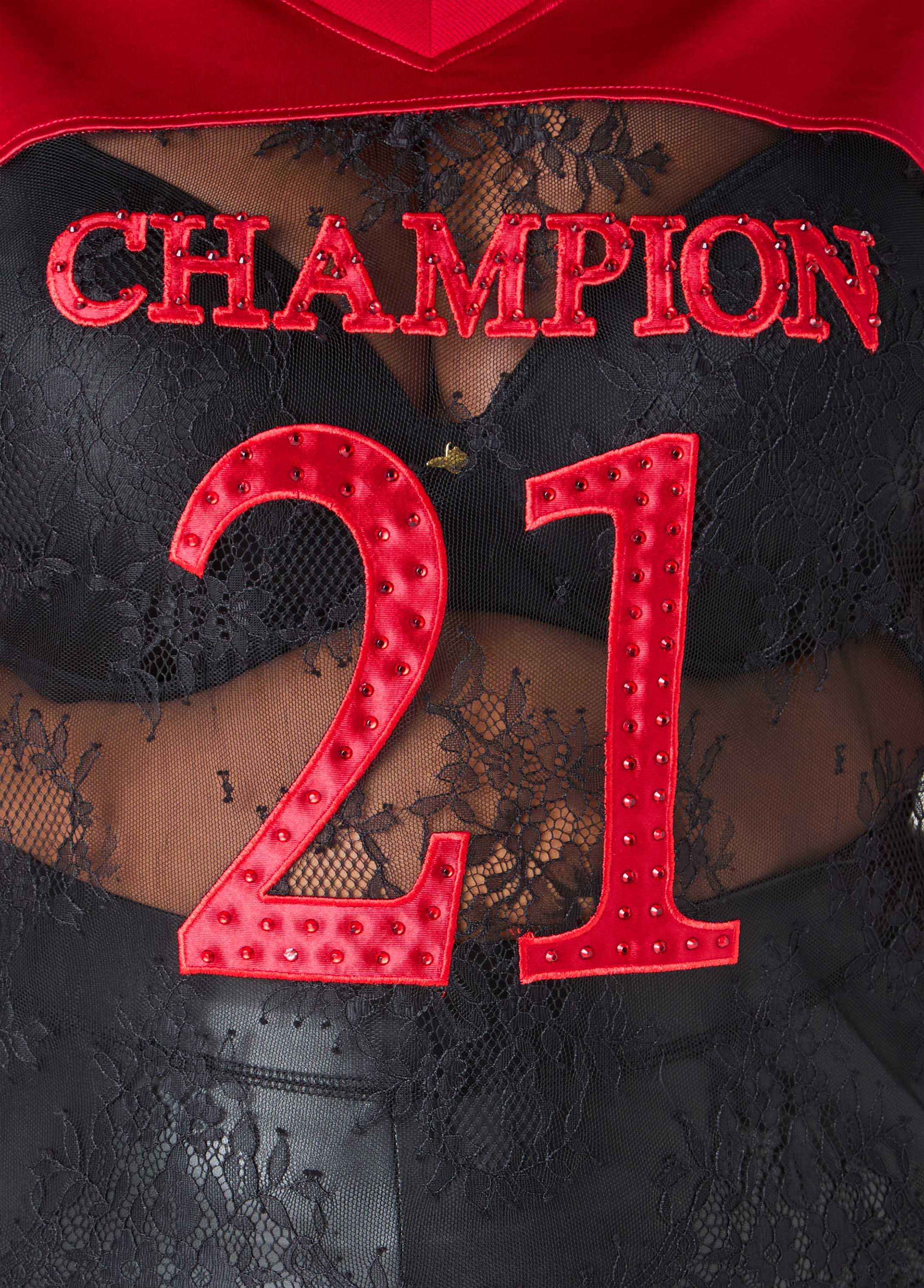 Game on. This jersey scores major style points with lace panels and crystal “Champion 21” patches that bring the glam to the game.
