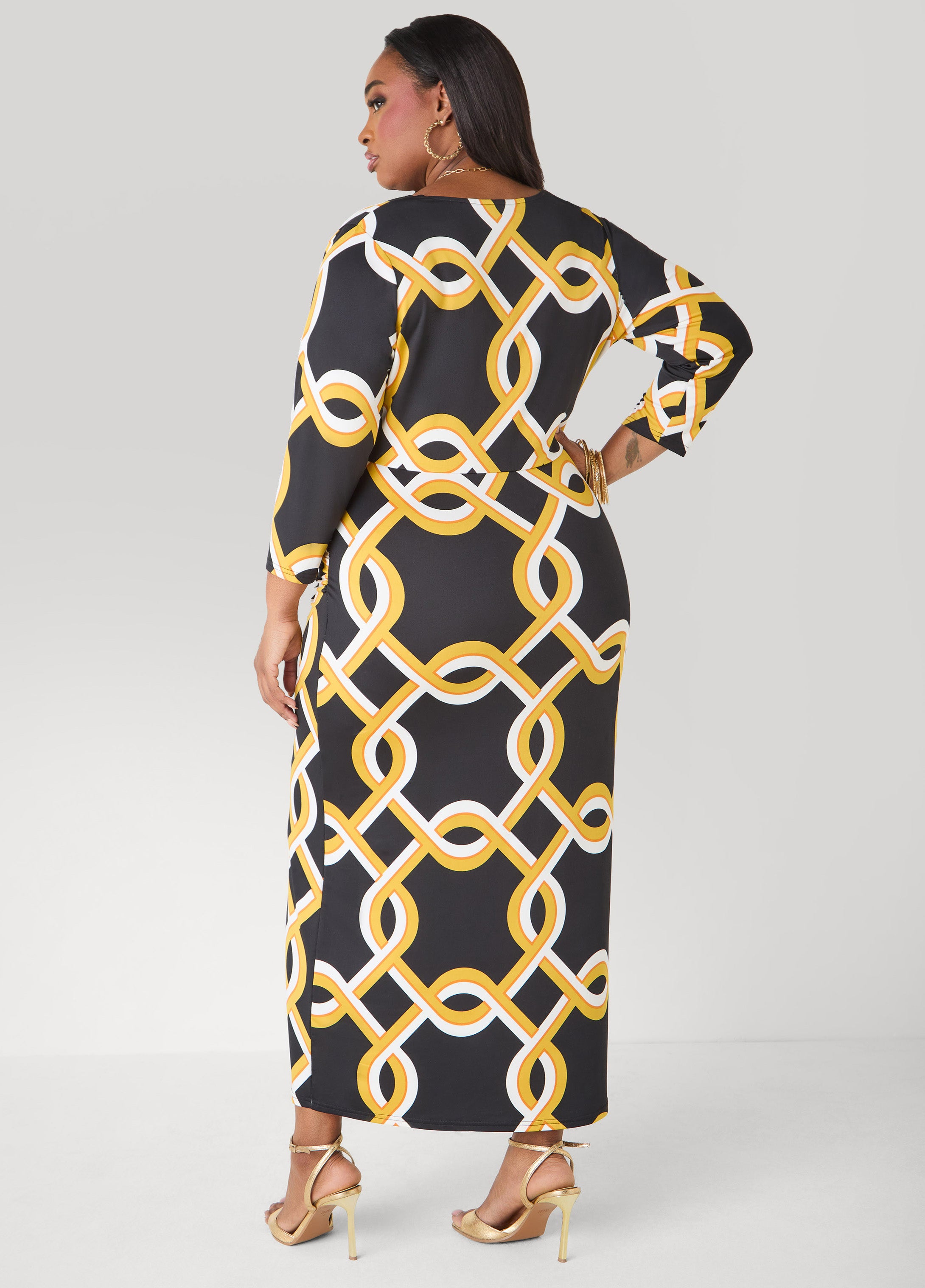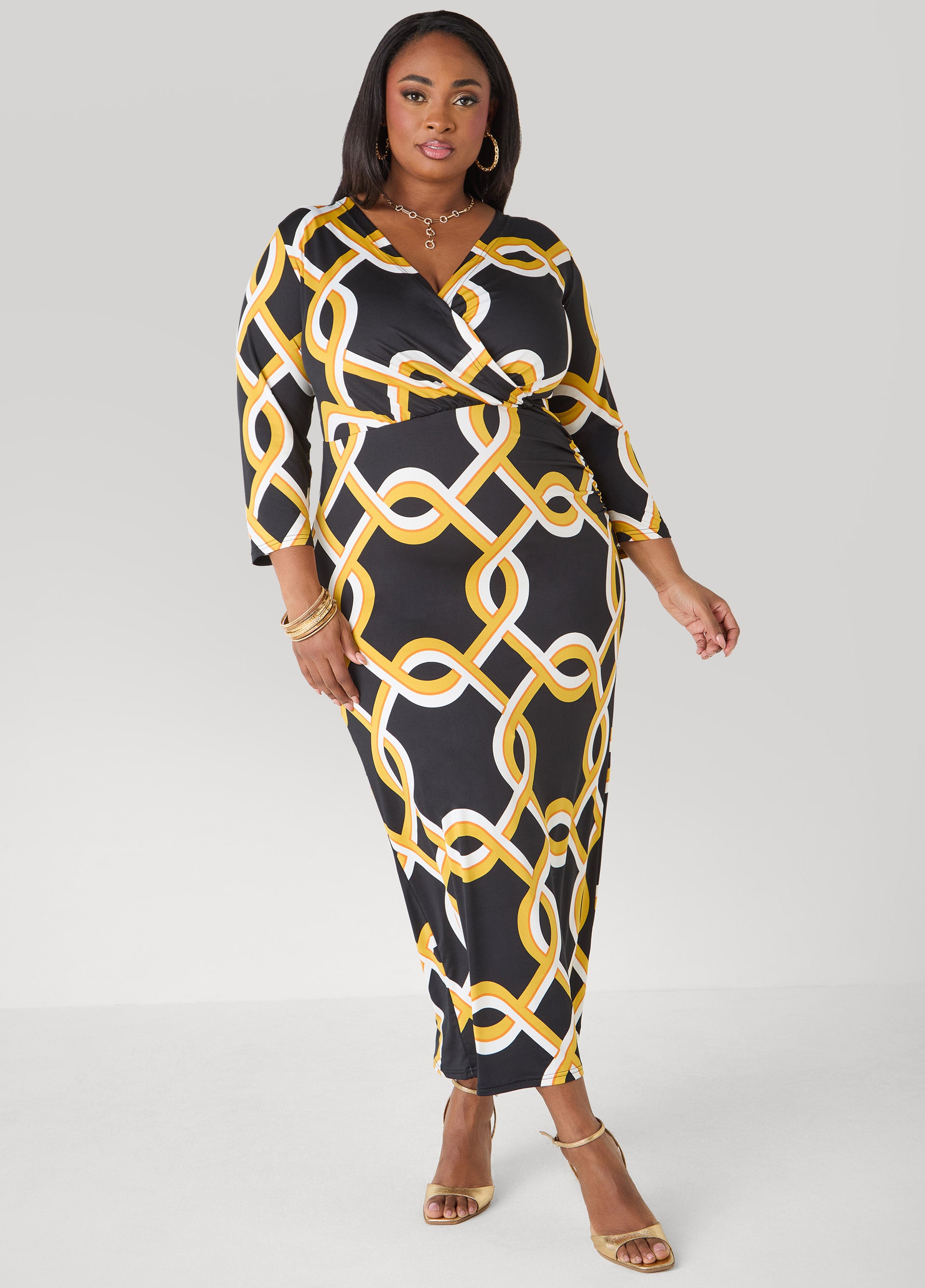 The chain link print gives this stretch-knit maxi dress instant energy. A faux wrap frames the upper body with side ruching sculpts the waist and adds subtle sexiness to the silhouette.