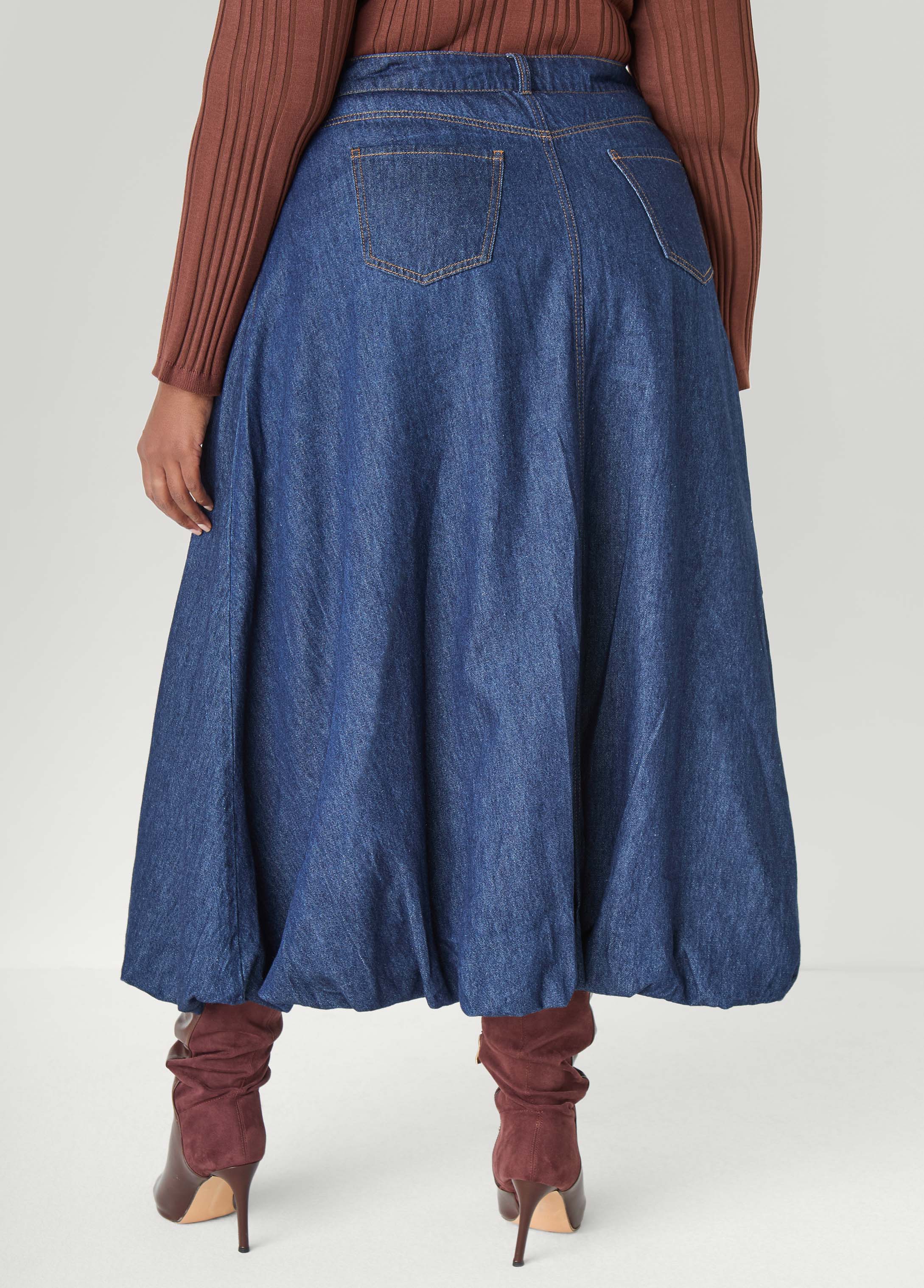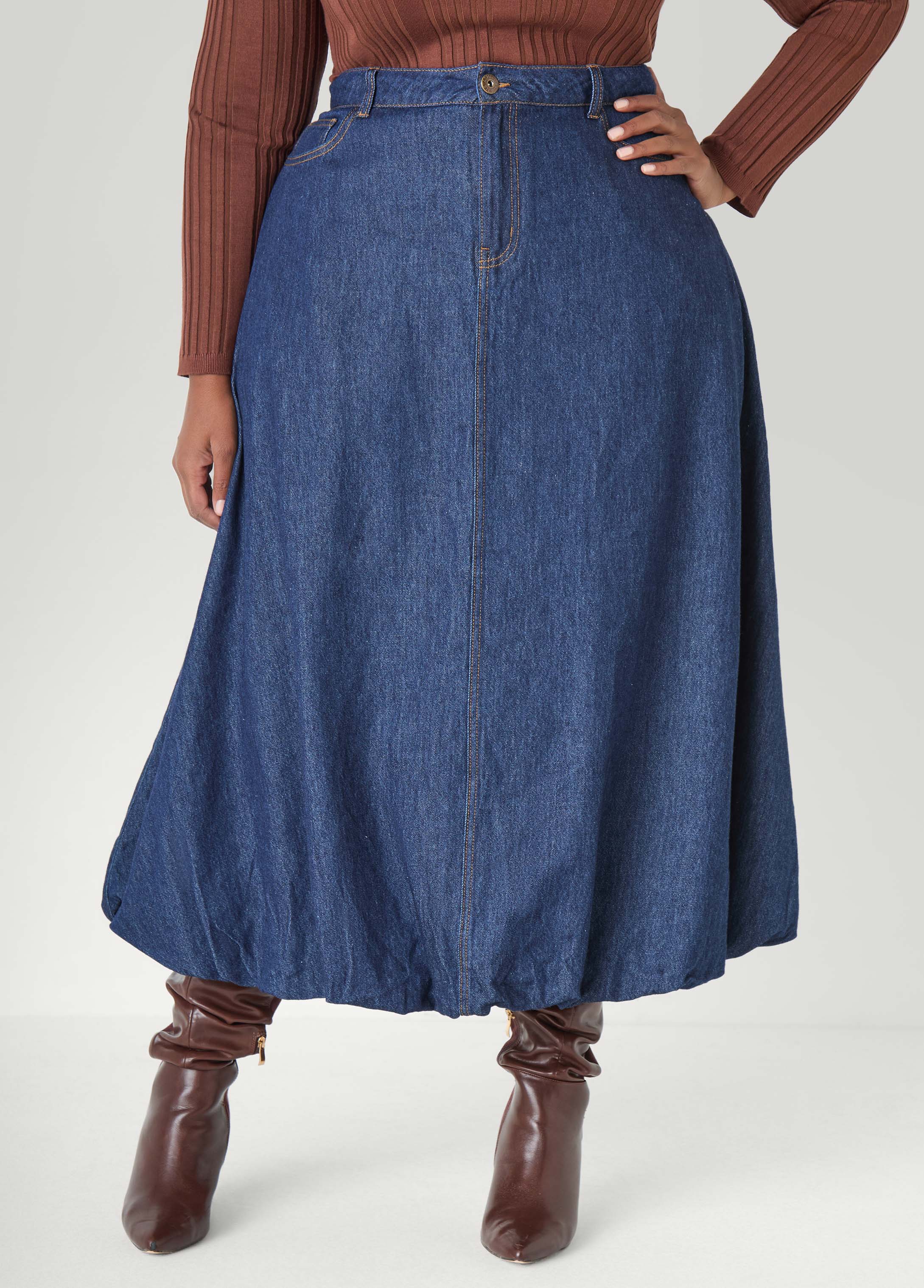 Step out of your bubble & into something new with our denim maxi with a trendy bubble shape that makes jean skirts fun again.