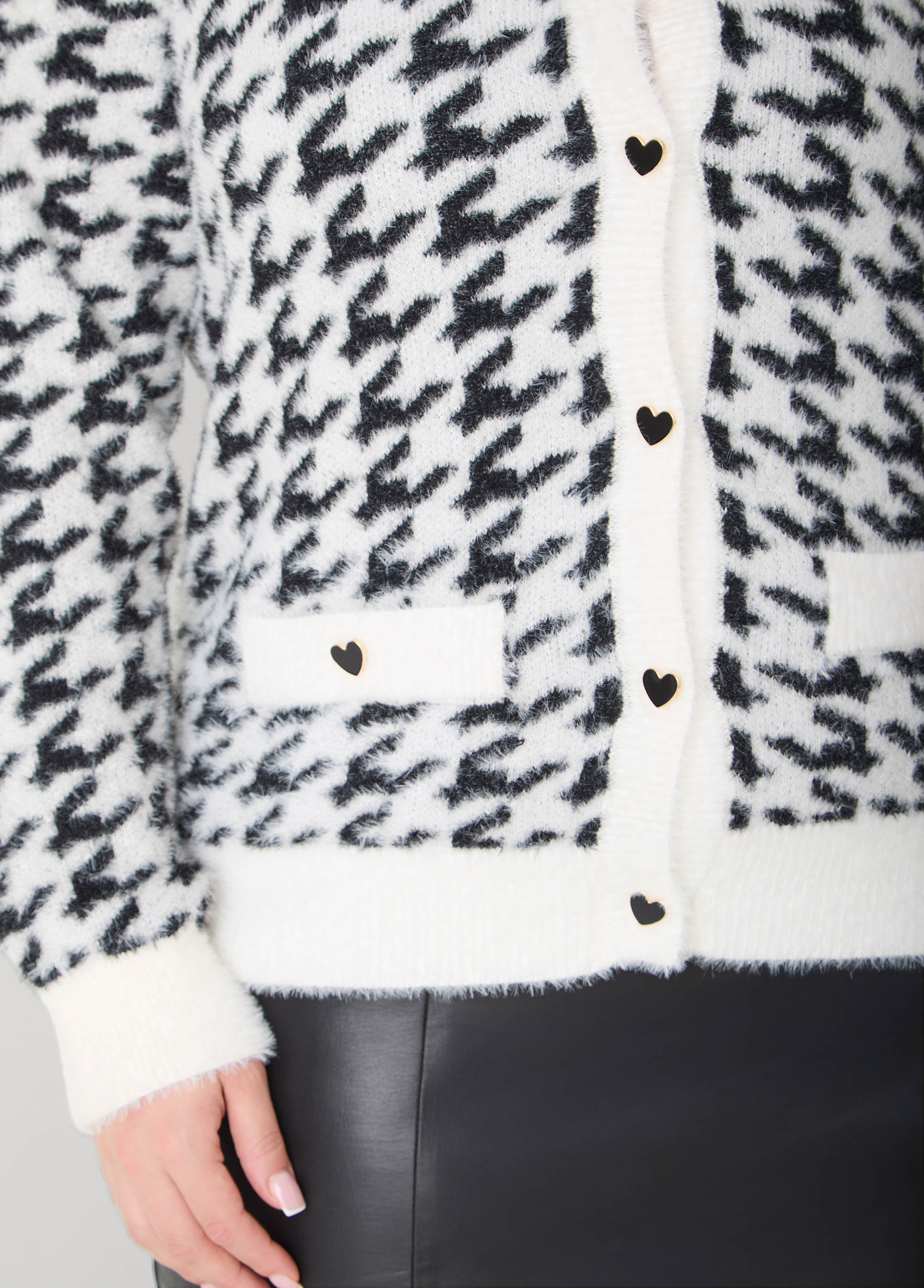 Major heart eyes for this brushed houndstooth cardigan. Soft knit, poppy pattern, and those heart buttons? Total crush material.