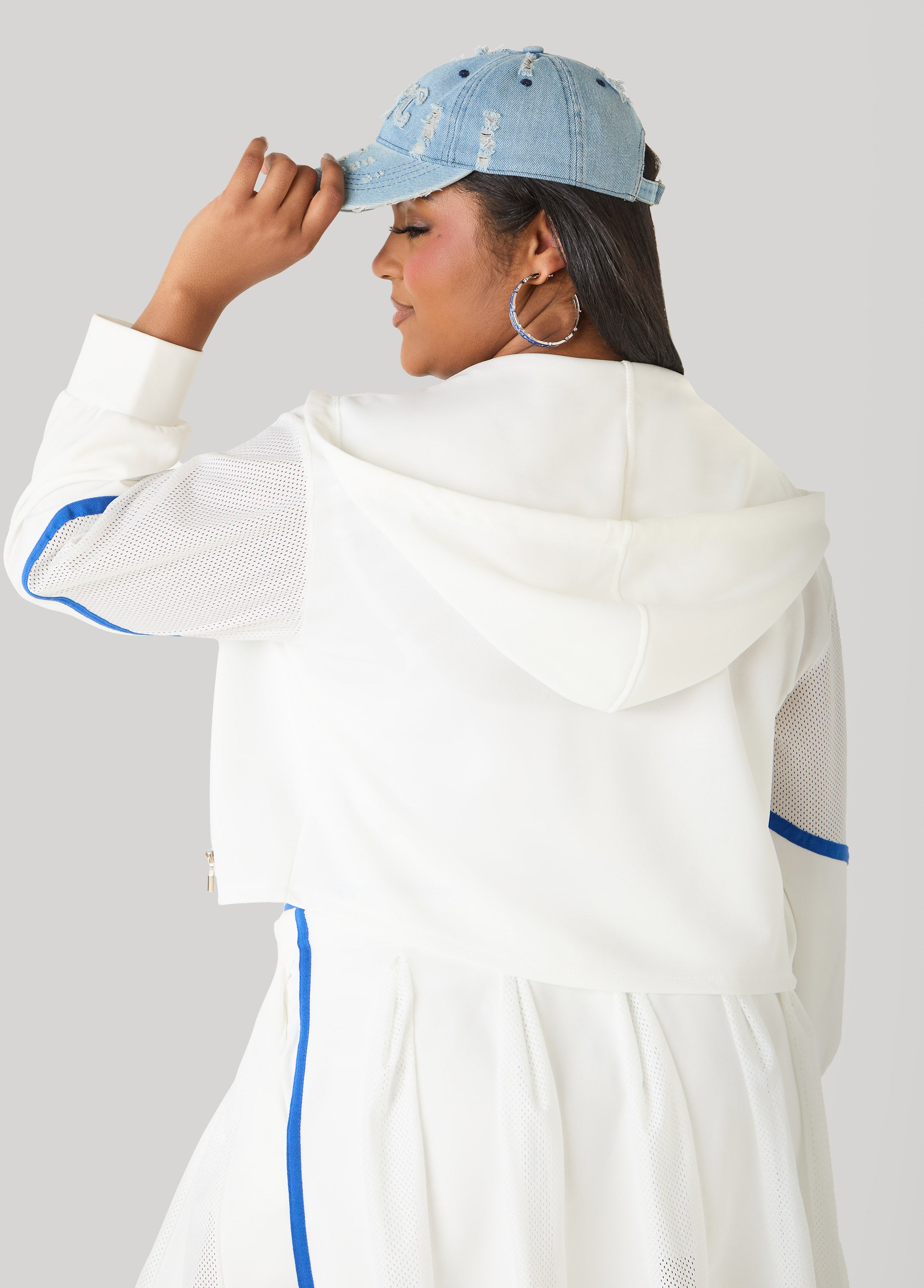 Sporty, trendy & a little bit extra, this cropped jacket keeps things cute with mesh panels and crisp blue piping. The drawstring hood adds that off-duty feel and it is a genius pairing with the matching skort.