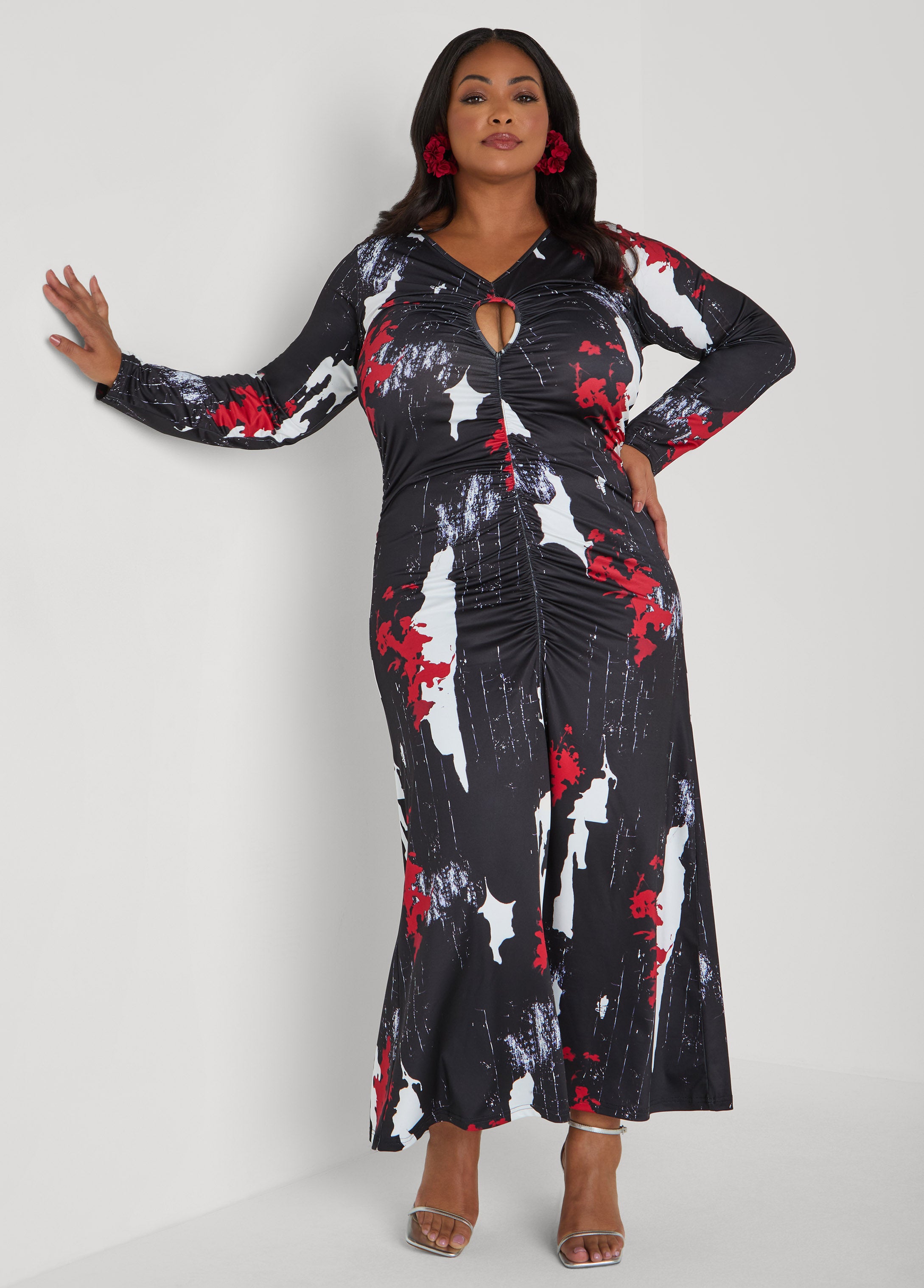 • Abstract print stretch-knit maxi bodycon dress with V-neckline, cutout at bust and ruched detail along bodice. Slip-on style. Regular Length: 53in. Tall Length: 56in. Available regular and tall lengths.