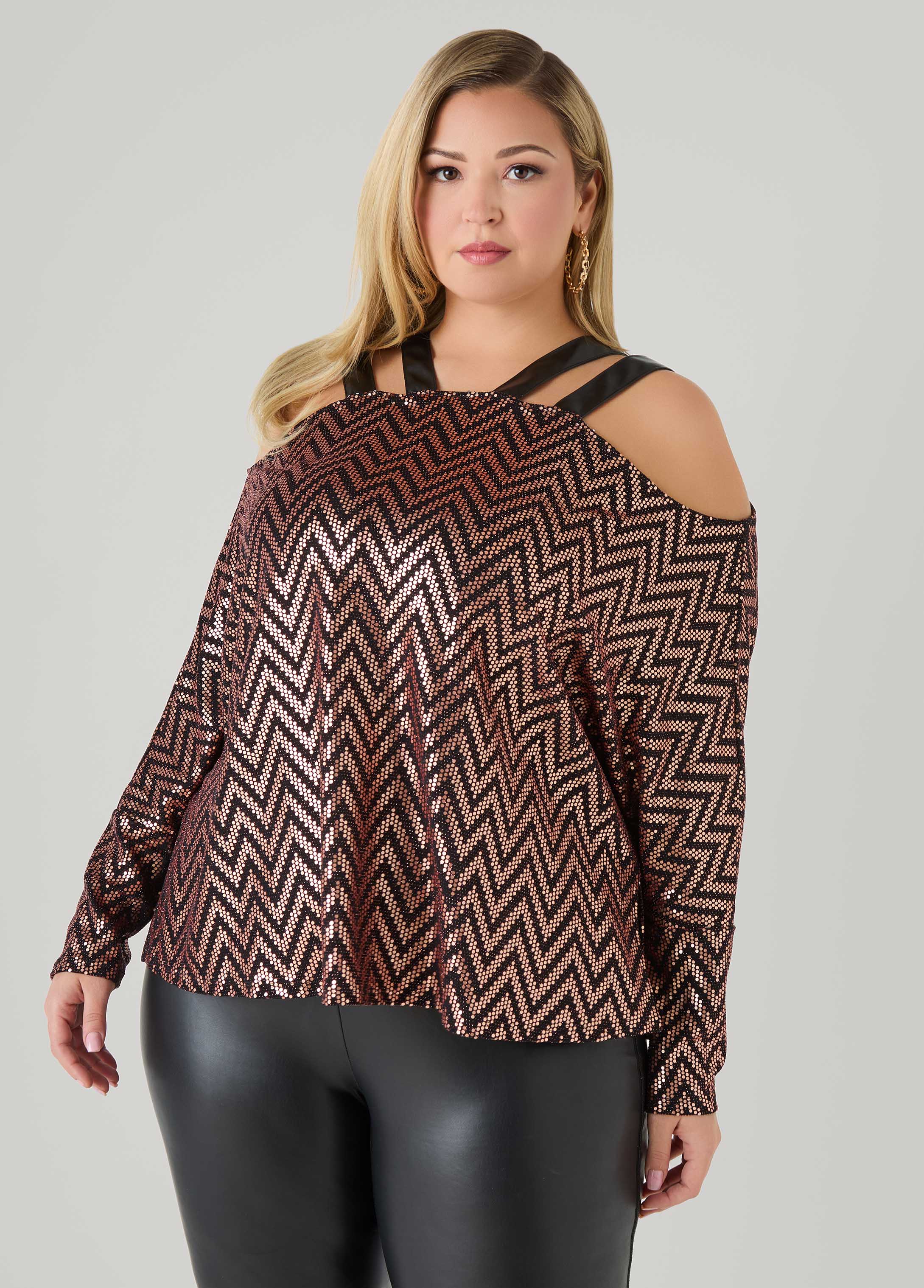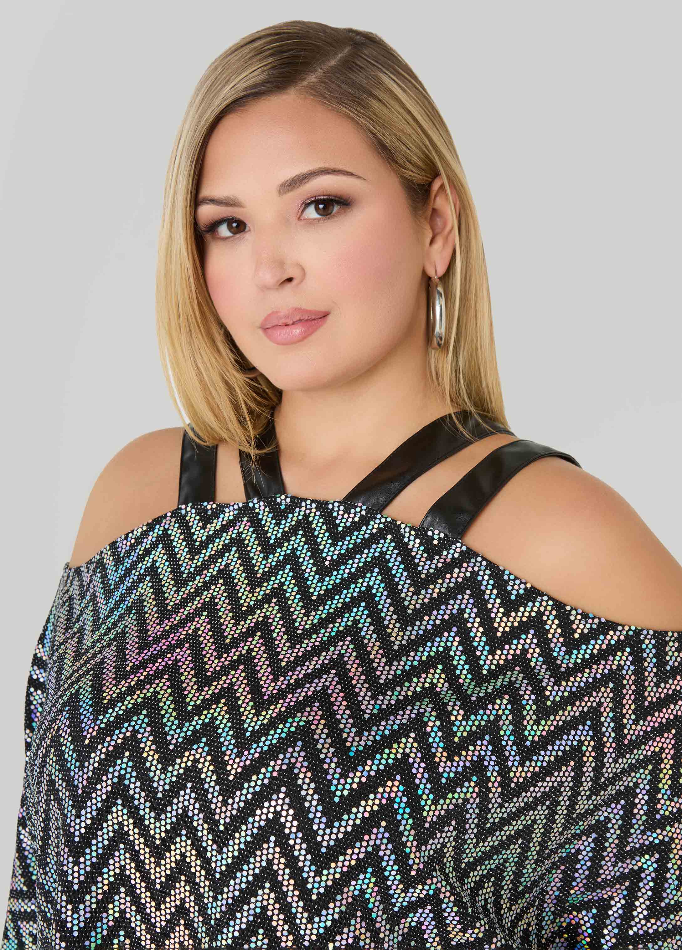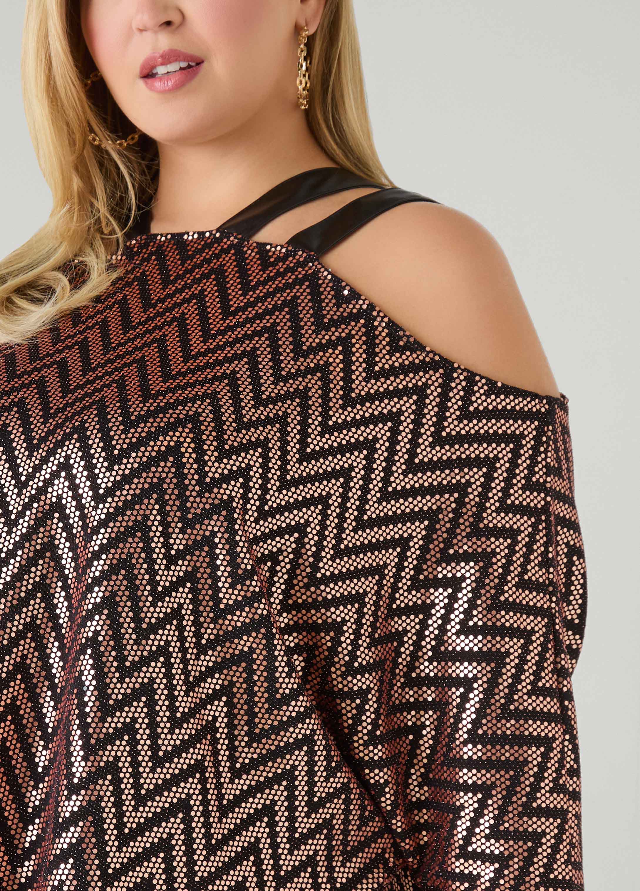 You're too hot to handle in our cold-shoulder top! Party from night to day (and night again!) in this knit top glittered with metallic threading and petite sequins in zigzag patterns. Cage-inspired faux leather straps add the sprinkle of bonus baddie to the equation.