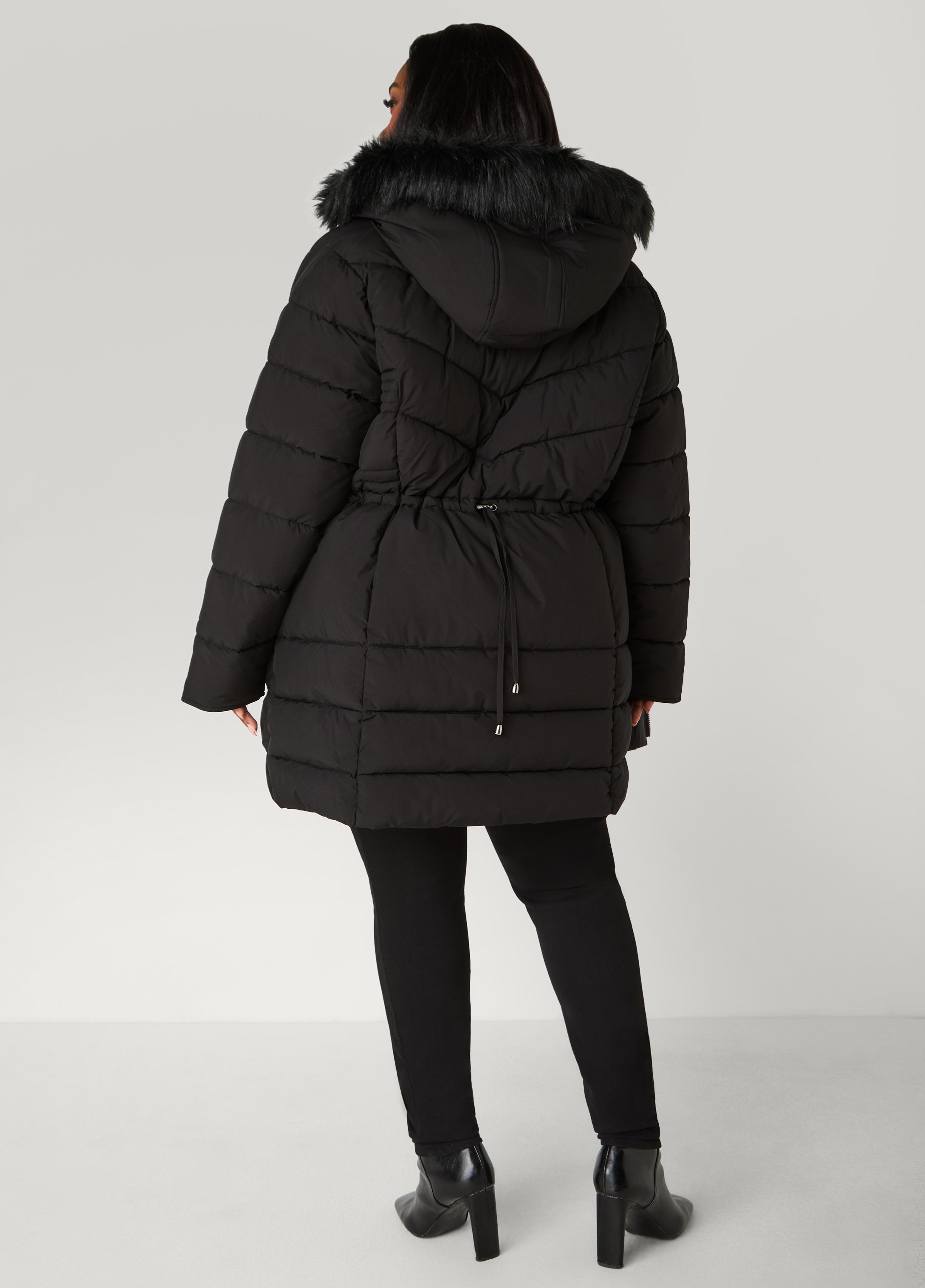 This quilted puffer coat features a faux fur-trimmed hood that frames your face, faux leather accents for a bit of chic, a drawstring waist to shape the silhouette and welt pockets at the sides for practicality.
