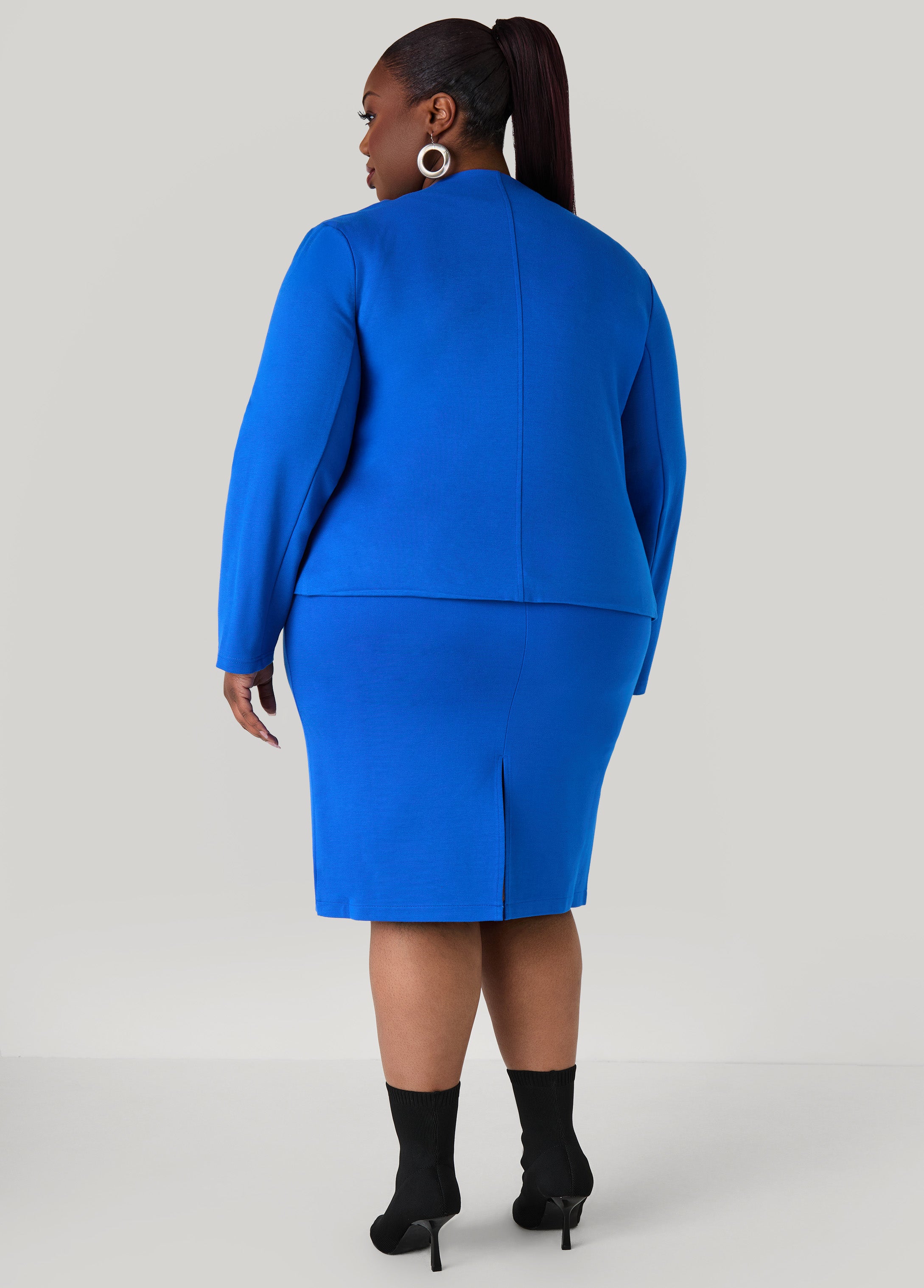 • Ponte jacket with ribbed faux leather panels. Fully lined in stretch-knit. Open front. Front Length: 24.5in. Back Length: 24in. Can be worn as a two-piece set with matching skirt or leggings. Skirt or leggings sold separately.