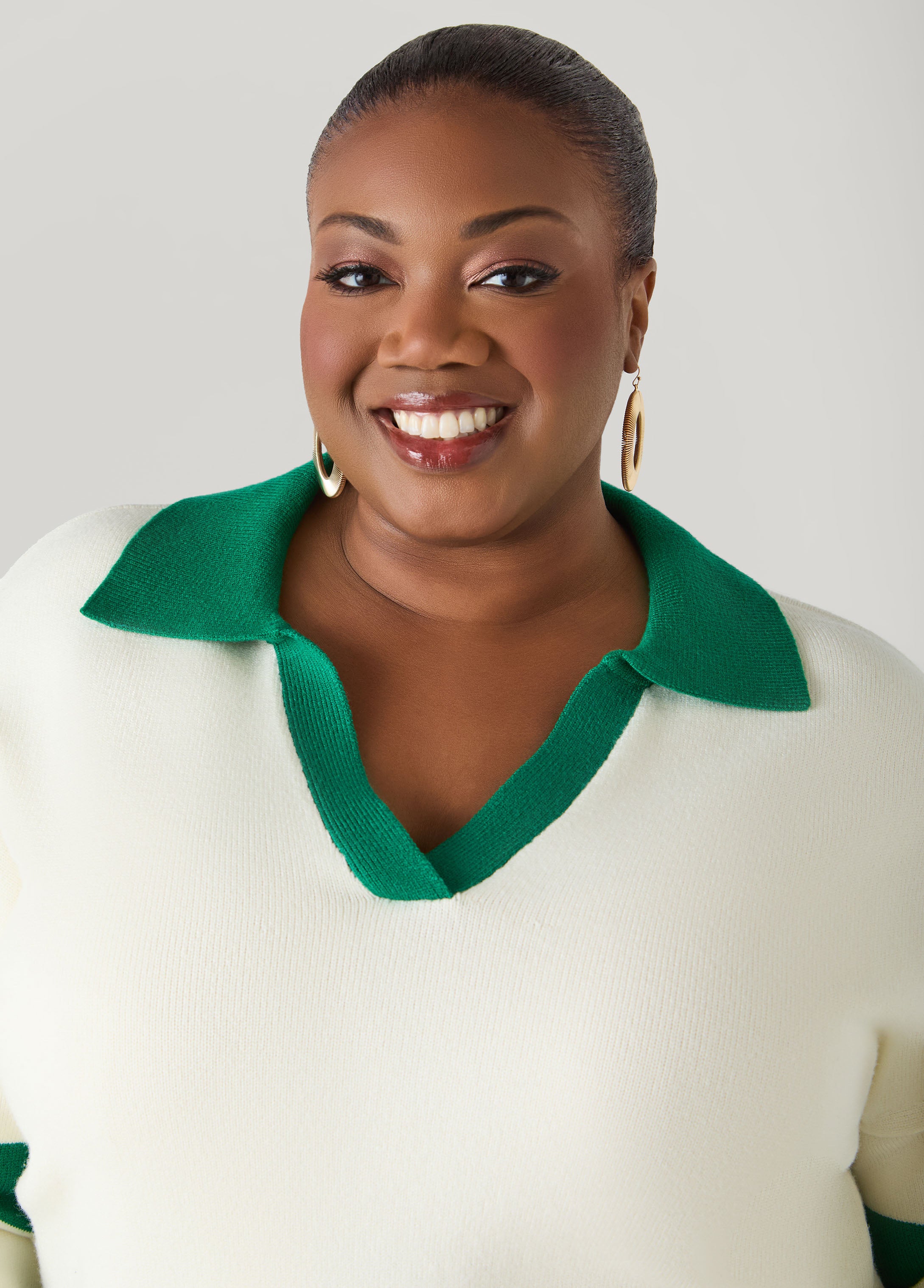 Classic rugby style updated in soft intarsia knit with bold stripes and a relaxed V-neck for a quiet luxury aesthetic when worn with denim or tailored pants.