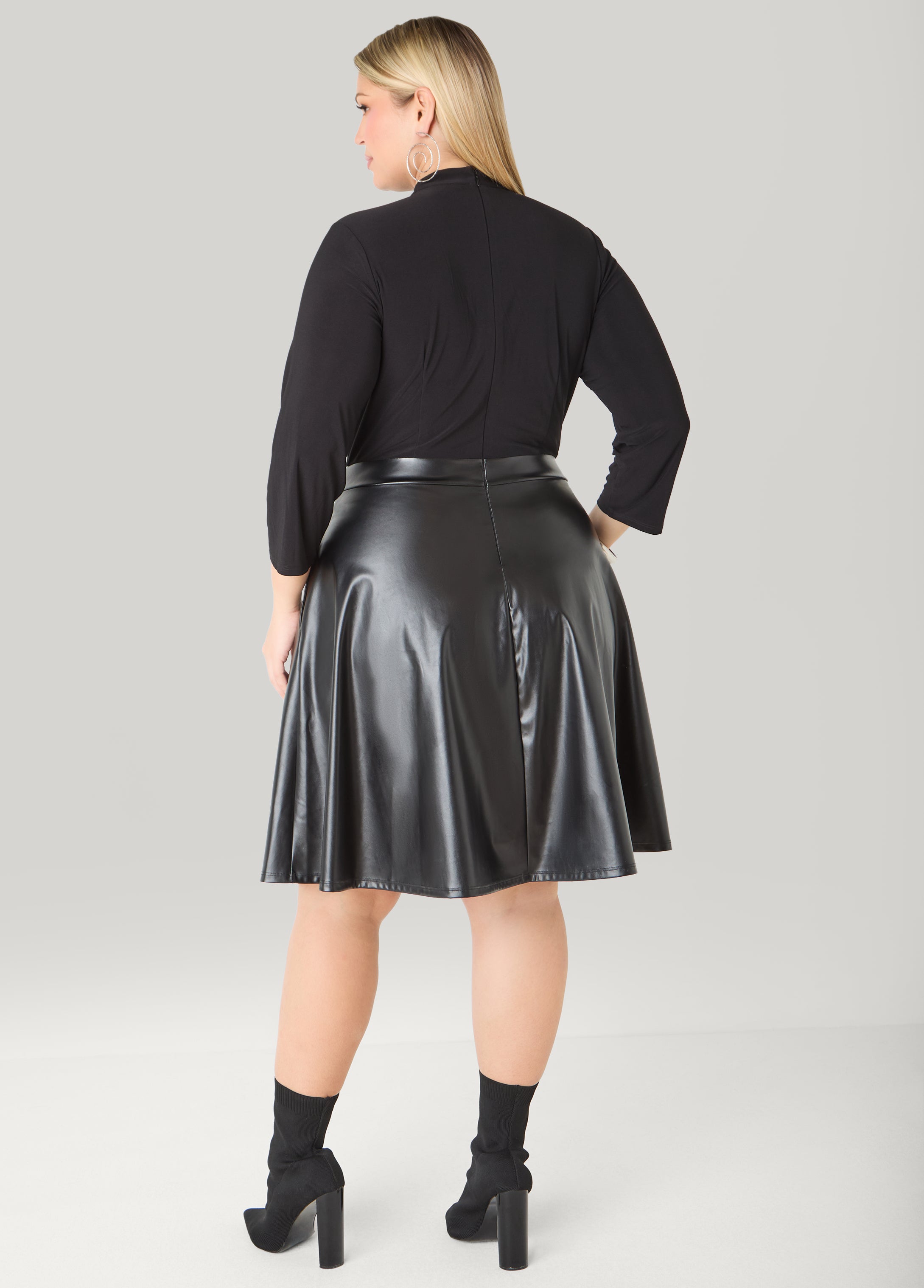Step into sweet style with our faux leather and stretch-knit dress, designed for the girly girl with a bold side! The a-line skirt creates a flirty silhouette while the faux leather panels add a hint of audacity to your style.