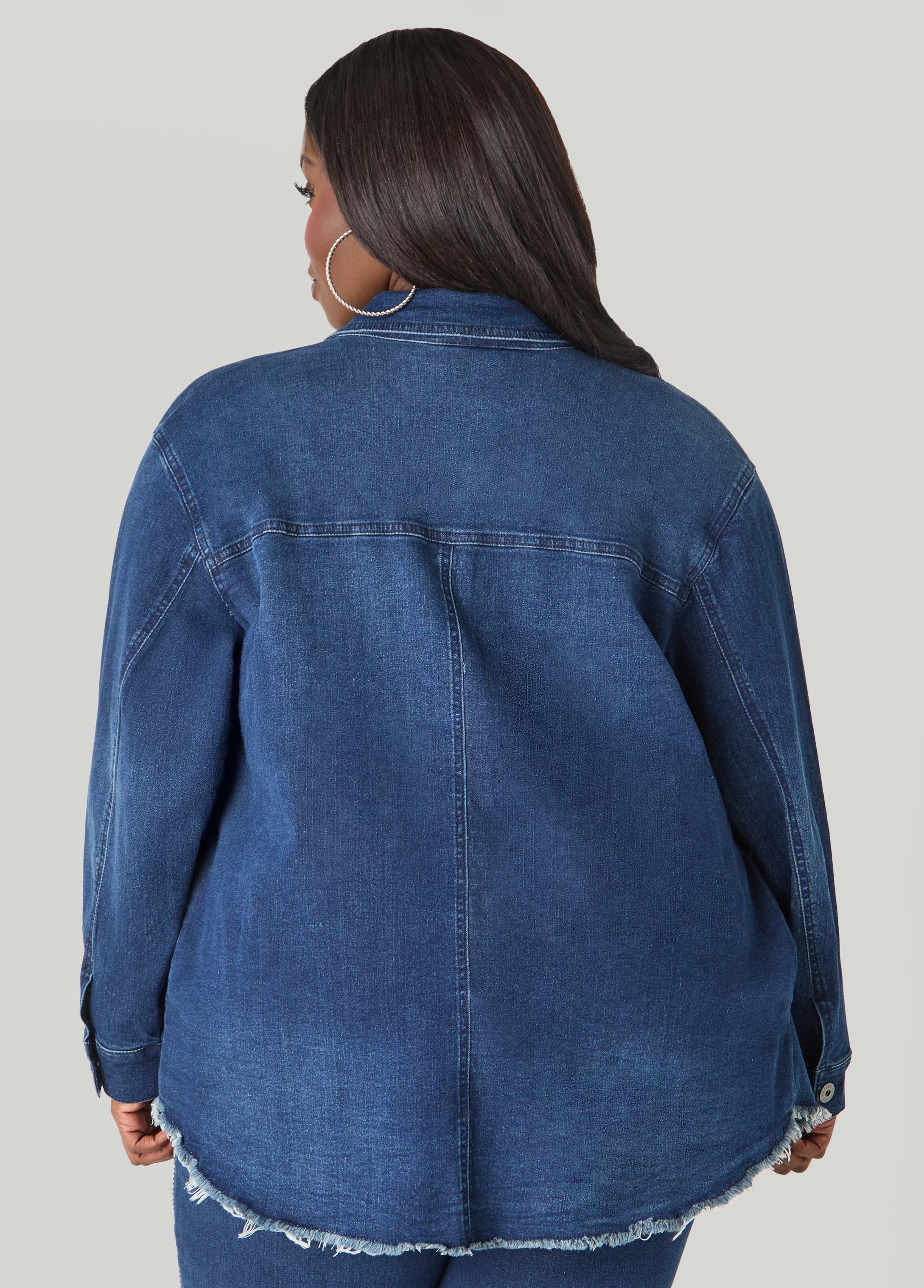 • Stretch-denim shacket with two flap pockets at bust, crystal embellishments, button-fastening sleeve cuffs and frayed trims. Button fastenings through front. Length: 32in. Can be worn as a two-piece set with matching jeans. Jeans sold separately.