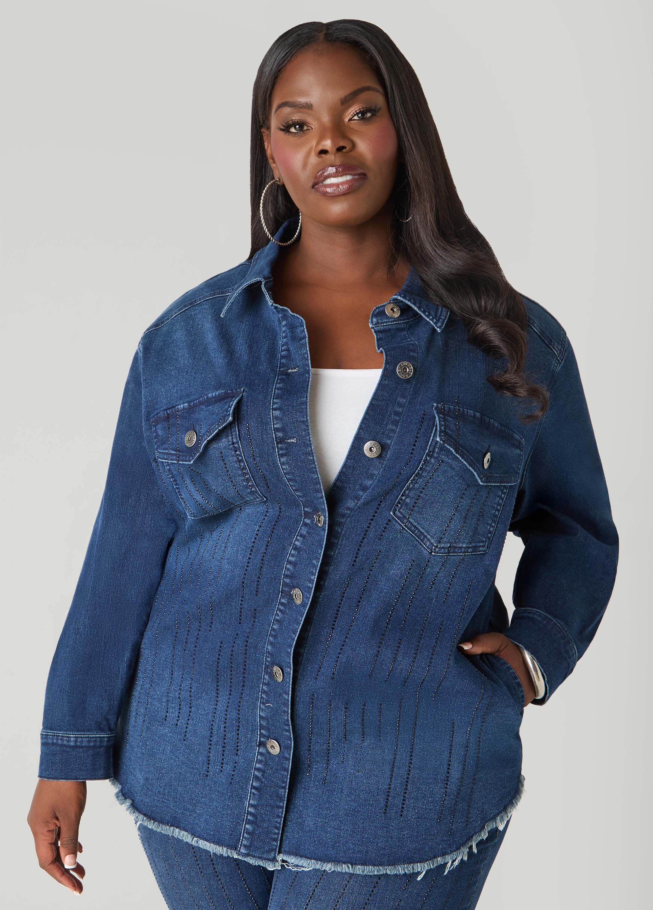 This stretch-denim shacket shines with striped crystals and frayed trims for a look that’s glam with a gritty edge. Wear it with the matching jeans for the full knockout set.