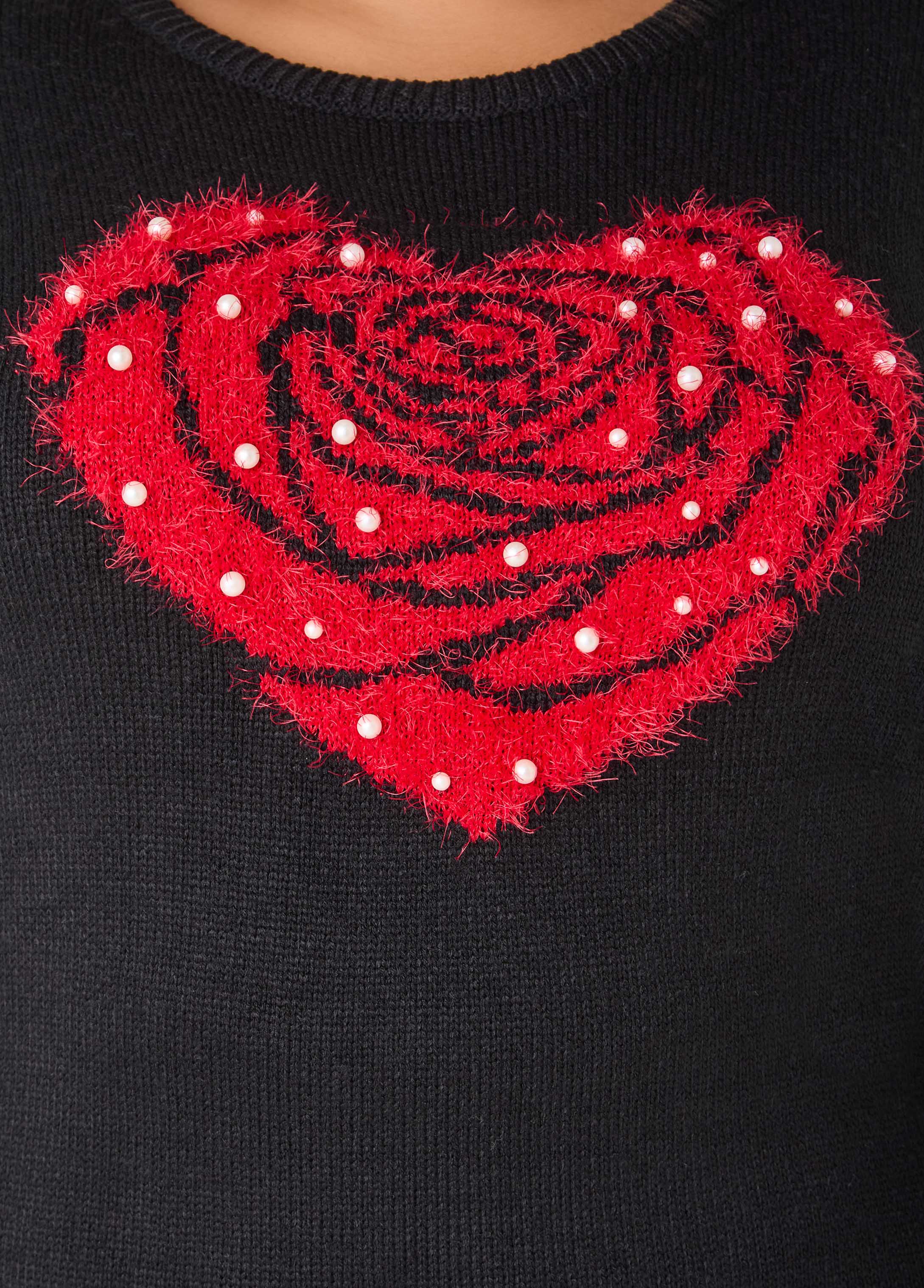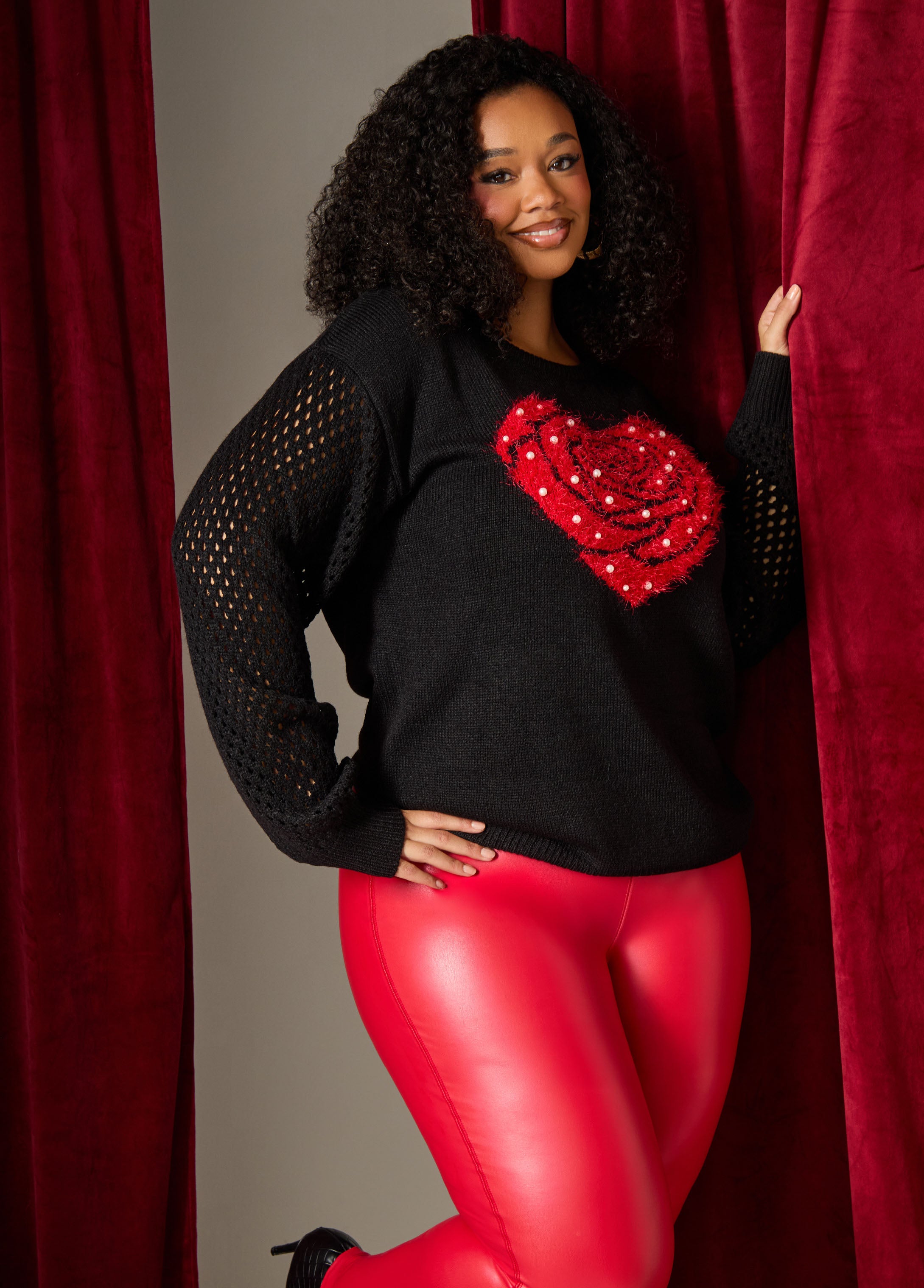This sweater leans into whimsy with an eyelash designed heart-shaped rose covered in faux pearls. Pointelle-knit sleeves add a tender, airy touch, giving the whole piece a dreamy, storybook feel.