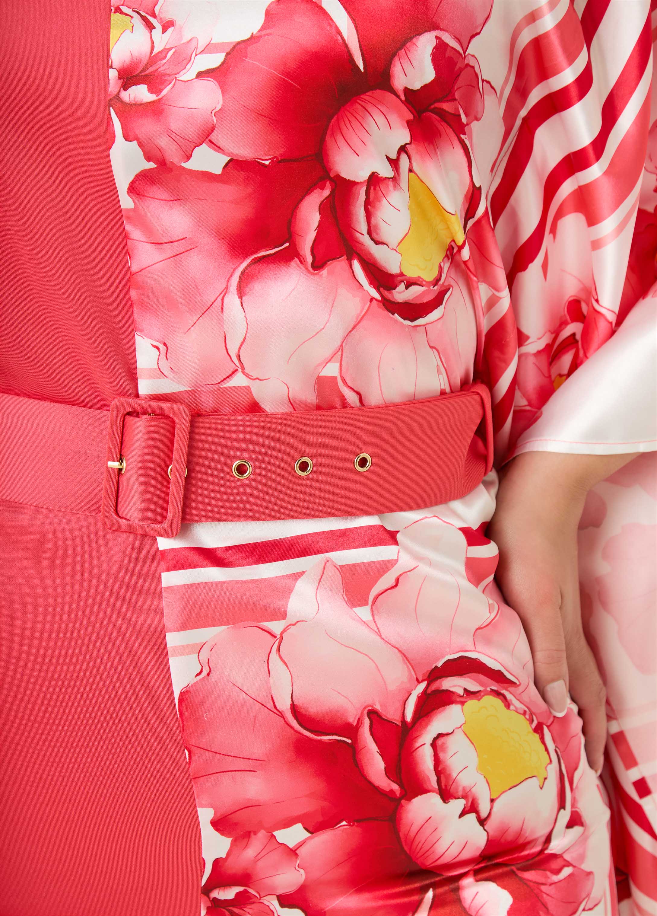 Soft watercolor print on shantung gives this dress an artful feel complete with ruffle trims and sash ties that define the waist. The flounced hem brings a light, swaying finish as you move.