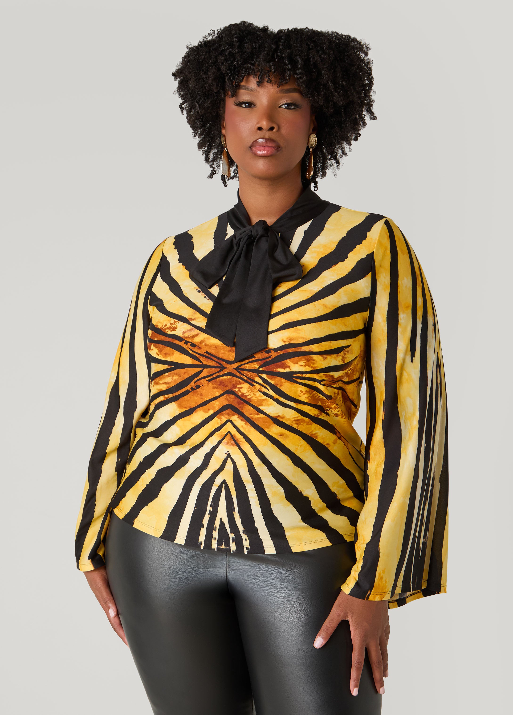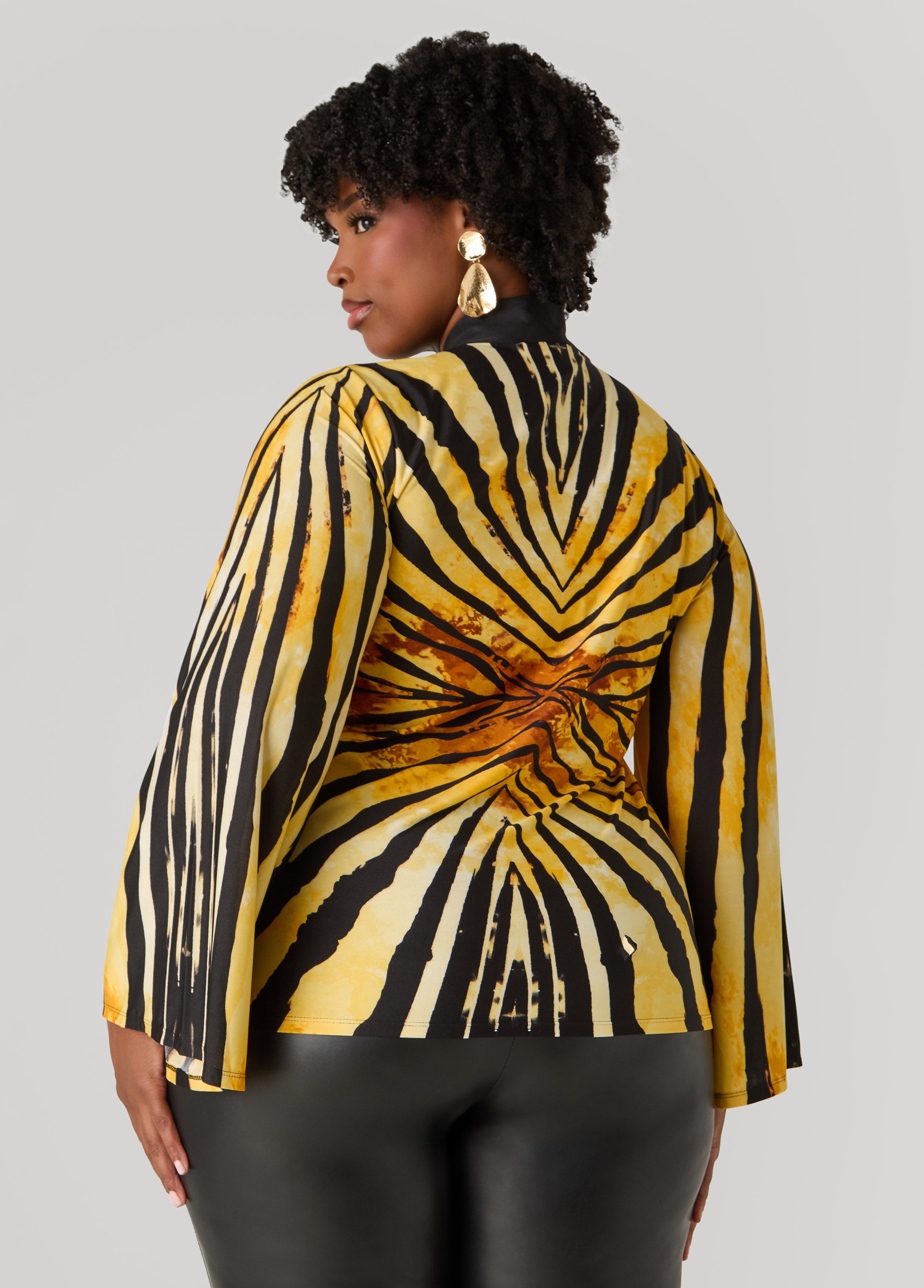 This stretch-knit blouse brings the sunset with it. The abstract print turns up the color, while the V-neckline, neckties and bell sleeves keep the silhouette fun and feminine.