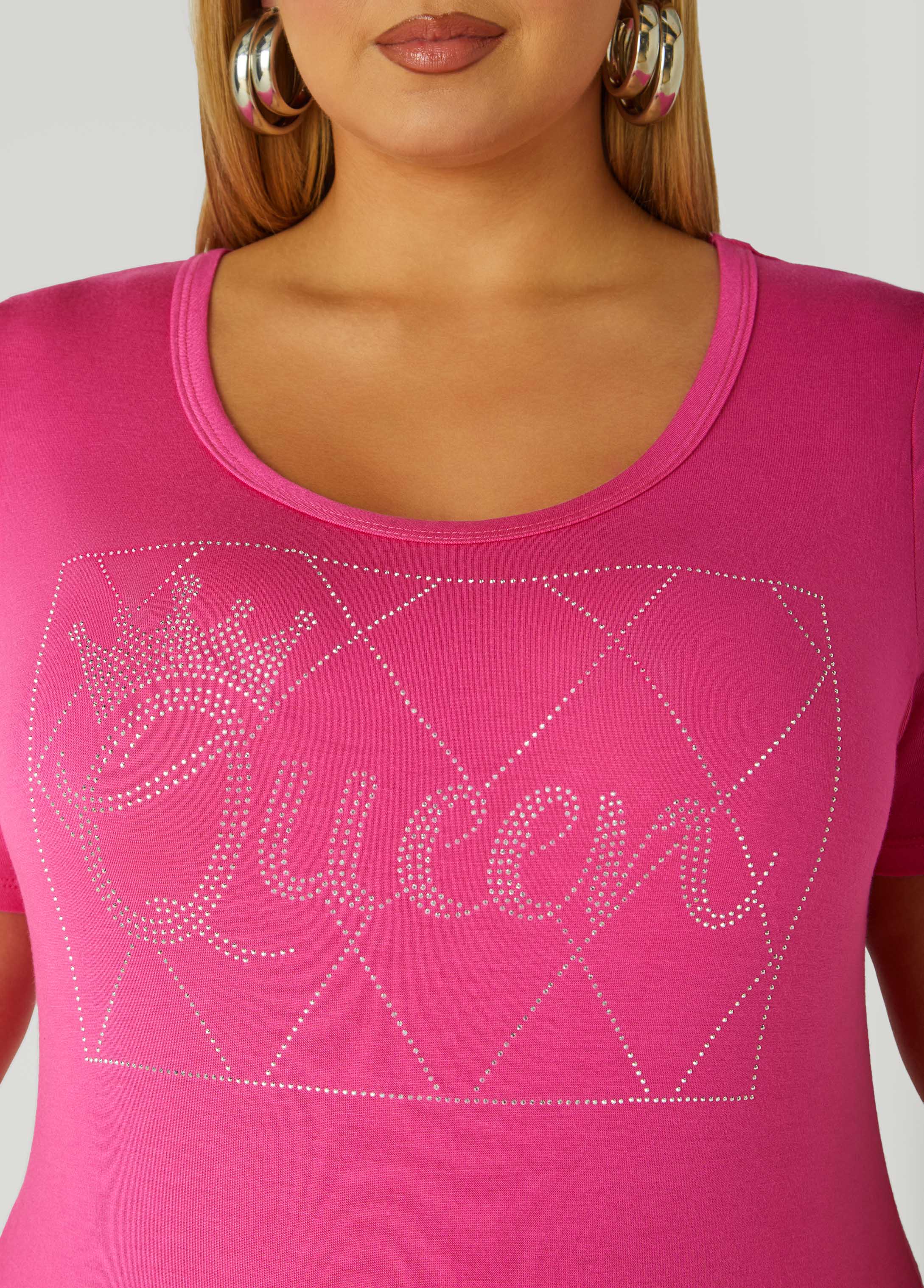 This "Queen" stretch-knit tee shines with crystal details that catch every eye. The stretchy fabric moves with you for comfort that never quits. Make it your go-to for when you want to stand out without trying too hard.