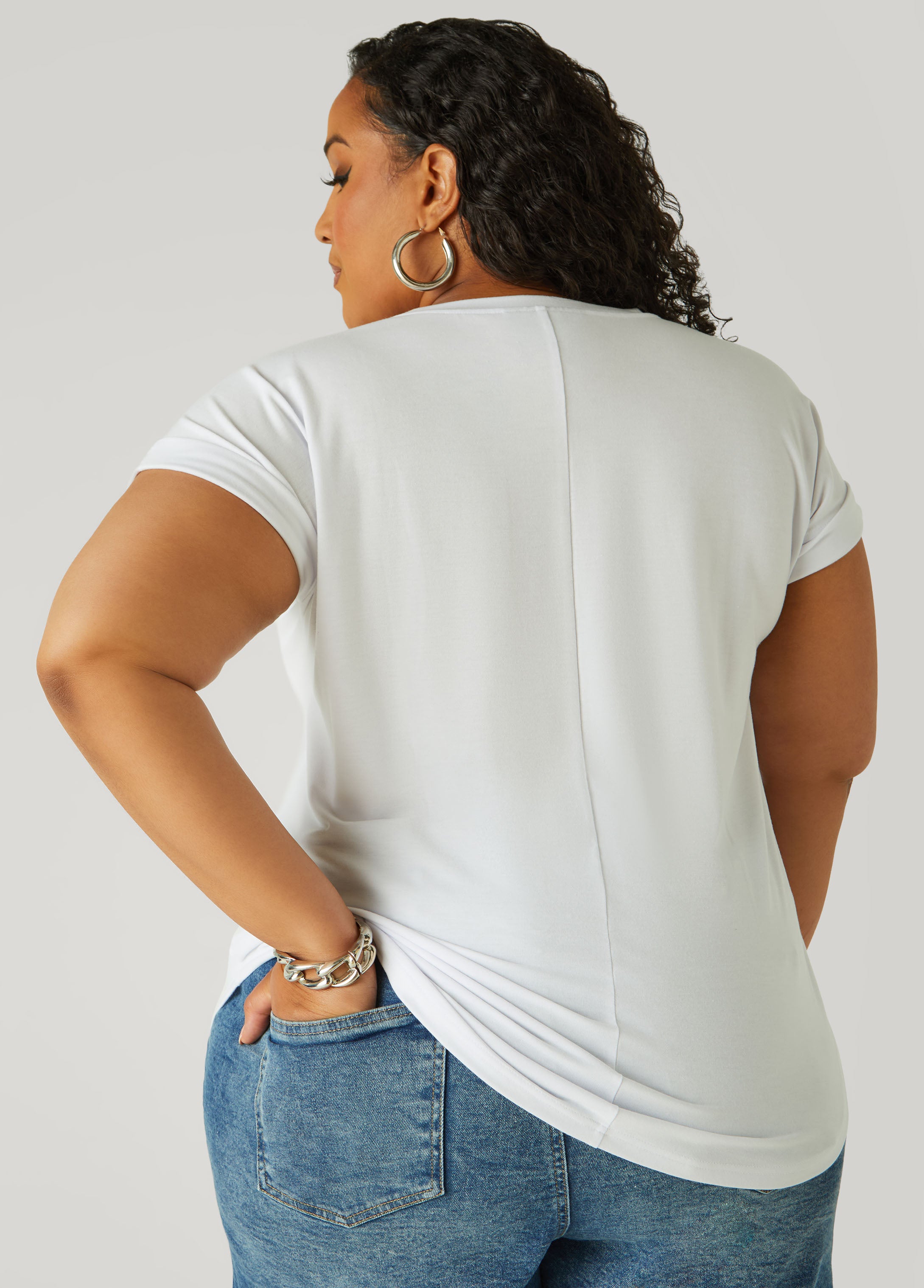 Vacay mode: on. This stretch-knit tee spells it out in boucle appliqués, with cuffed sleeves that keep things cute. Just add sunnies and a suitcase.