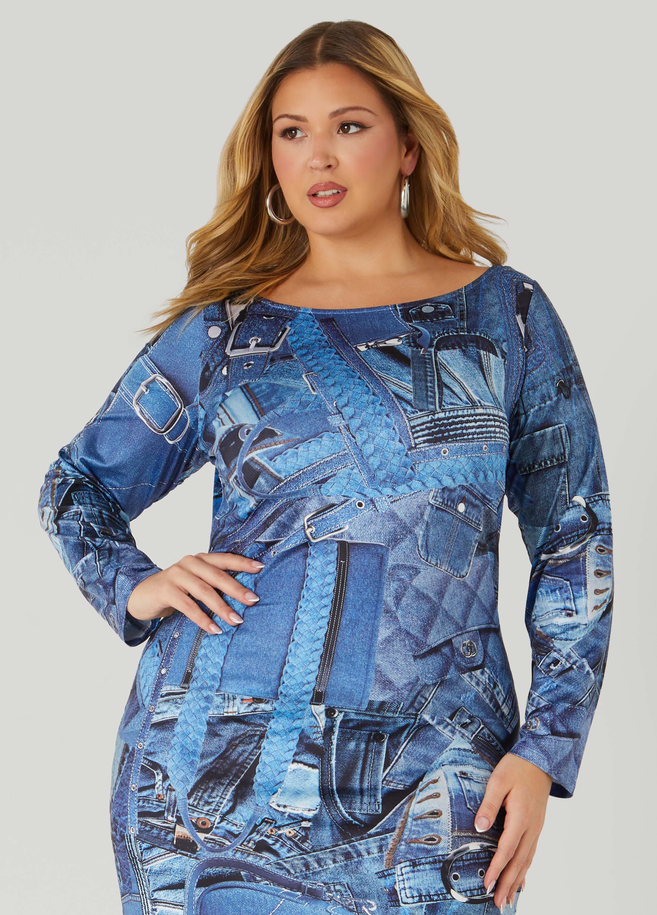 Denim print gets a sexy remix in this stretch-knit midi bodycon dress. Two daring slits at the sides let you flash just enough leg while the curve-hugging fit keeps all eyes where they should be.
