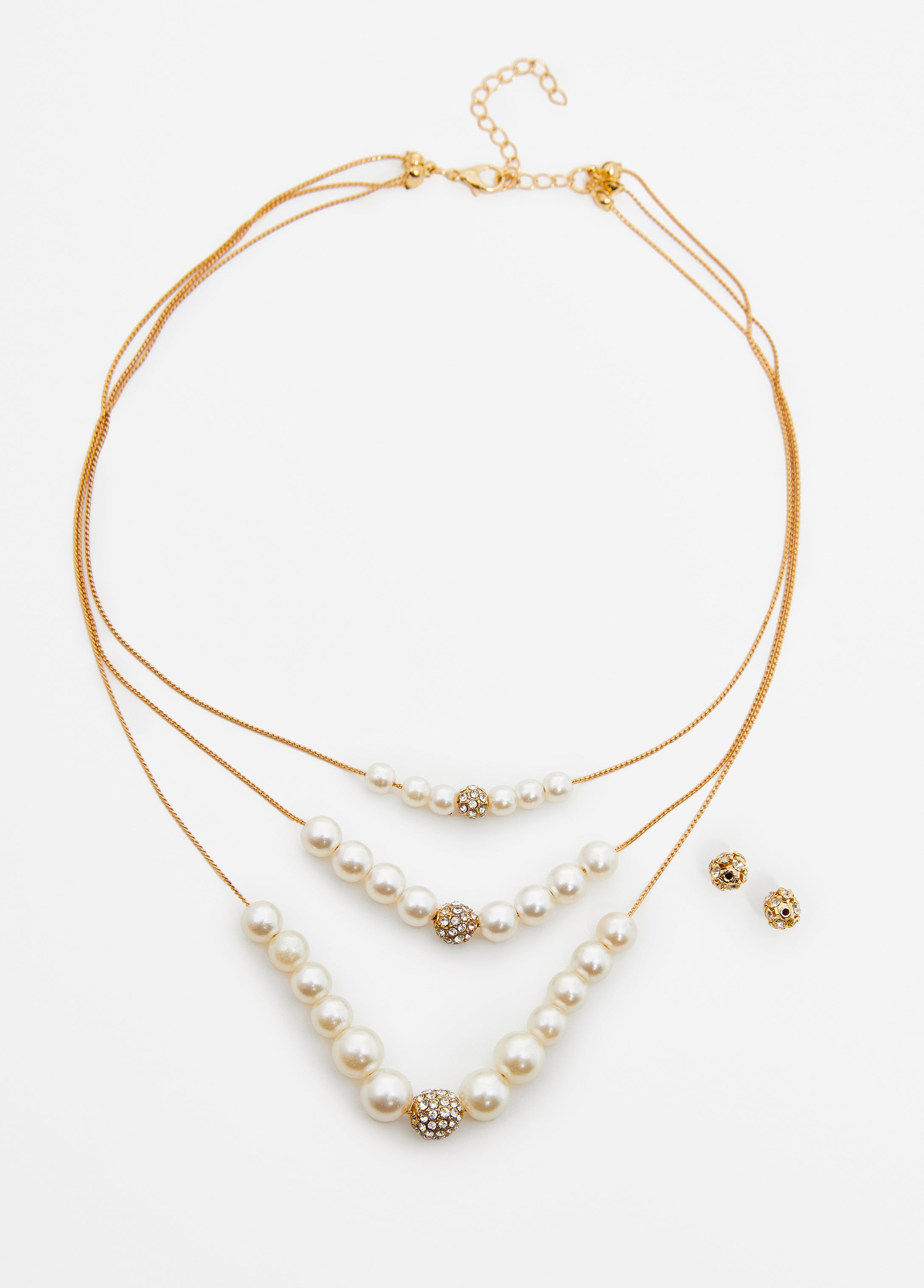 Faux pearls and pavé crystals team up in gold-tone metal for a layered look that knows how to stand out. Matching studs keep the energy going because more is more.