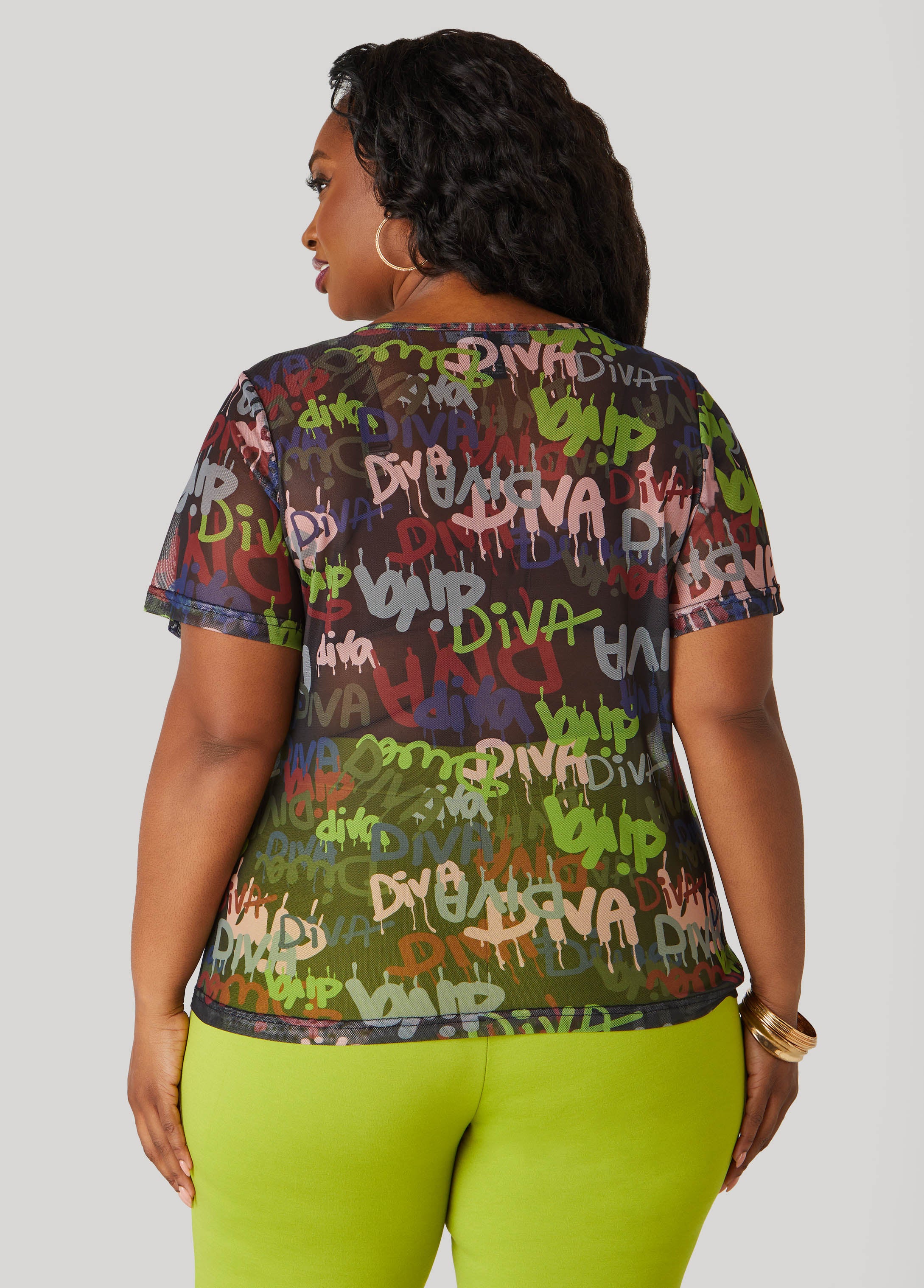 Prints pop for a punch of party-ready fun on the sheer design of mesh tee!