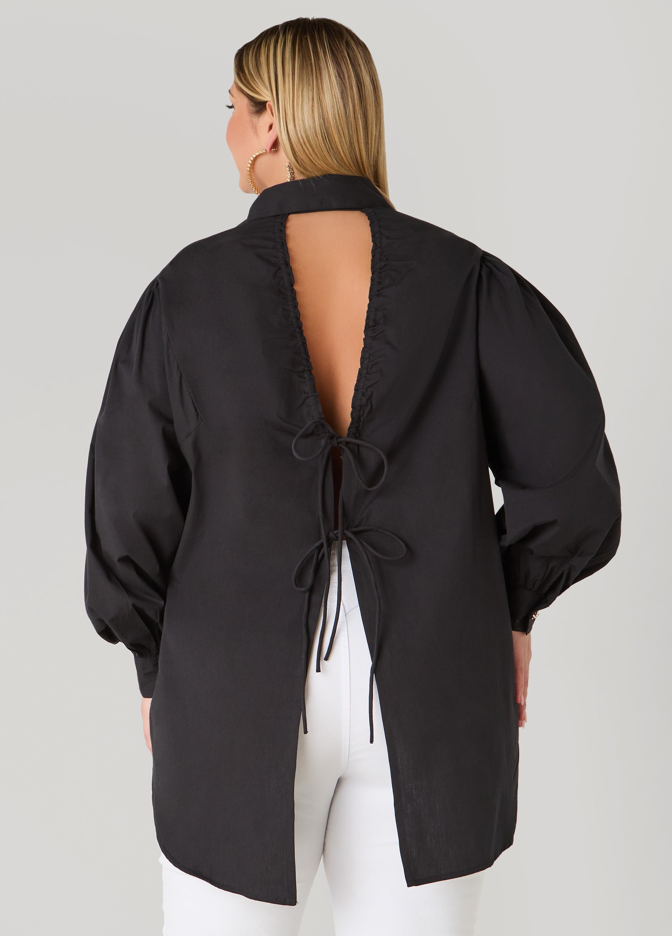 Business in the front and party in the back, this cotton shirt is all about the unexpected! While the crystal buttons, patch pockets and chic V-neck offers contemporary style, the tie-up open back and a subtle hi-to-low hem makes sure fun mode is really to be activated!