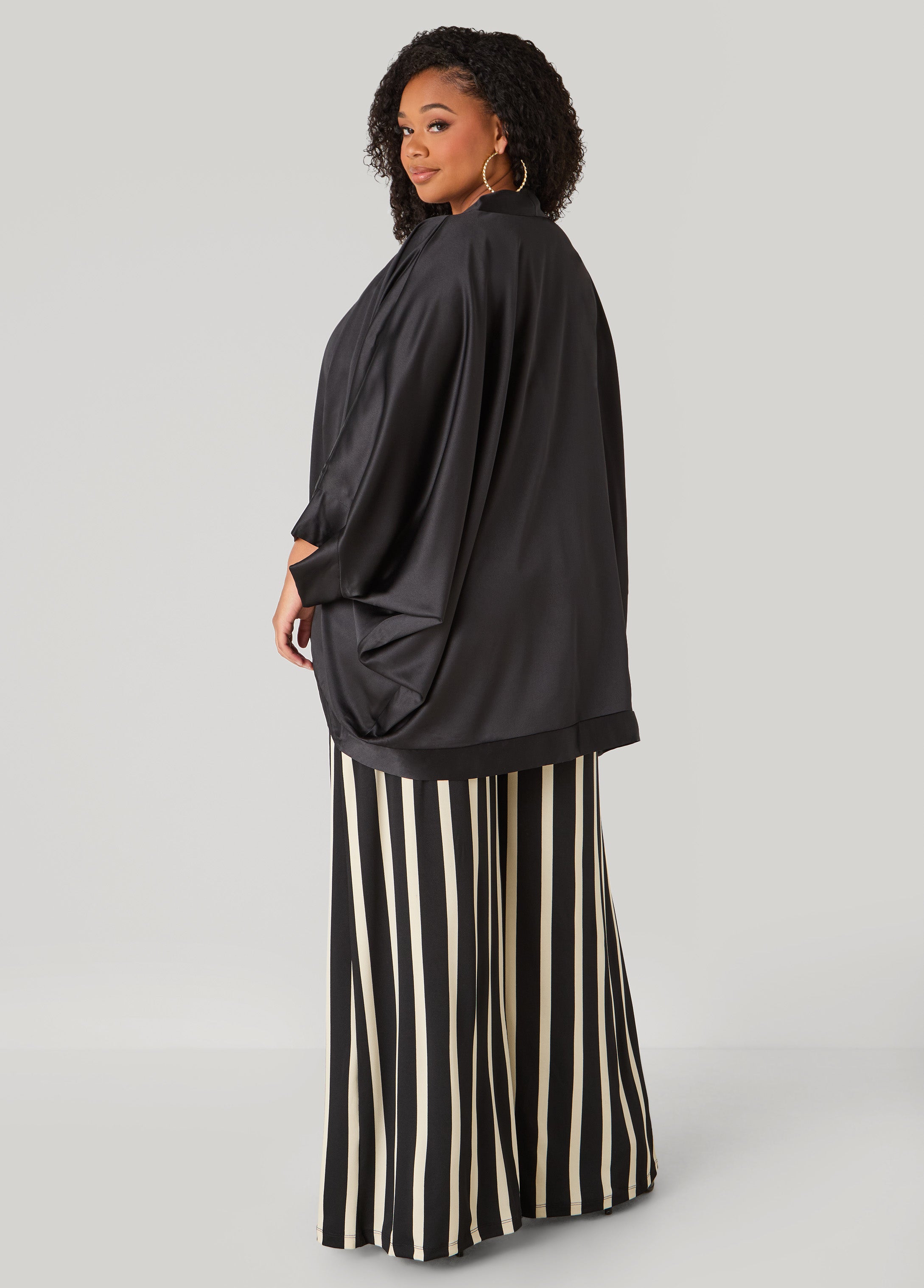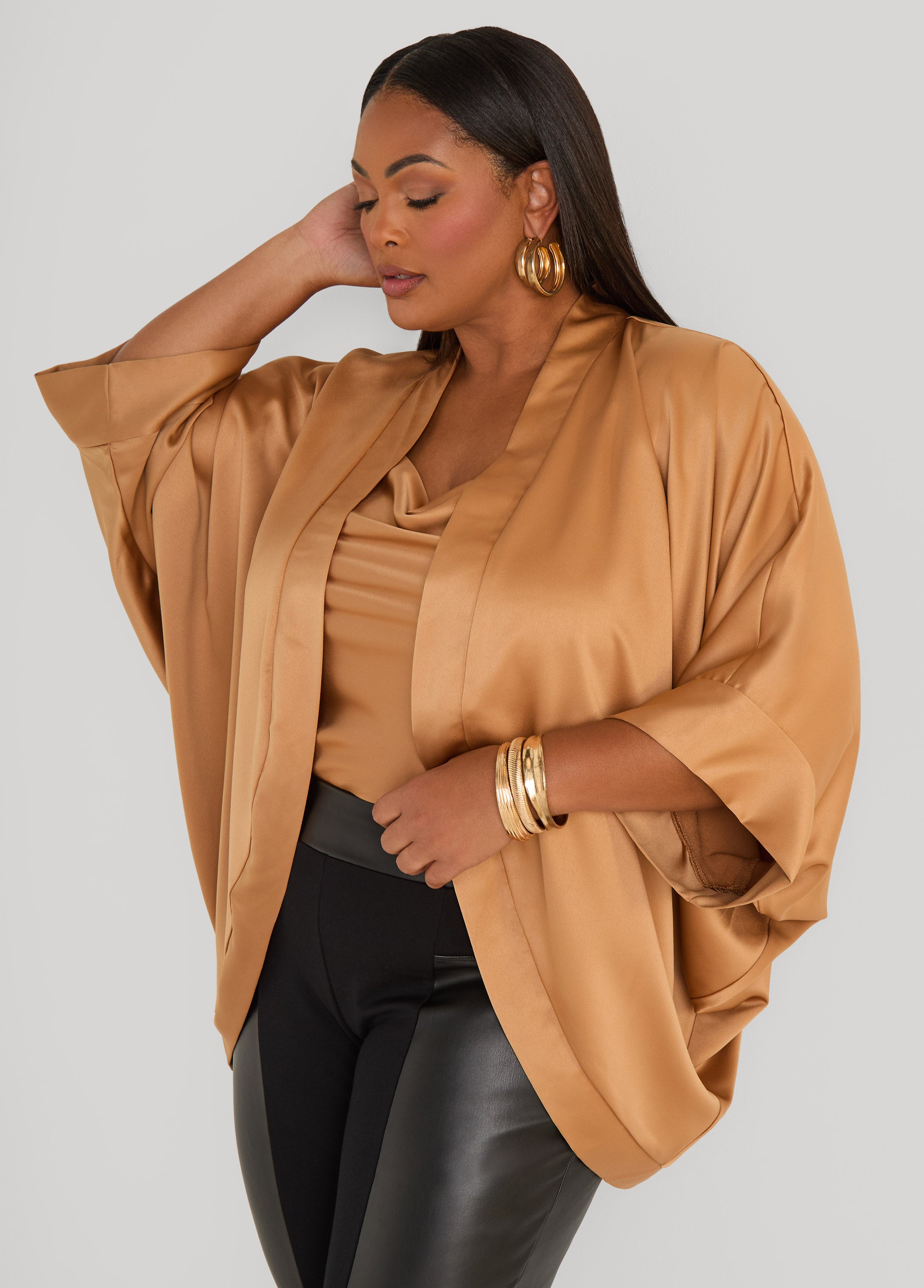Wrap yourself in satin with flowing dolman sleeves and an open front that lets the shine take center stage. Pair it with the matching cami for a look that’s all glam, no effort.