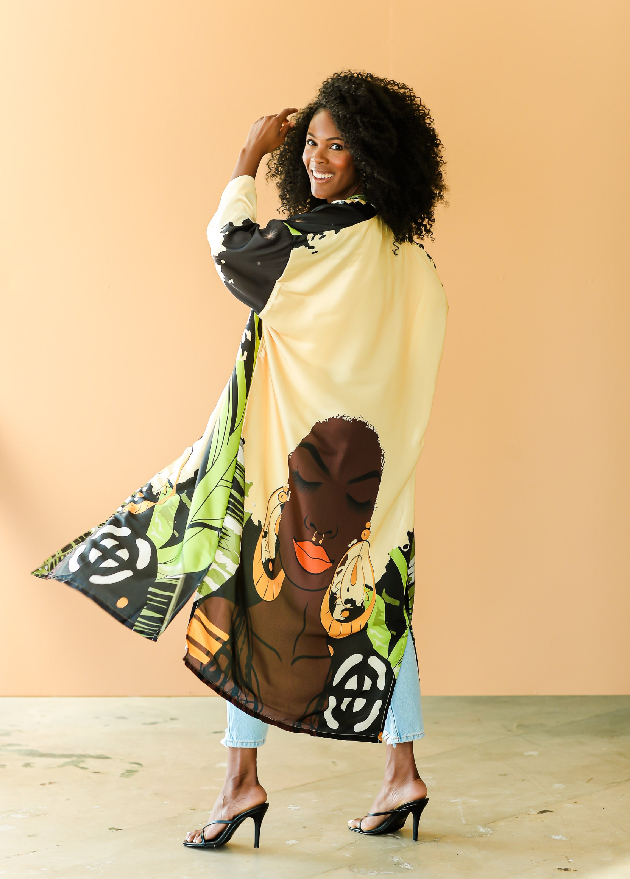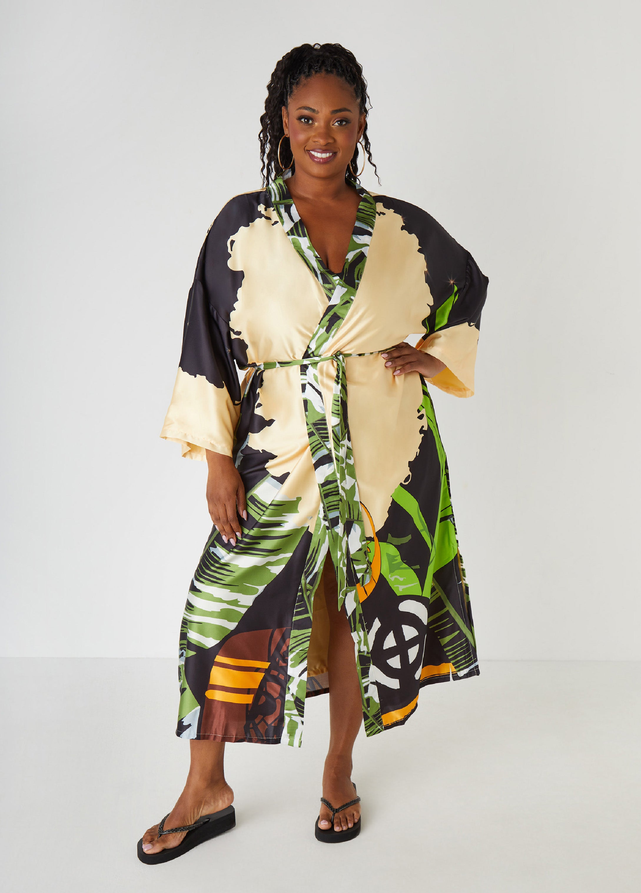 Big hair, calming energy—"Ziggy" is here to bring your zen dreams to life. This Pardon My Fro™ satin kimono brings all the vibes with a stunning graphic of a blonde afro queen, draped in bold accessories and set against a lush greenery backdrop. The sash-tie waist lets you cinch it up or let it flow, depending on the mood. Luxe, vibrant, and unapologetically fly—just like you.