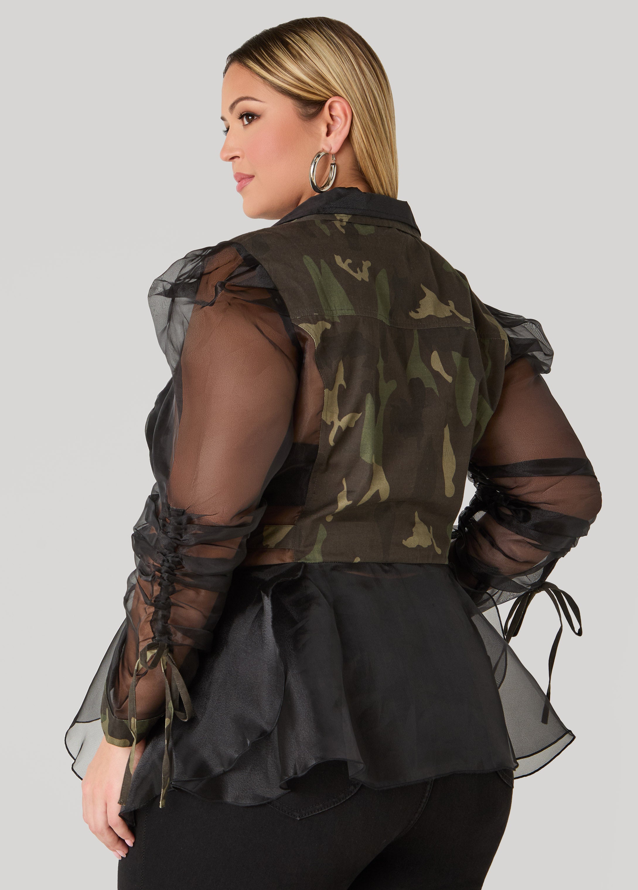 Organza turns up the drama with sheer attitude and camo cotton panels that keep it grounded. Flap pockets flirt at the bust, ruching and ties bring the sleeves to life and a peplum hemline cinches the waist just right.
