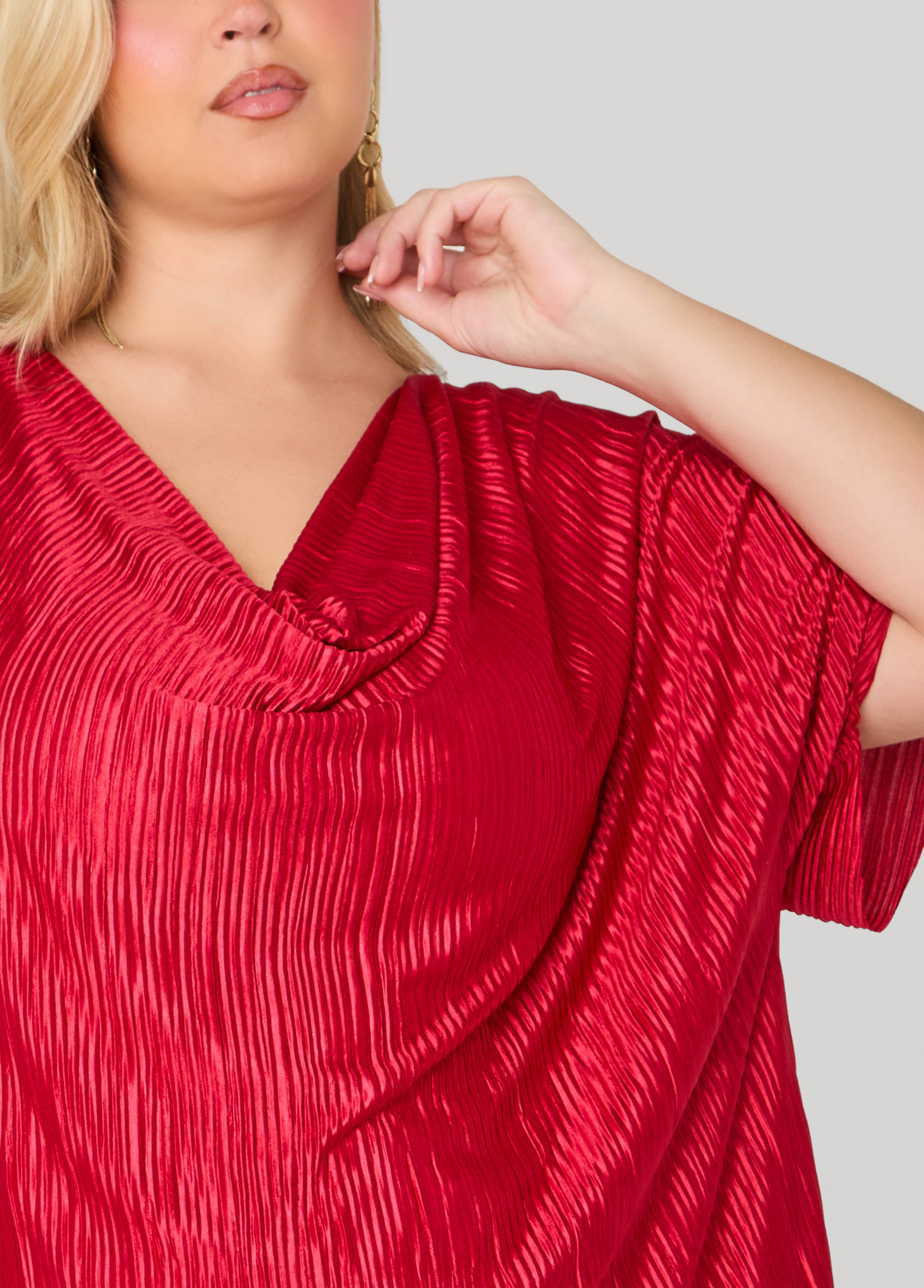 This plissé blouse drapes into a soft cowl neck and pairs perfectly with the matching pants for a look that’s pure main-character energy.