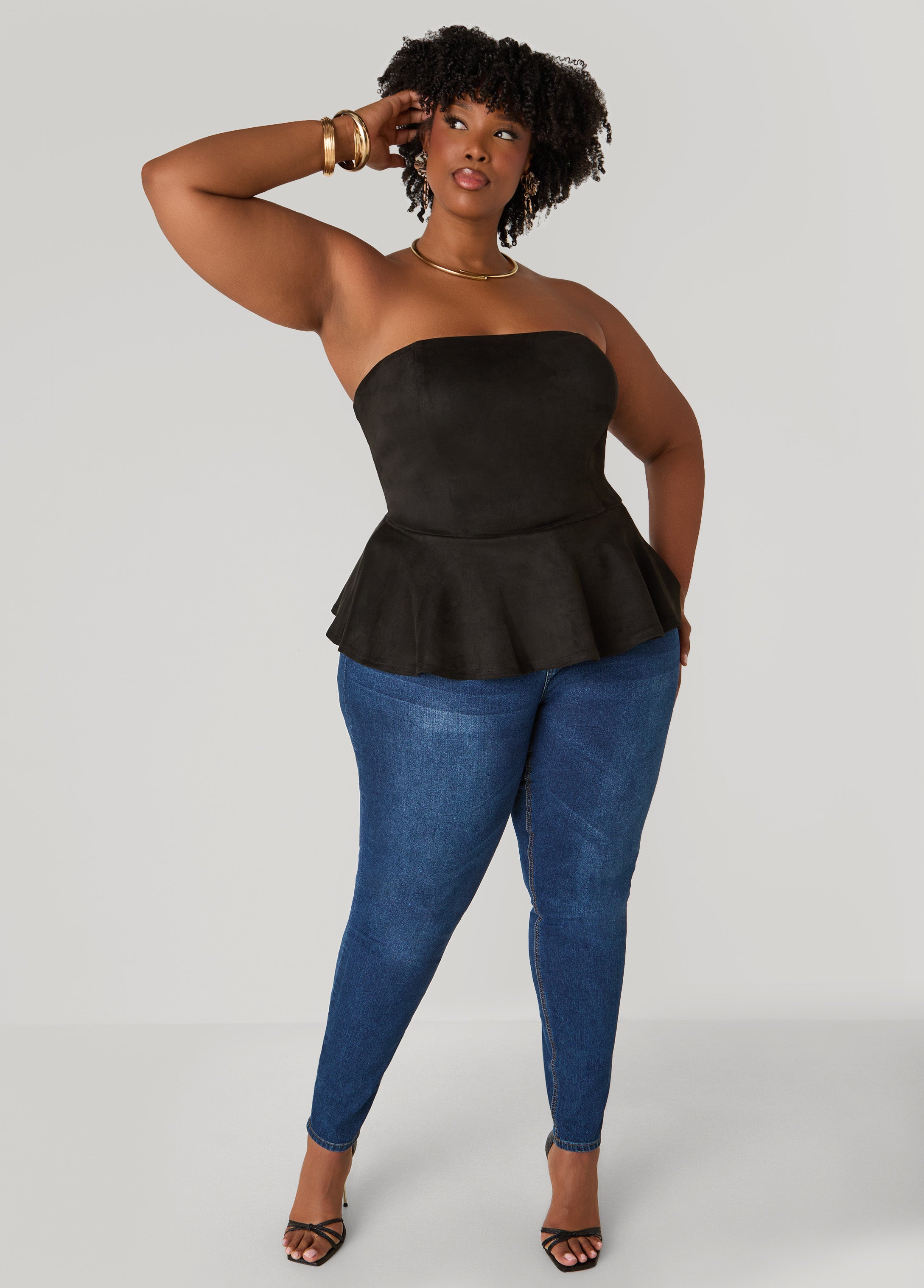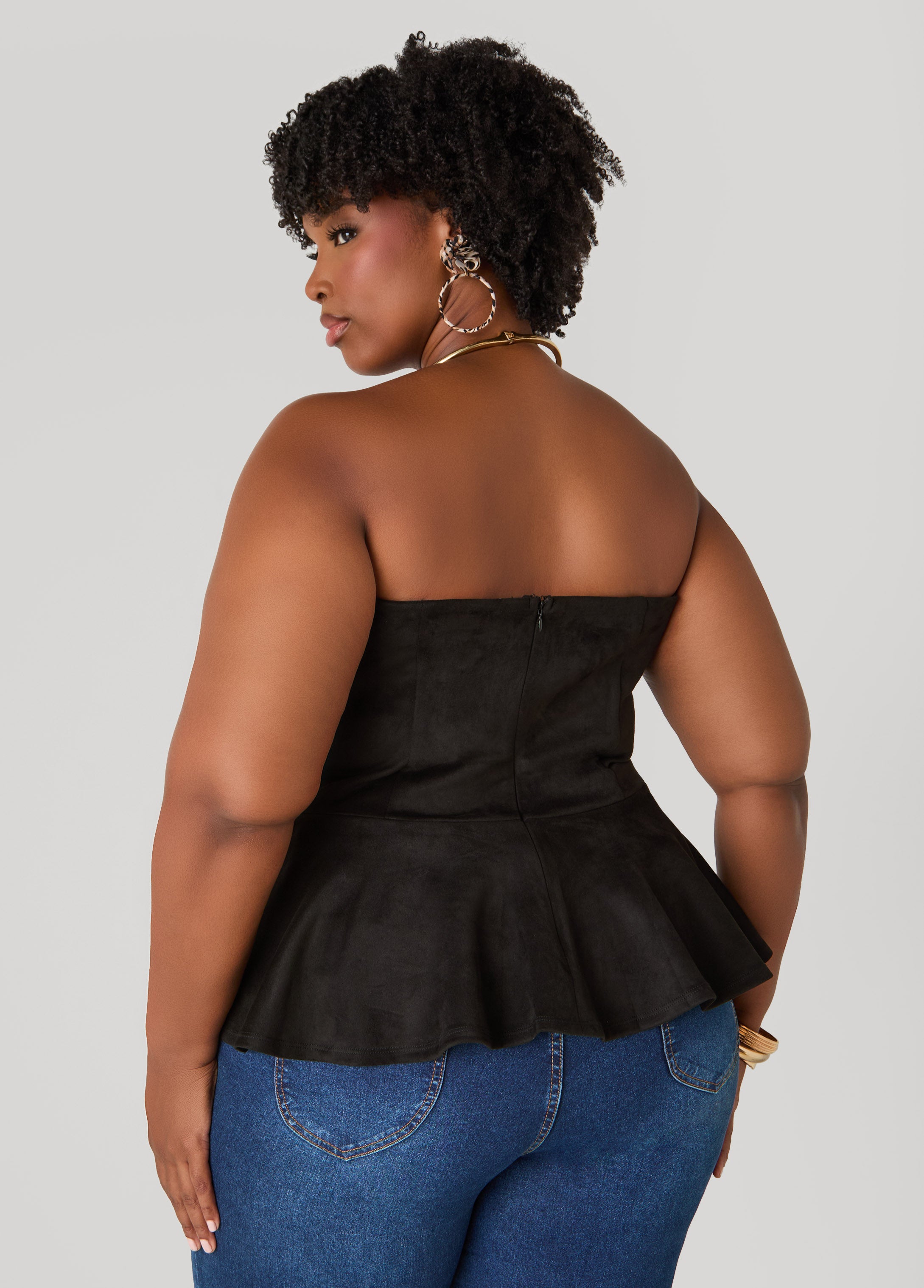 Strapless & sultry, this faux suede top clings in all the right places then kicks out into a curve-loving peplum.
