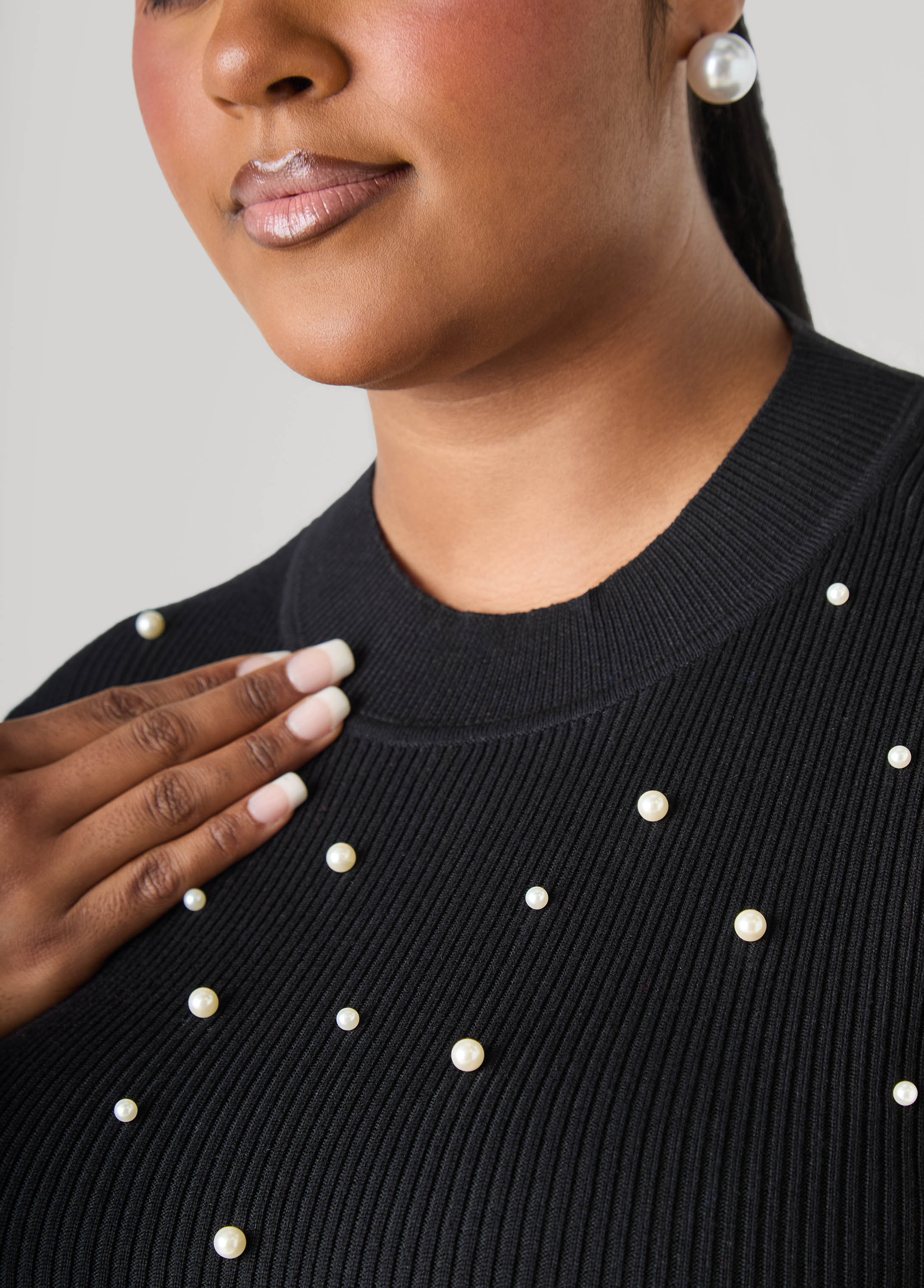 This ribbed-knit sweater is designed with scattered faux pearls for a look that’s sweet, stylish and a little unexpected.
