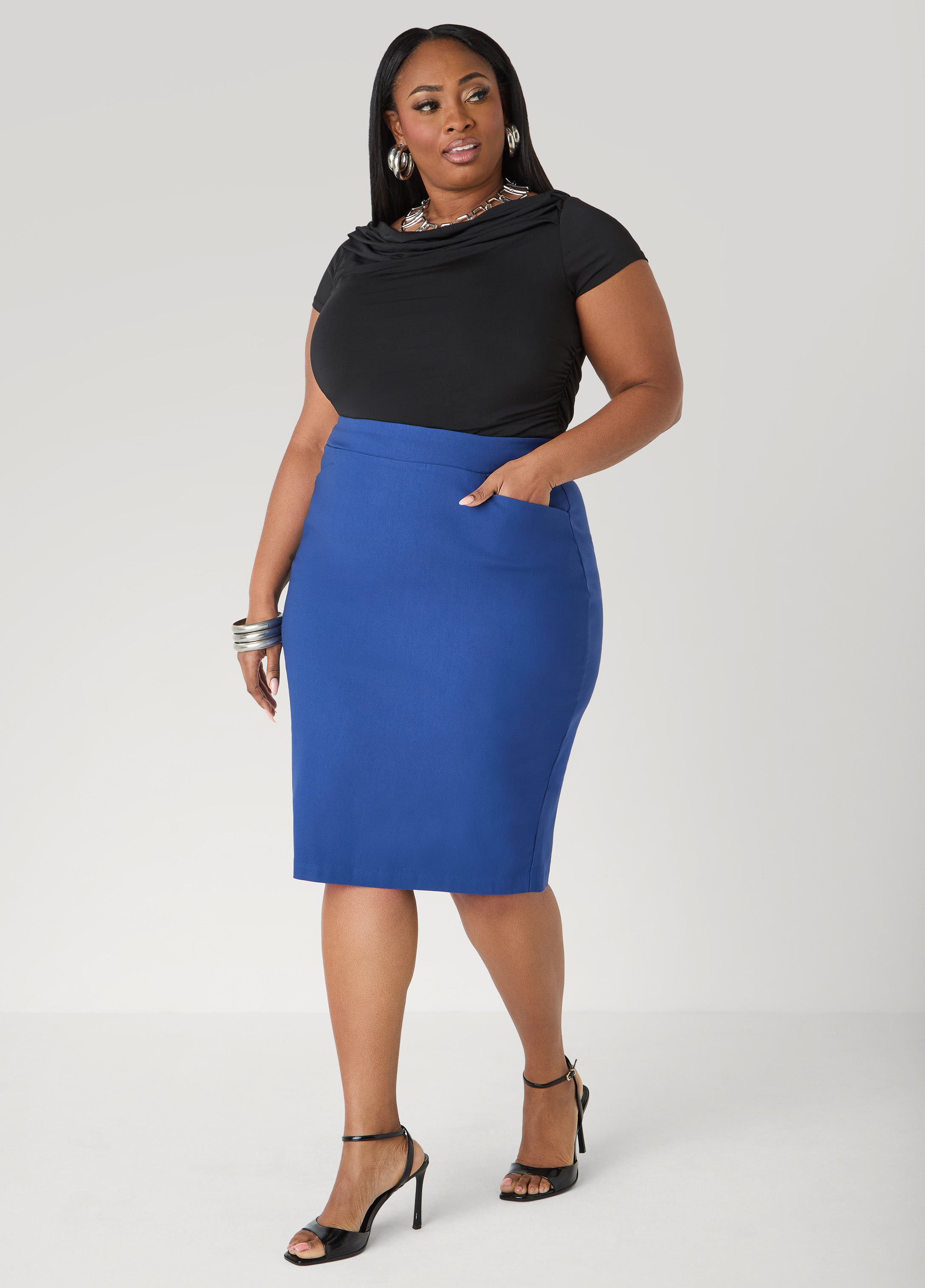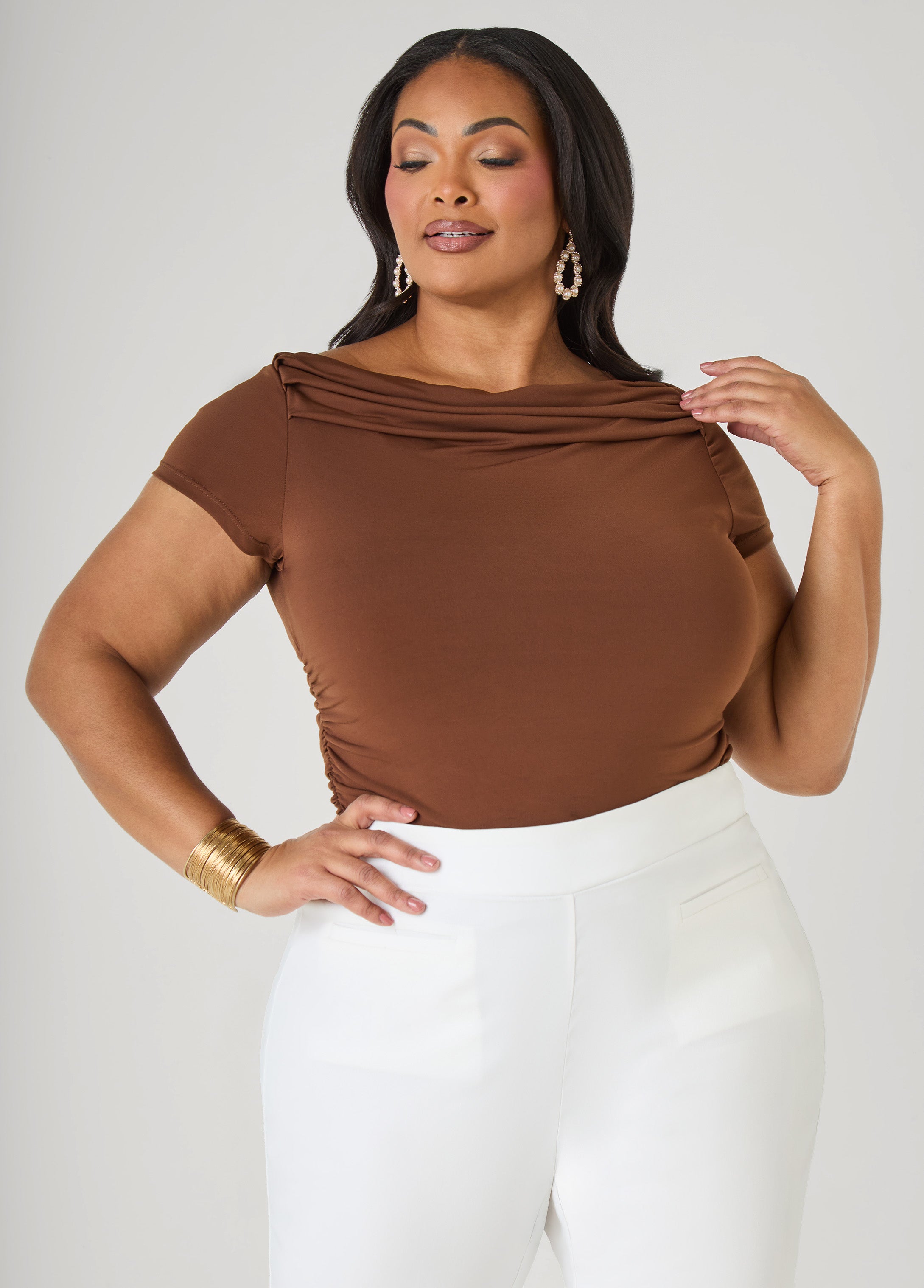 Say hey to our stretch-knit top designed with a softly draped cowl neck and ruched sides that shape the fit. A clean, flattering piece that works dressed up or pared back.