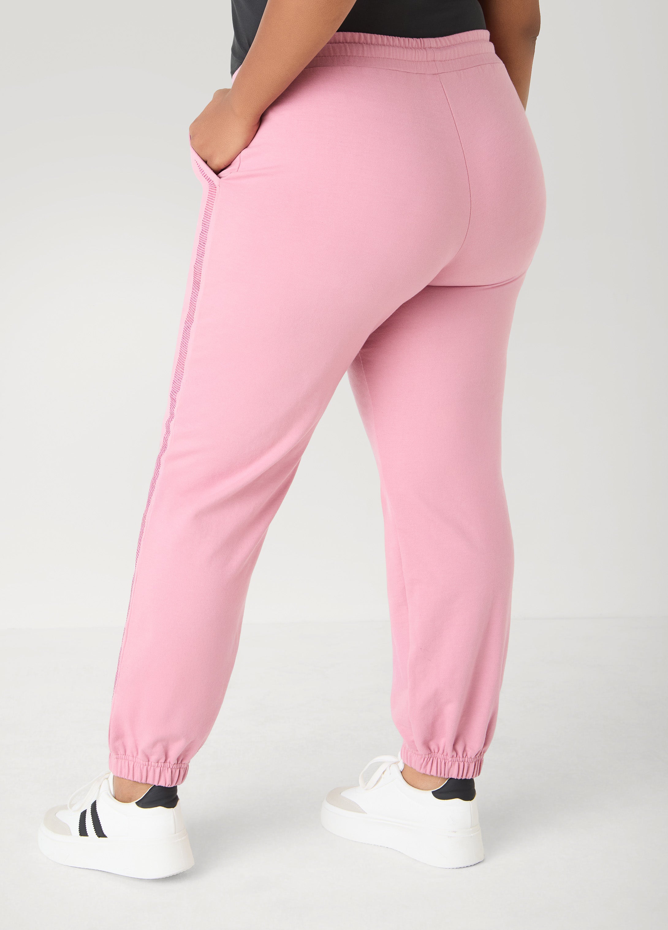 • High-rise French terry joggers with two slant pockets at sides, crystal embellishments, drawstrings at elasticized waistband and ankle cuffs. Pull-on style. Inseam: 31in. Can be worn as a two-piece set with matching pullover. Pullover sold separately.