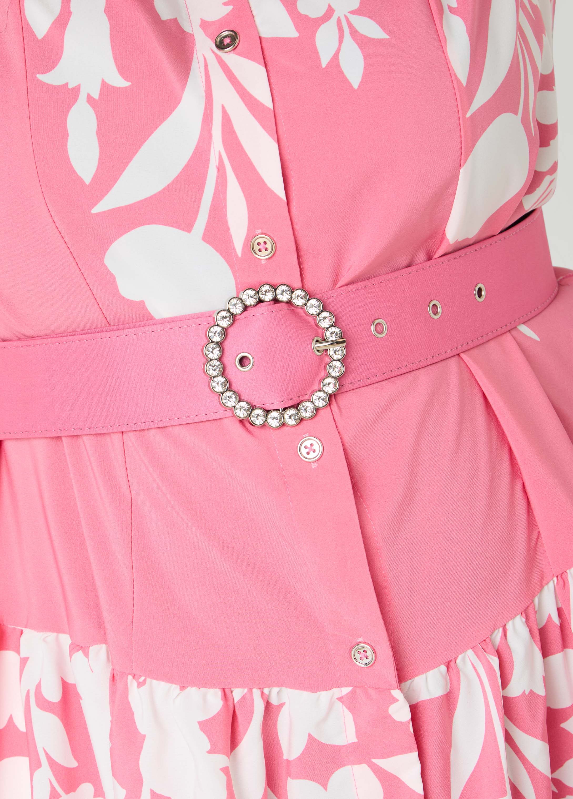 Step into the season in this pink floral print midaxi shirtdress. A crystal-embellished buckle belt highlights the waist with the sharkbite hem for soft movement with every step. Fresh, bright and ready for all things spring.