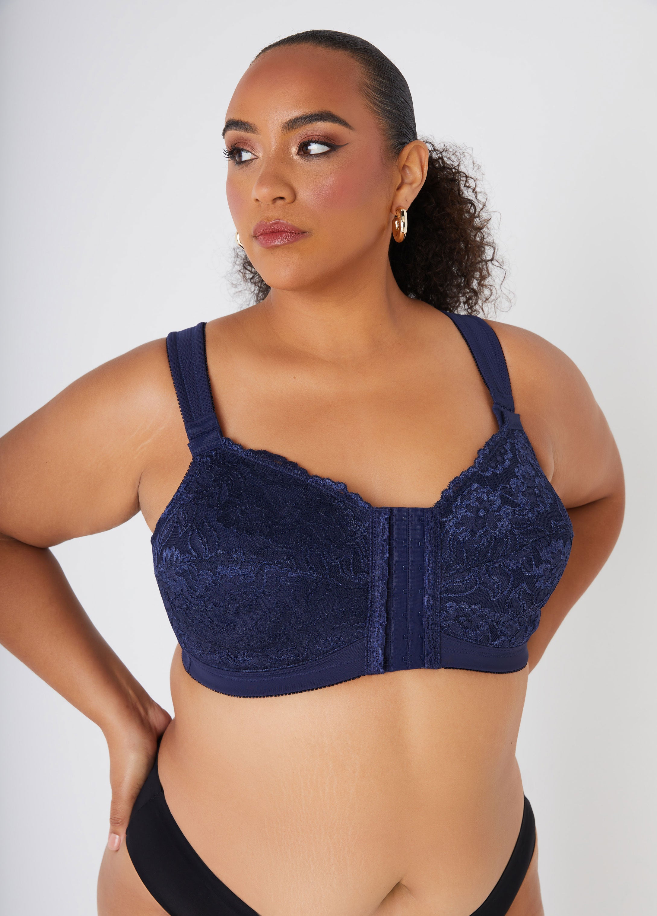 Cut from supportive, smoothing and shaping mesh this bra provides function and fashion with its crossover full back panel and sensual lace front featuring easy access hook closures.