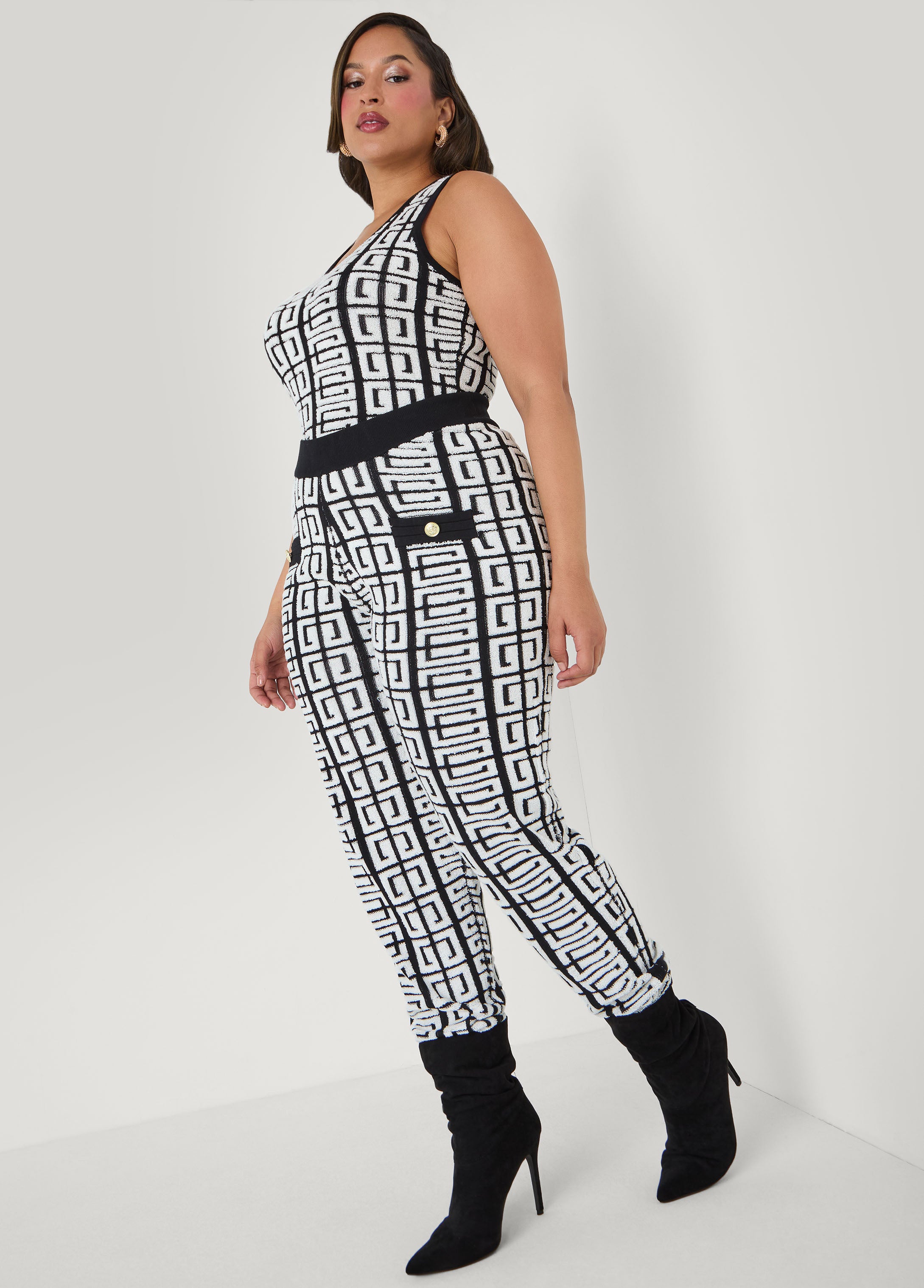 Geo-chic & ready to slay. This black & white bouclé-jacquard bodysuit brings serious texture and style. Match it with the duster and joggers to complete the look when you’re in a full-on fashion mood.