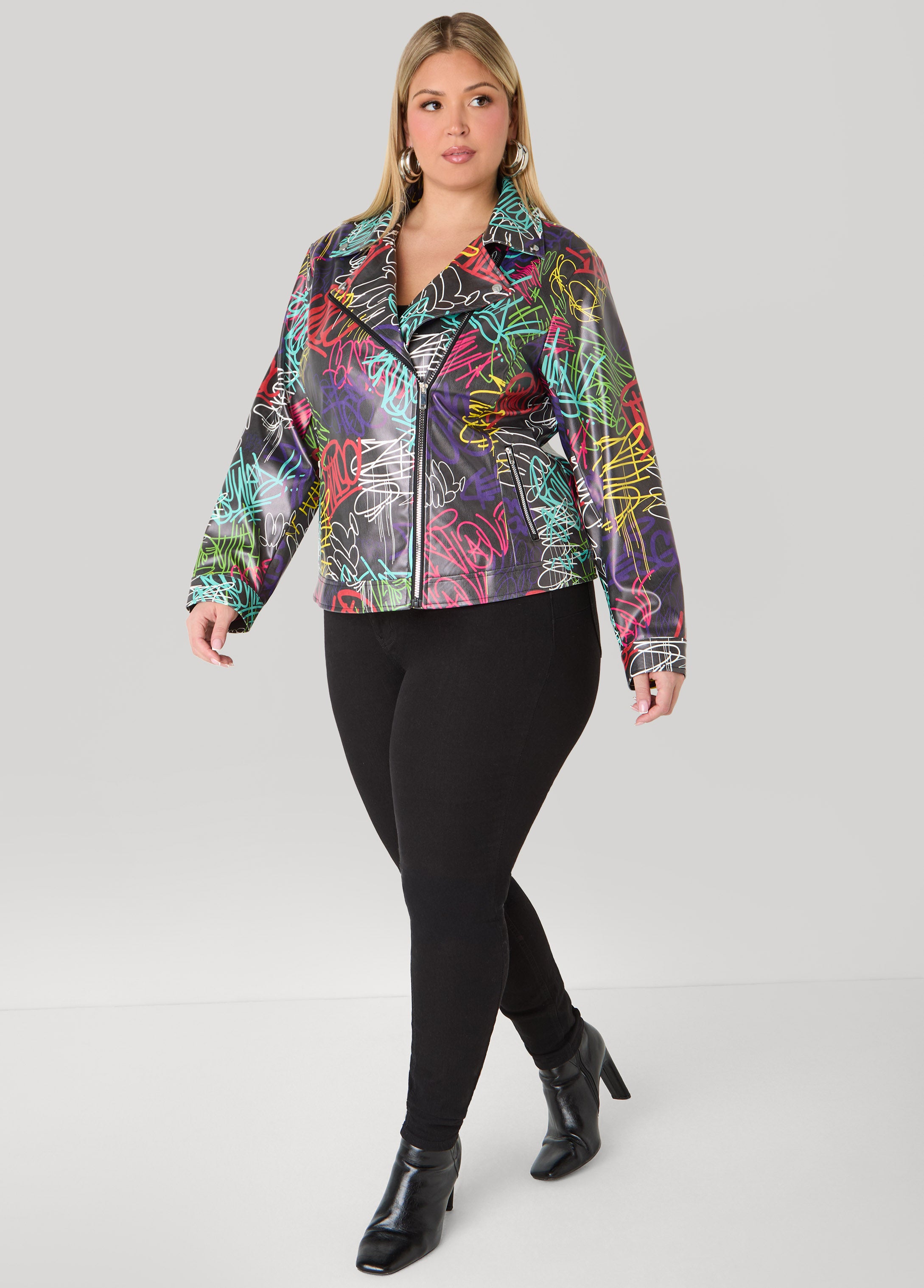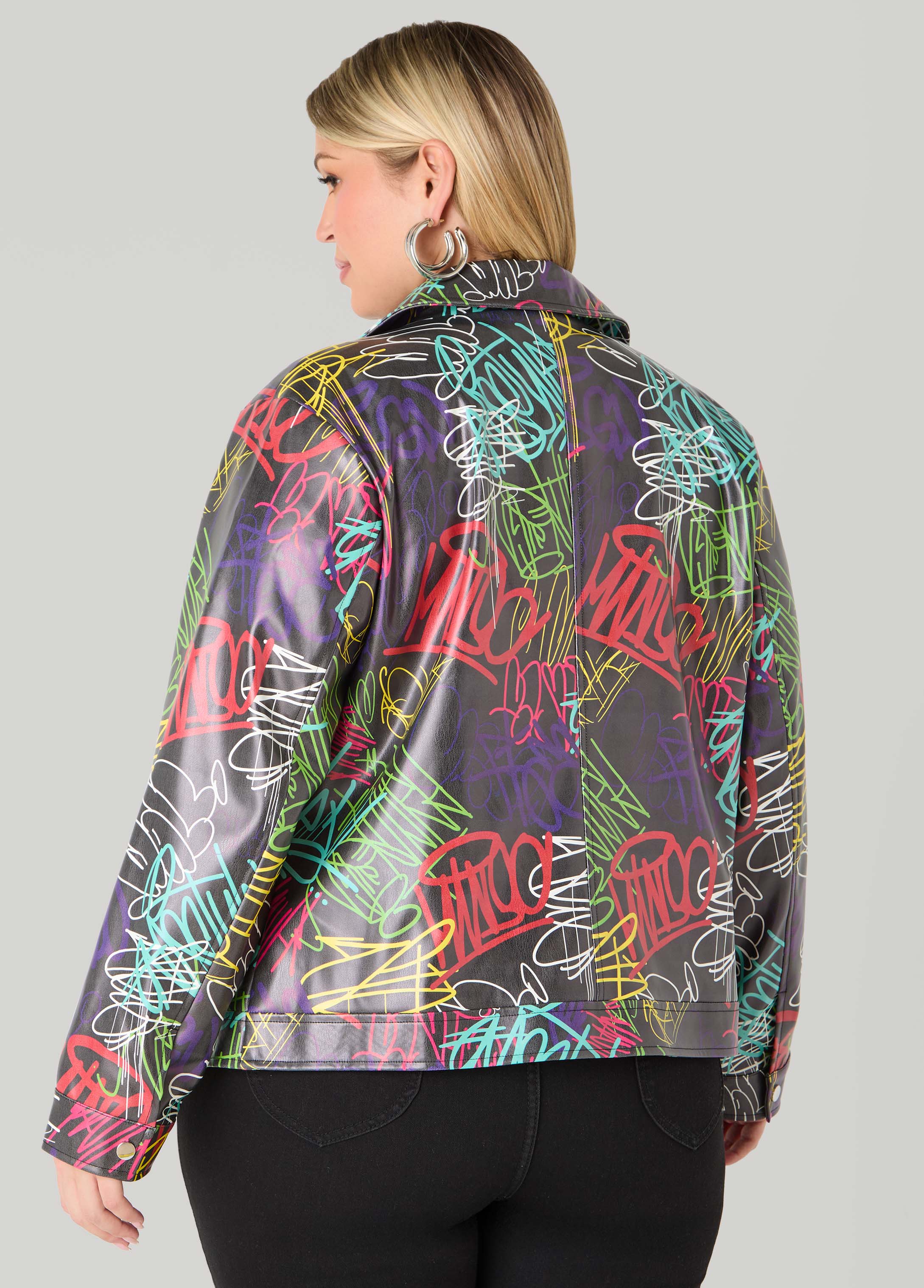 Rule number one: never play it safe. This faux leather moto jacket brings the street scene to your closet with a sexy graffiti print, zips, snaps and just the right dose of rebellion.