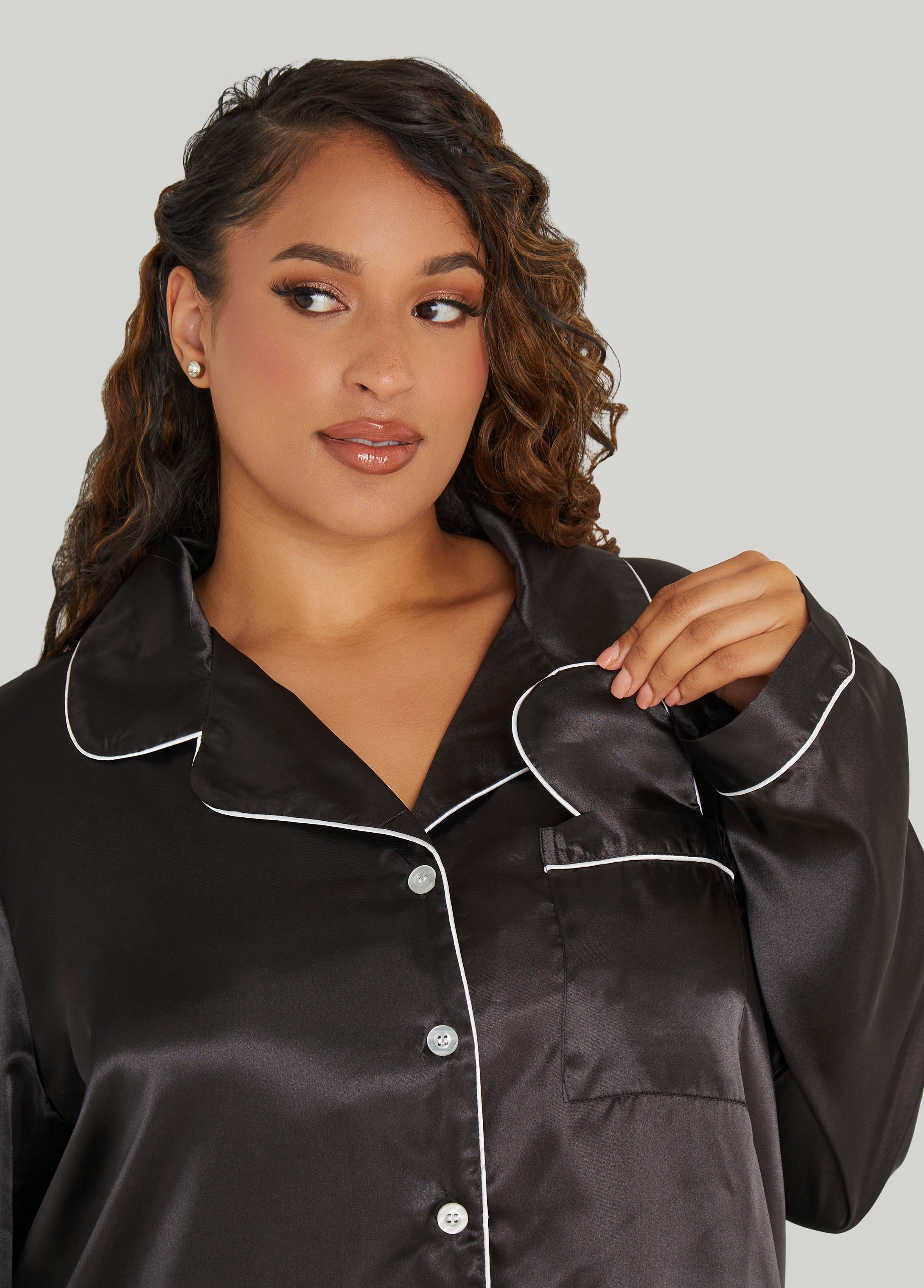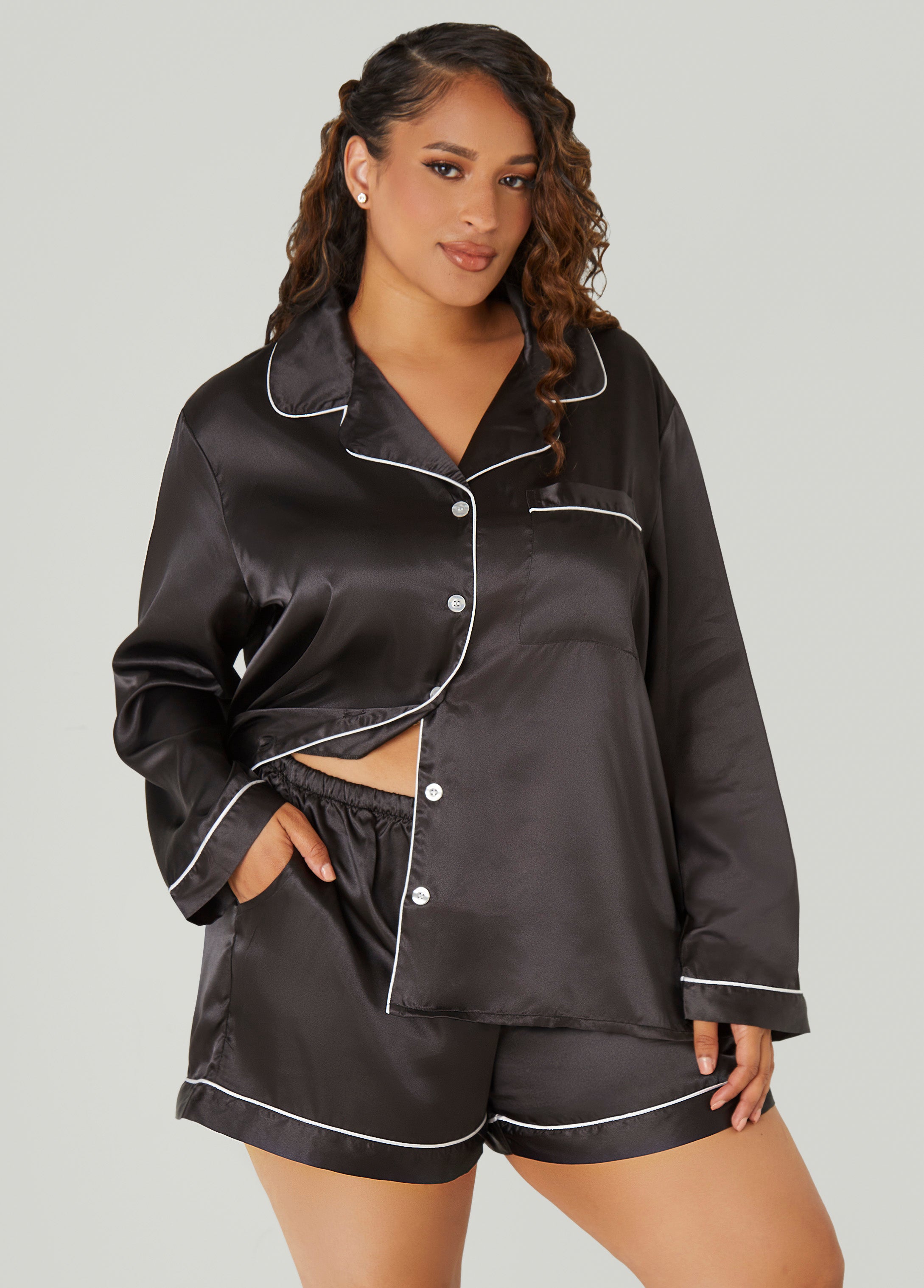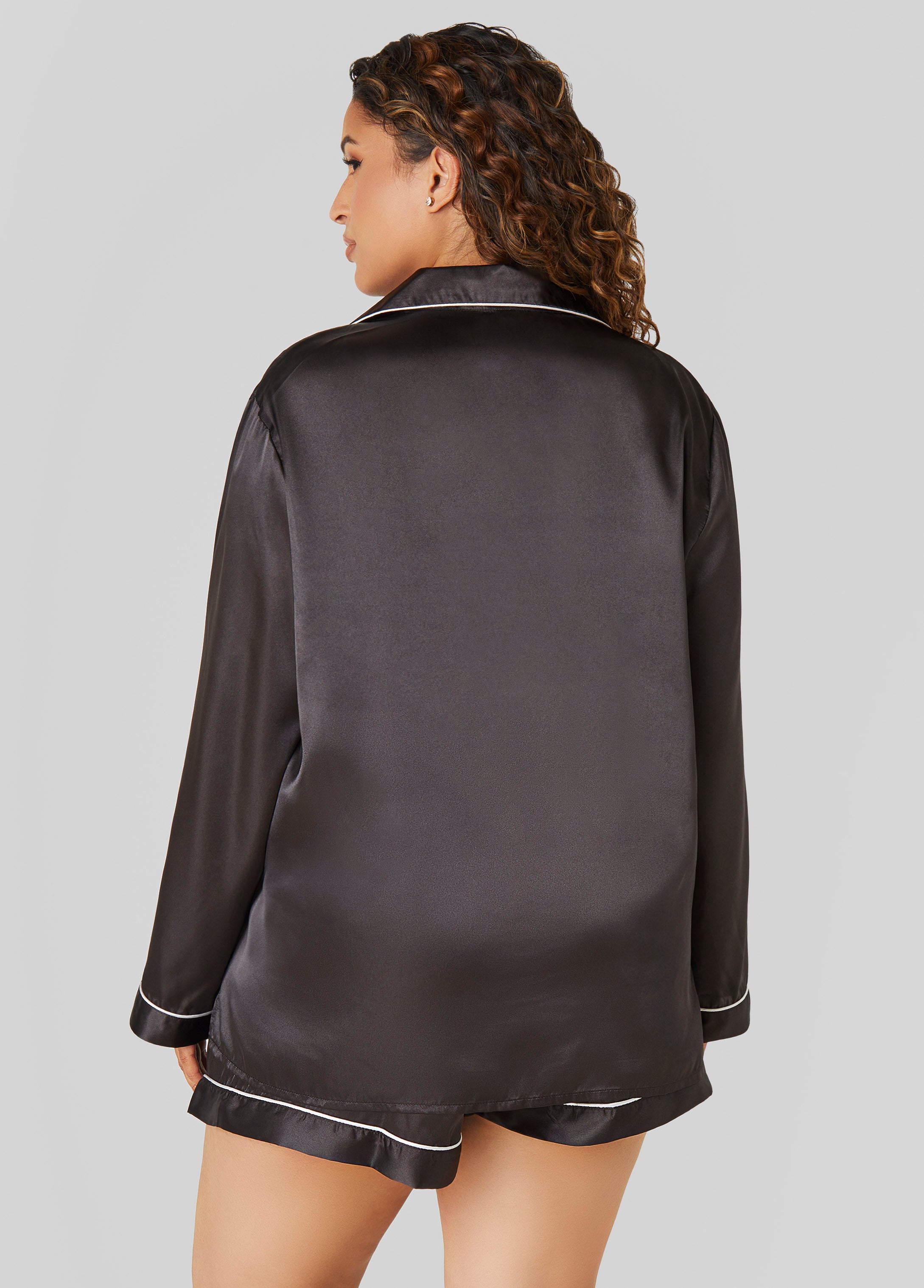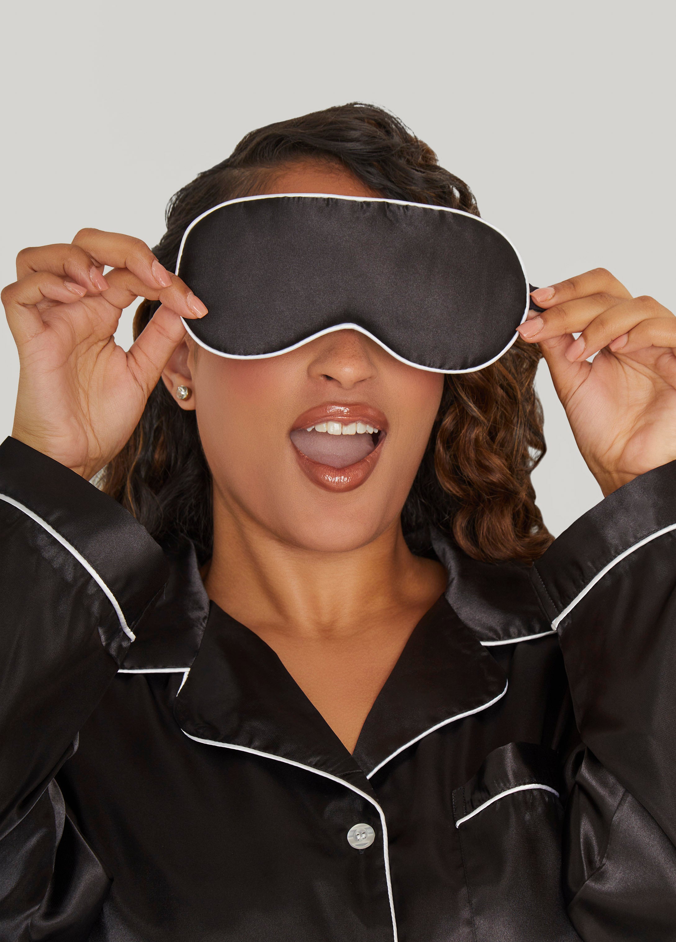 Keeping it cute even at bedtime is a must so we make it easy with this satin set that comes with a button-up shirt and patch pocket for just-in-case moments, matching drawstring shorts that slip right on and a silky eye mask to top it all off for a perfectly chic slumber.