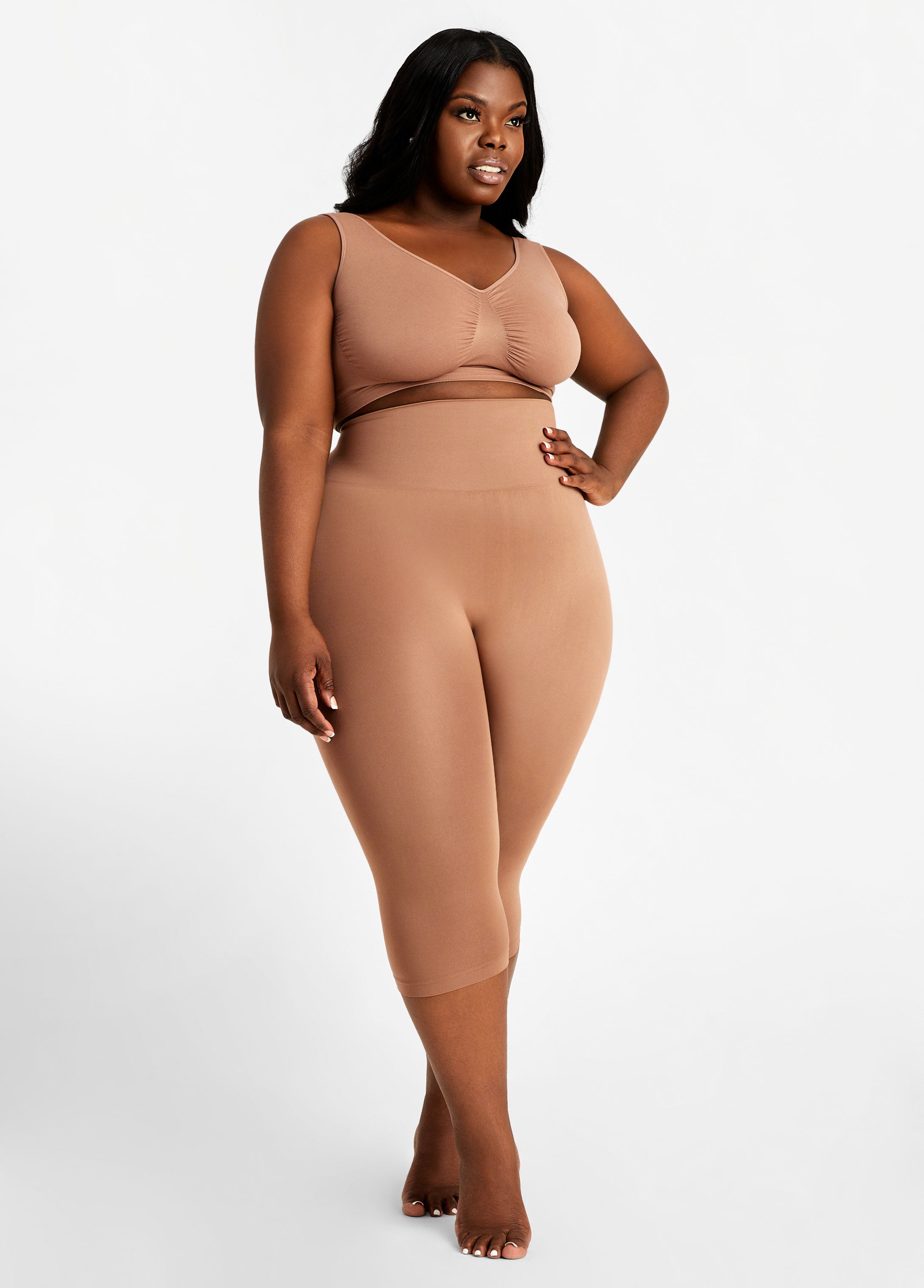 Our full coverage shaper capri smooths sides and thighs with medium support control for fluid movement while targeting the stomach for a defined hour glass figure.
