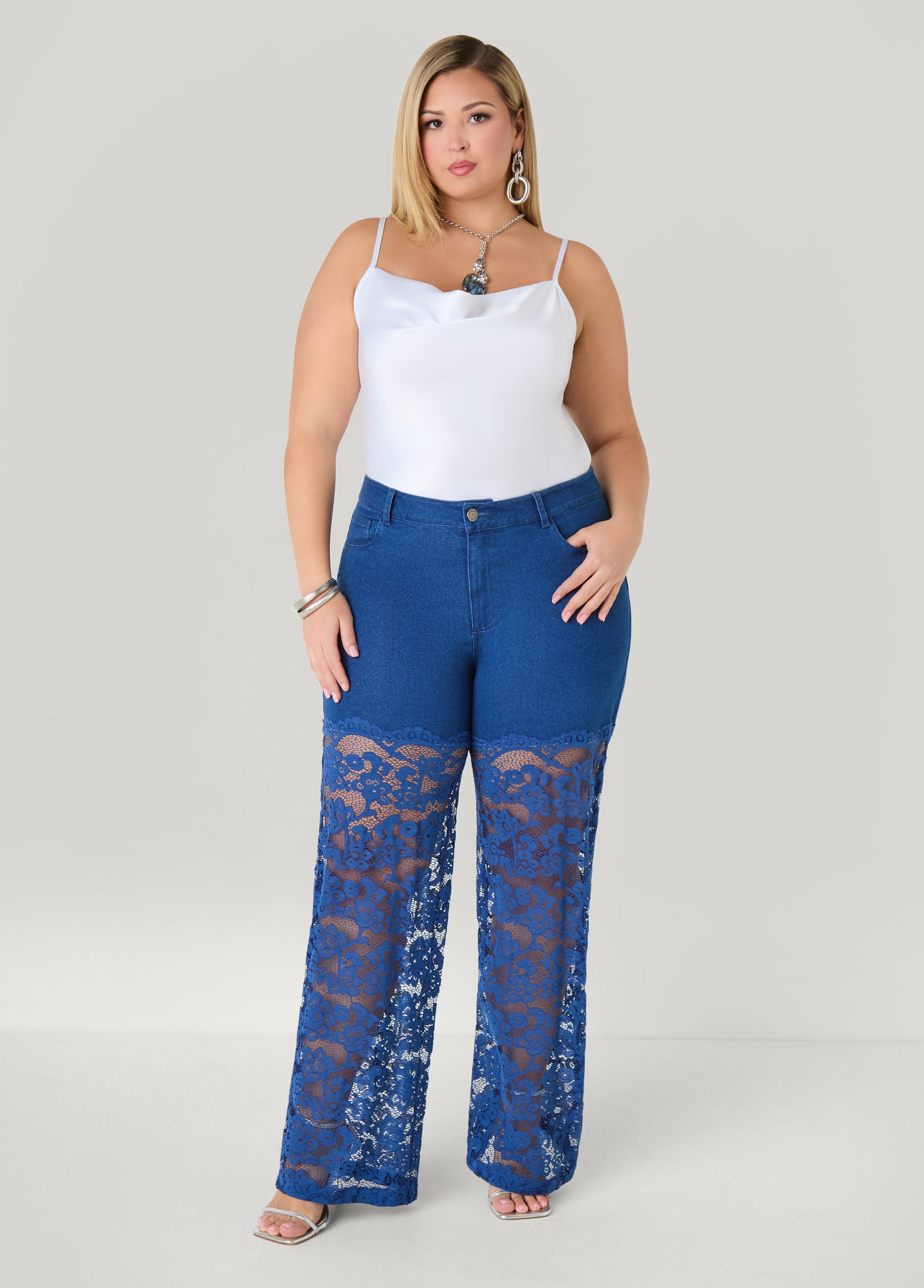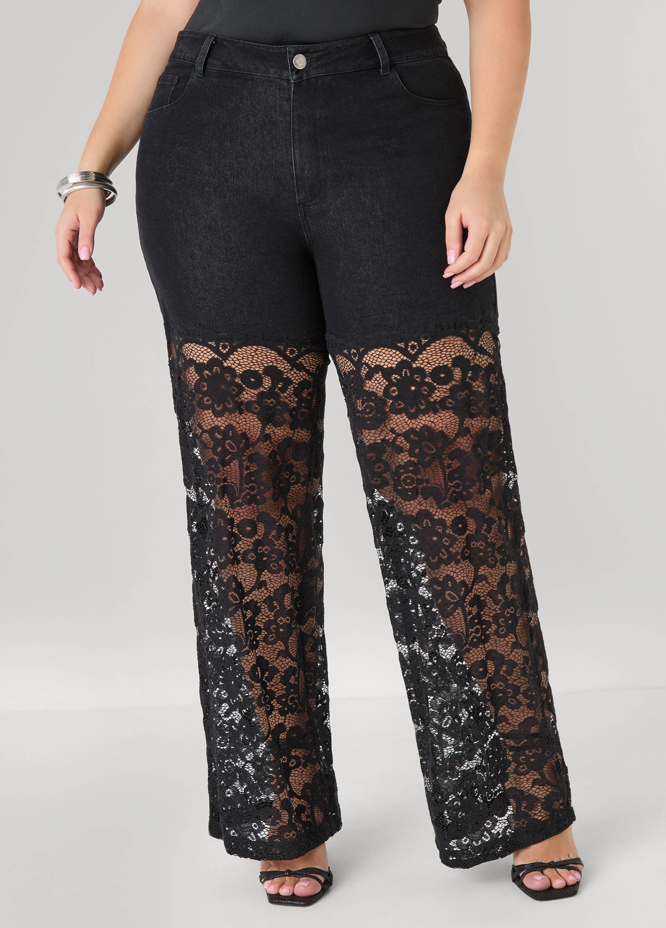 Sky-high waist meets wide-leg freedom, detailed with corded lace panels that are sheer & sexy. Pair with a fitted top to let the jeans do the talking.
