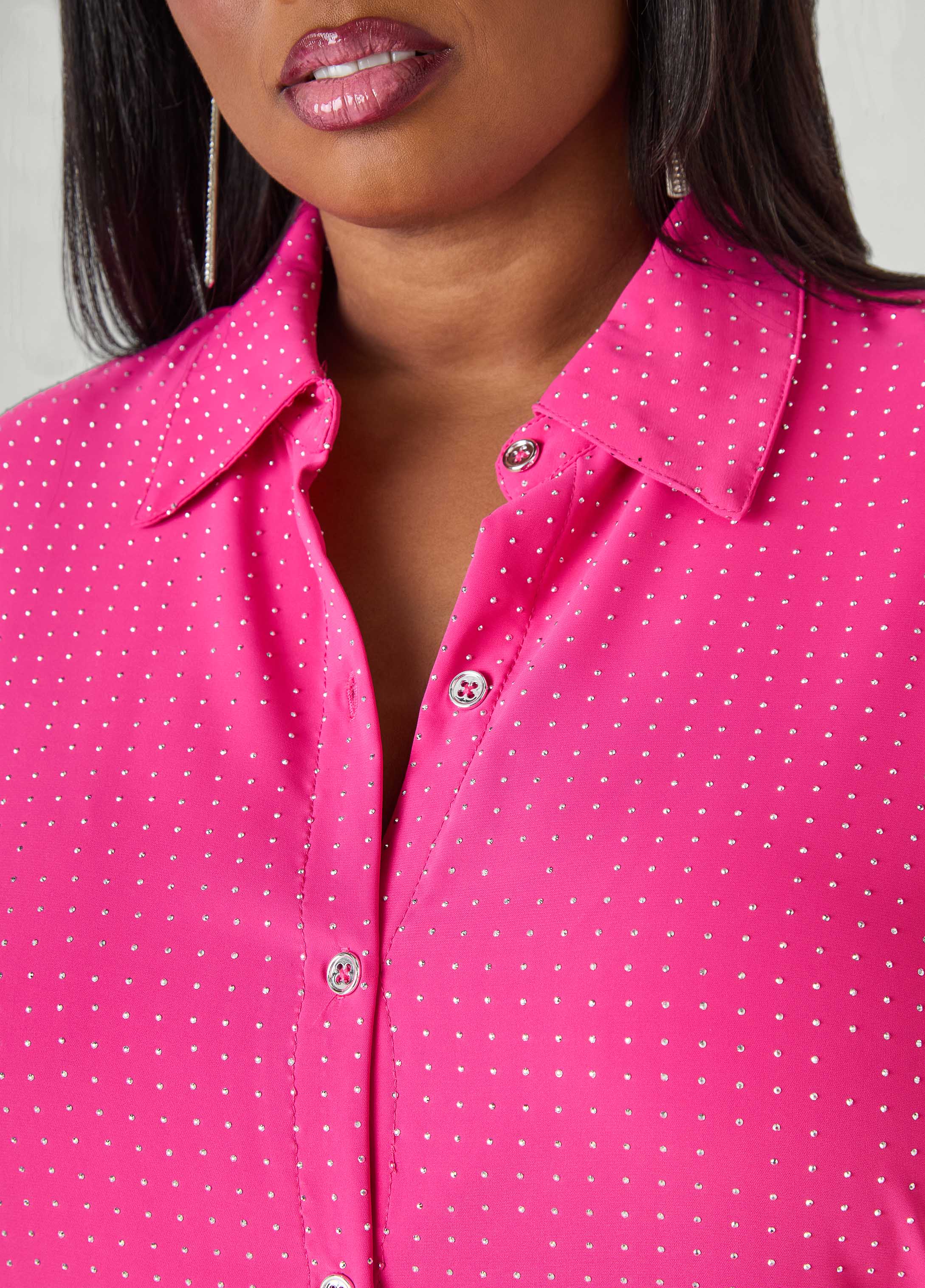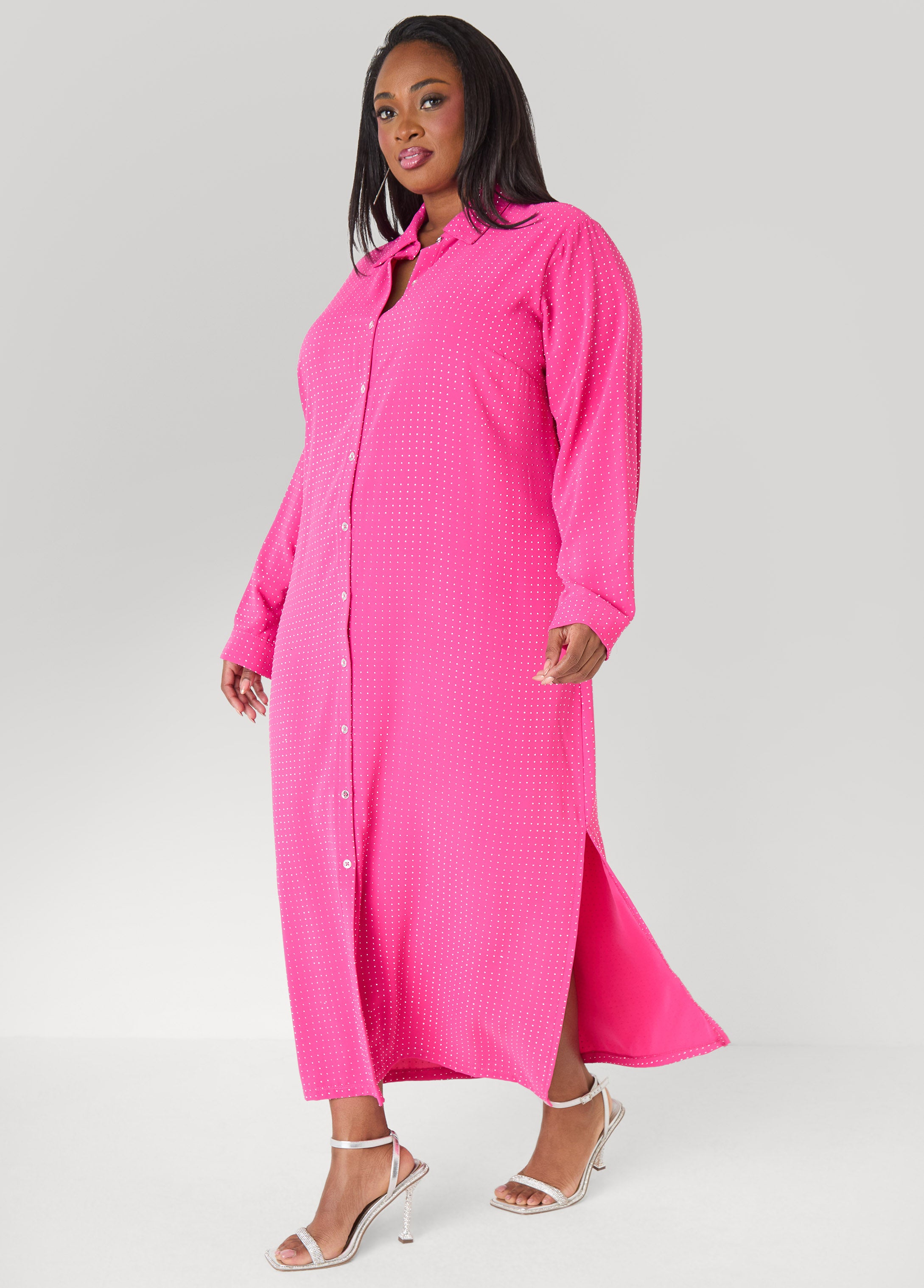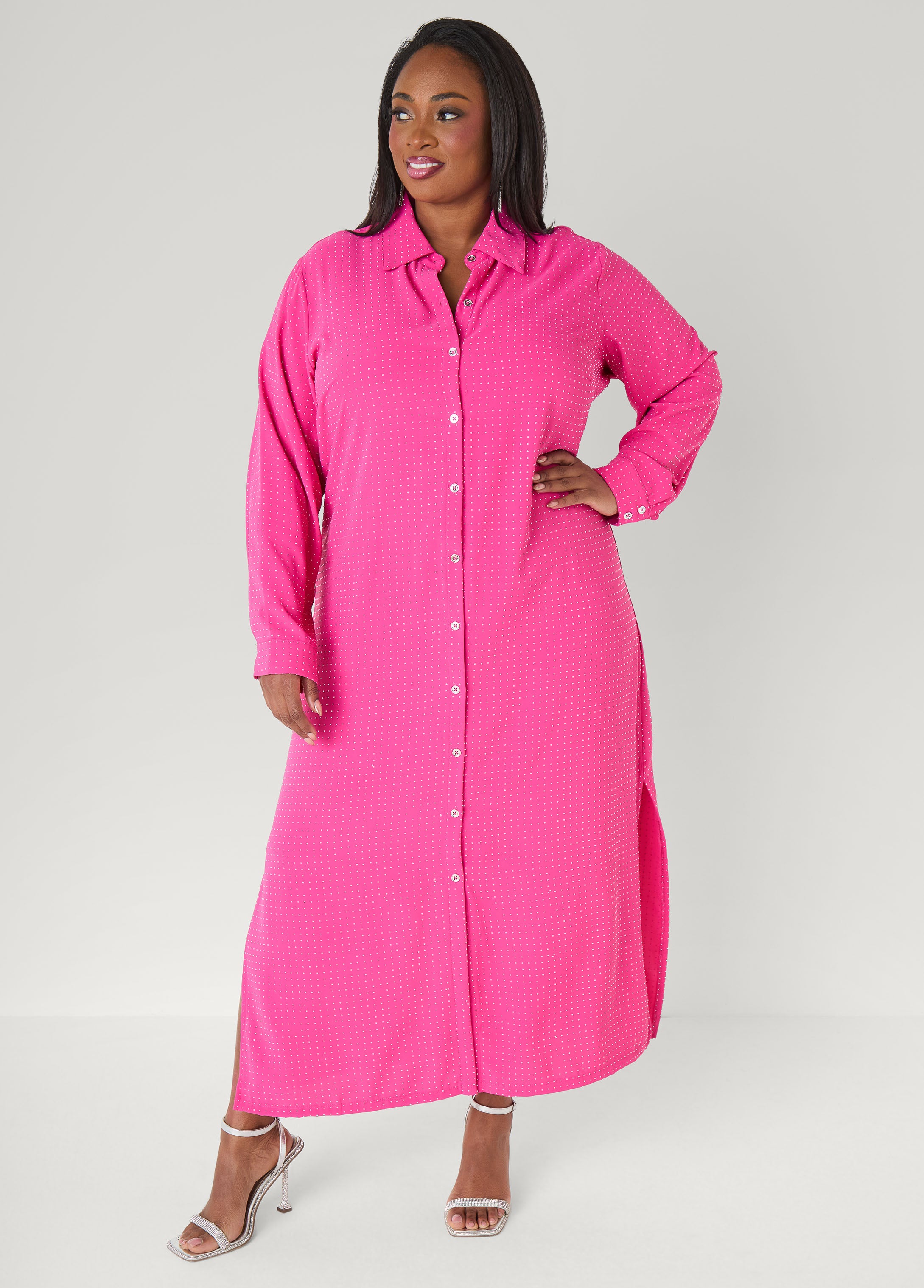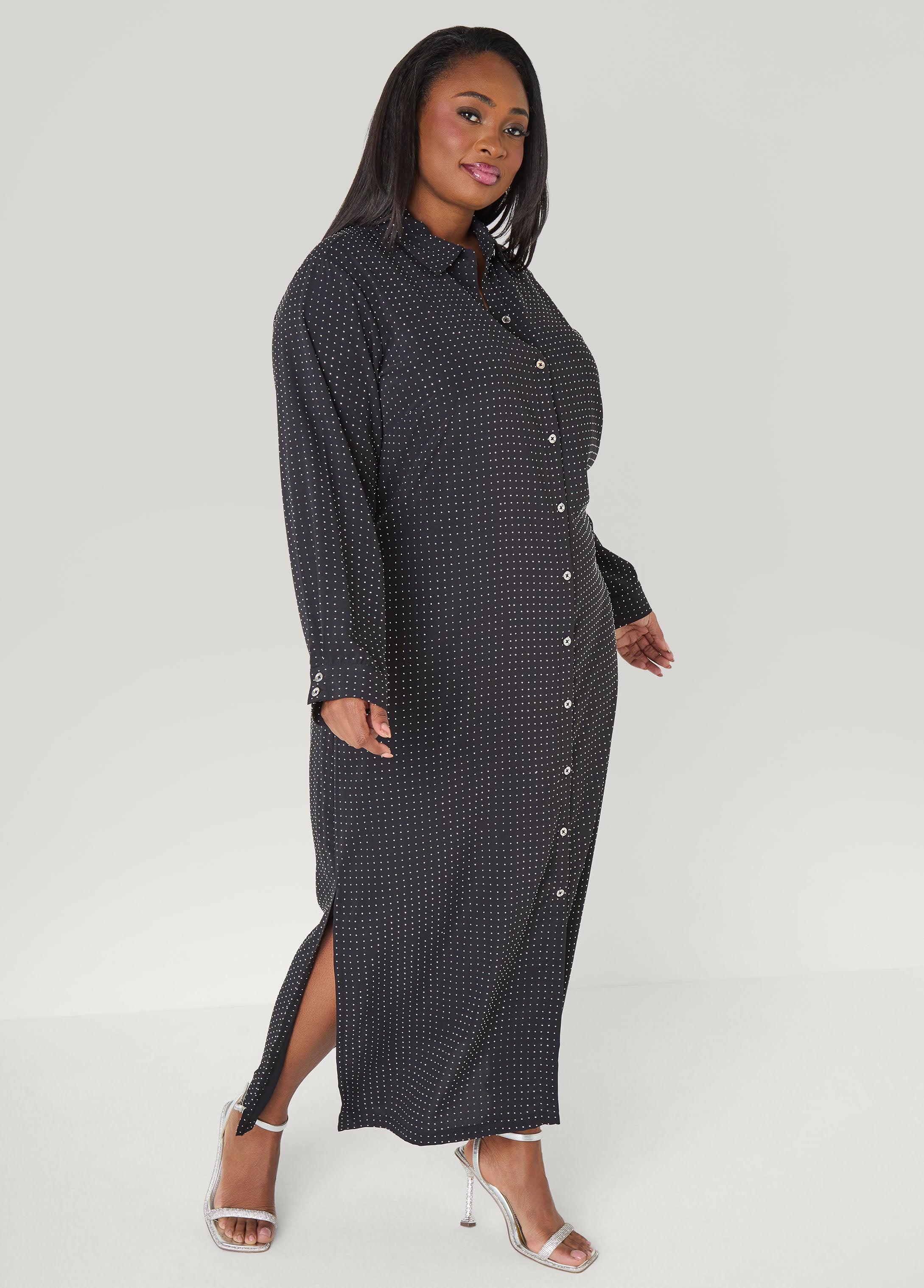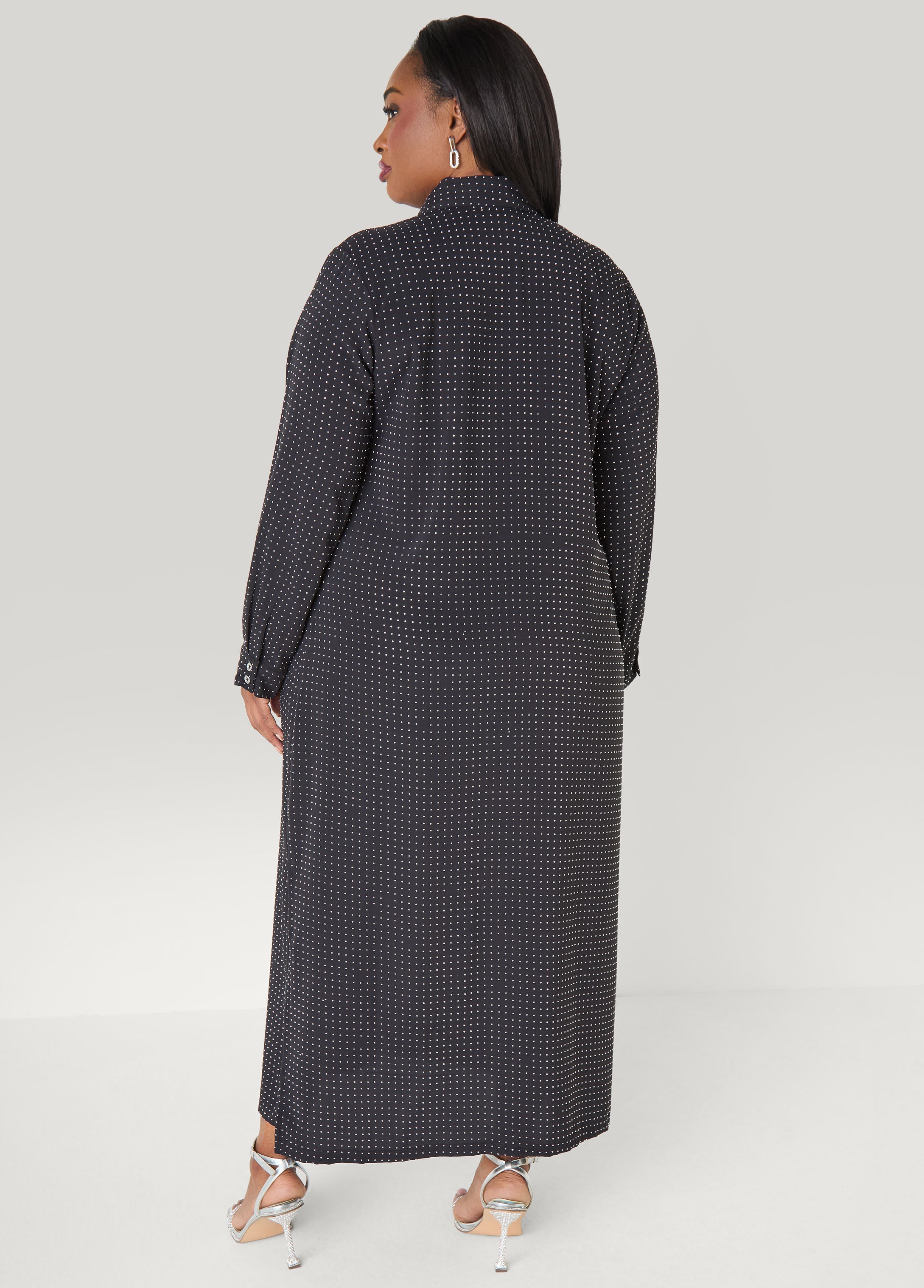 Softly woven and sprinkled with studs, this maxi shirtdress drapes with effortless charm. Buttoned through the front, it flows with a gentle grace that carries you from sunlit strolls to evening fun.