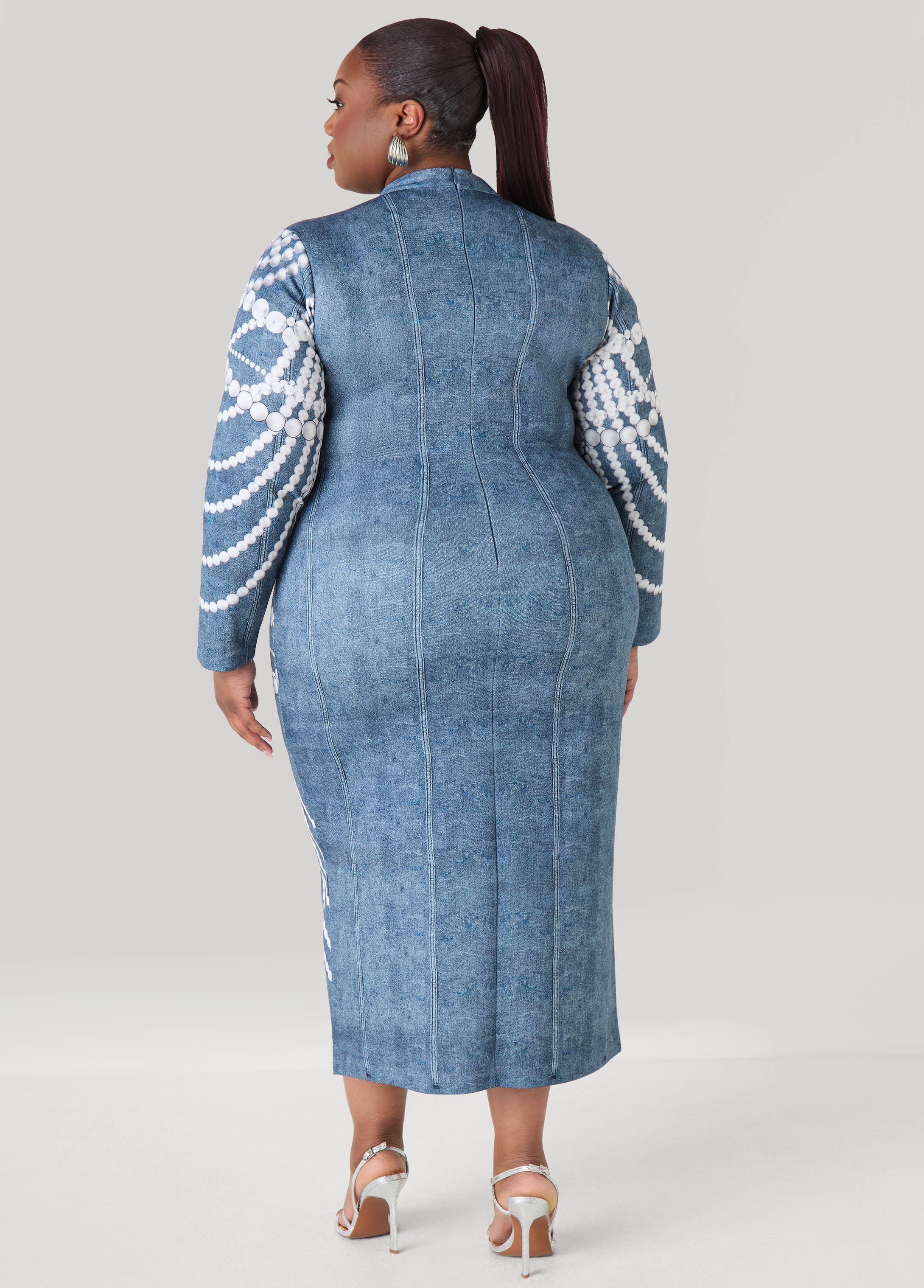 We can't give you diamonds & pearls but hopefully a hot-fire bodycon dress will suit your high fashion taste. This sexy stretch-knit dress is imprinted with a diamonds, pearls & denim design—a clever reworking of a classic denim dress.