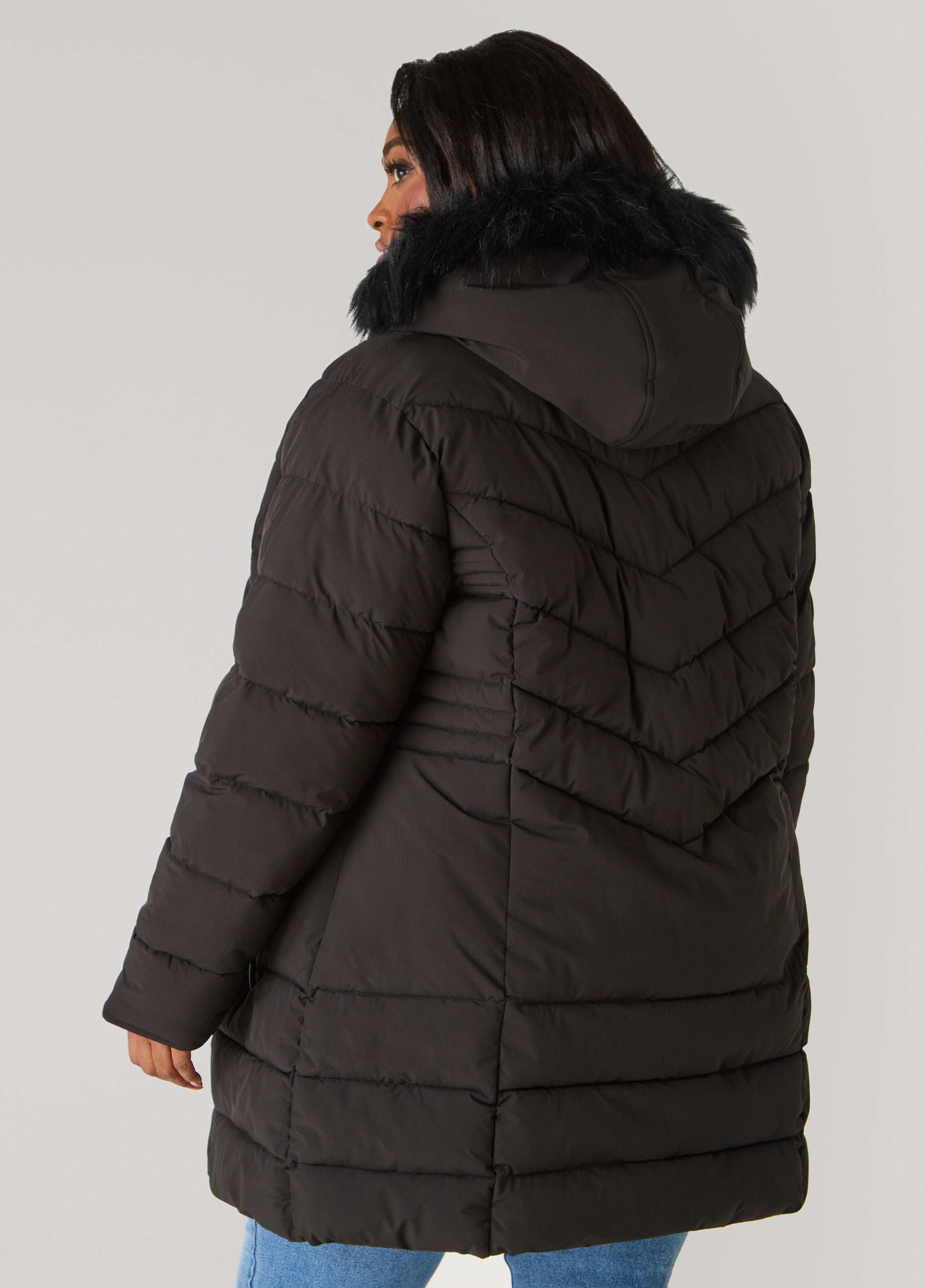 • Quilted puffer coat with hood, faux fur and faux leather trims and two welt pockets at sides. Fully lined in fleece and woven fabric. Zip fastening through front. Length: 38in.